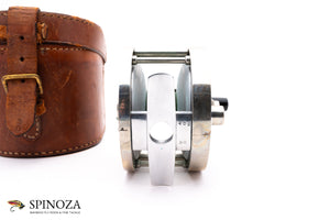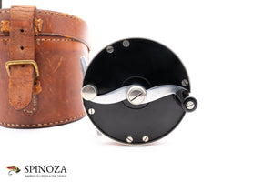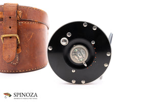 A very nice Otto Zwarg Model 400 Laurentian salmon fly reel in 3/0 size. RHW. 3 5/8" diameter with a 1 7/16" spool width. The reel weighs 14.5 ounces on my scale. This reel is in superb original condition with only very light cosmetic wear here and there. There is some residue on the inside of the spool and a tiny bit of tarnish in a few spots on the rims, but that's about it. The sideplates are clean (including the red lacquer indicator dots) and the foot is full length and unmolested. The screw heads are all in terrific shape. "400", "3/0" and the serial number "K71" are all stamped into the reel foot. 2:1 multiplier retrieve and a seven position drag adjuster. St. Petersburg model. As head of reel making for Vom Hofe, Zwarg worked with the world class fisherman who followed him when he was granted the right to make the Vom Hofe style reels under his own name. Despite what should be a popular and highly versatile size, I've come across relatively few of these 400's in 3/0 size. Given the nice size of this model and the power of the Zwarg drag (which was beefier than Vom Hofes) this is a reel that makes the jump very nicely to modern fishing and should fish very well for someone looking to put a classic on their mid-sized spey setup. You certainly won't find many in this kind of superb original condition. The reel comes in what I suspect was the original leather case (the numbers "30" are stamped on the strap, likely indicating the reel size) and is in generally good shape overall except for the small strap on the front of the lid and which helps hold the main strap down, which is broken. A fine example of this model.