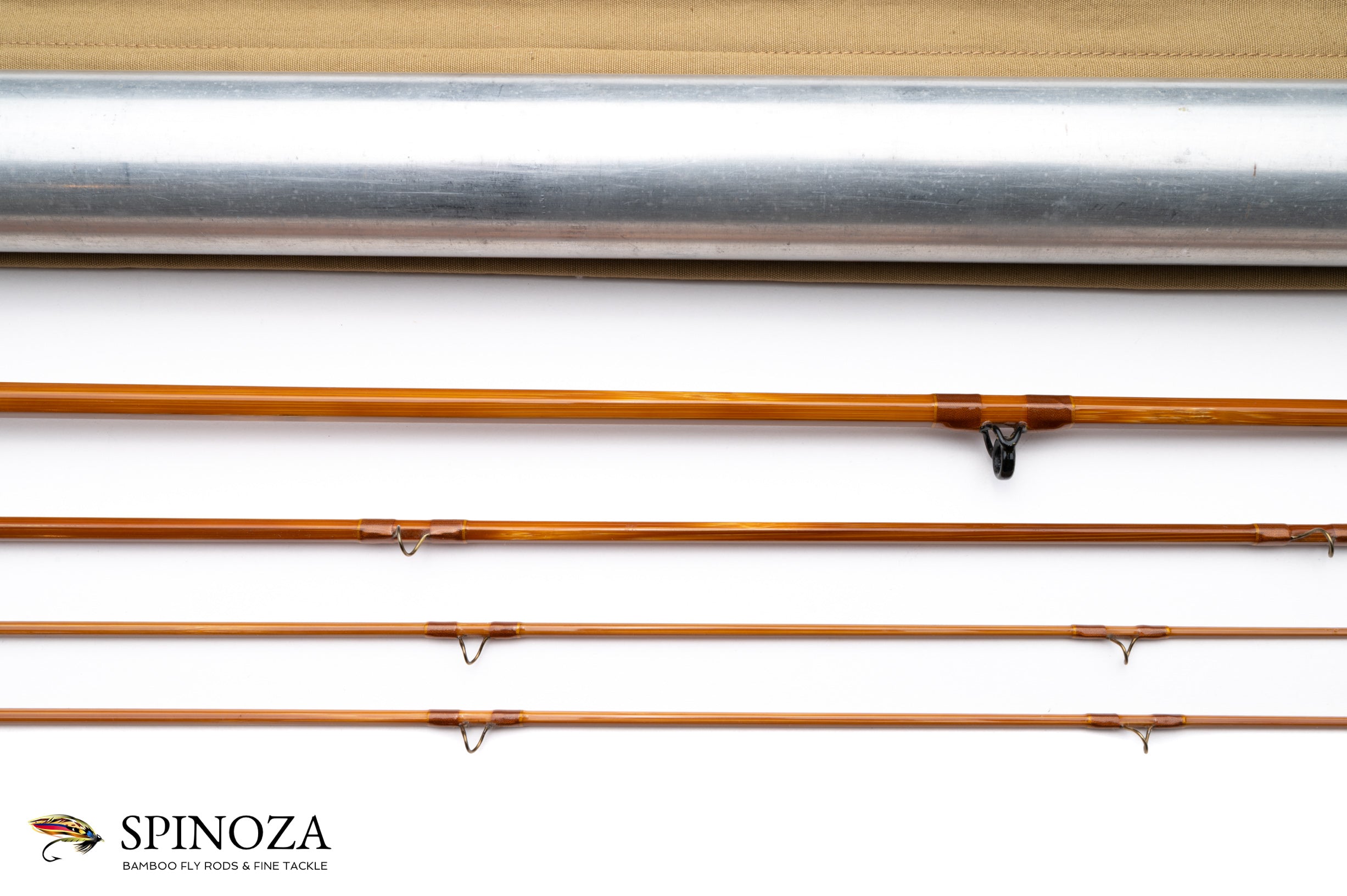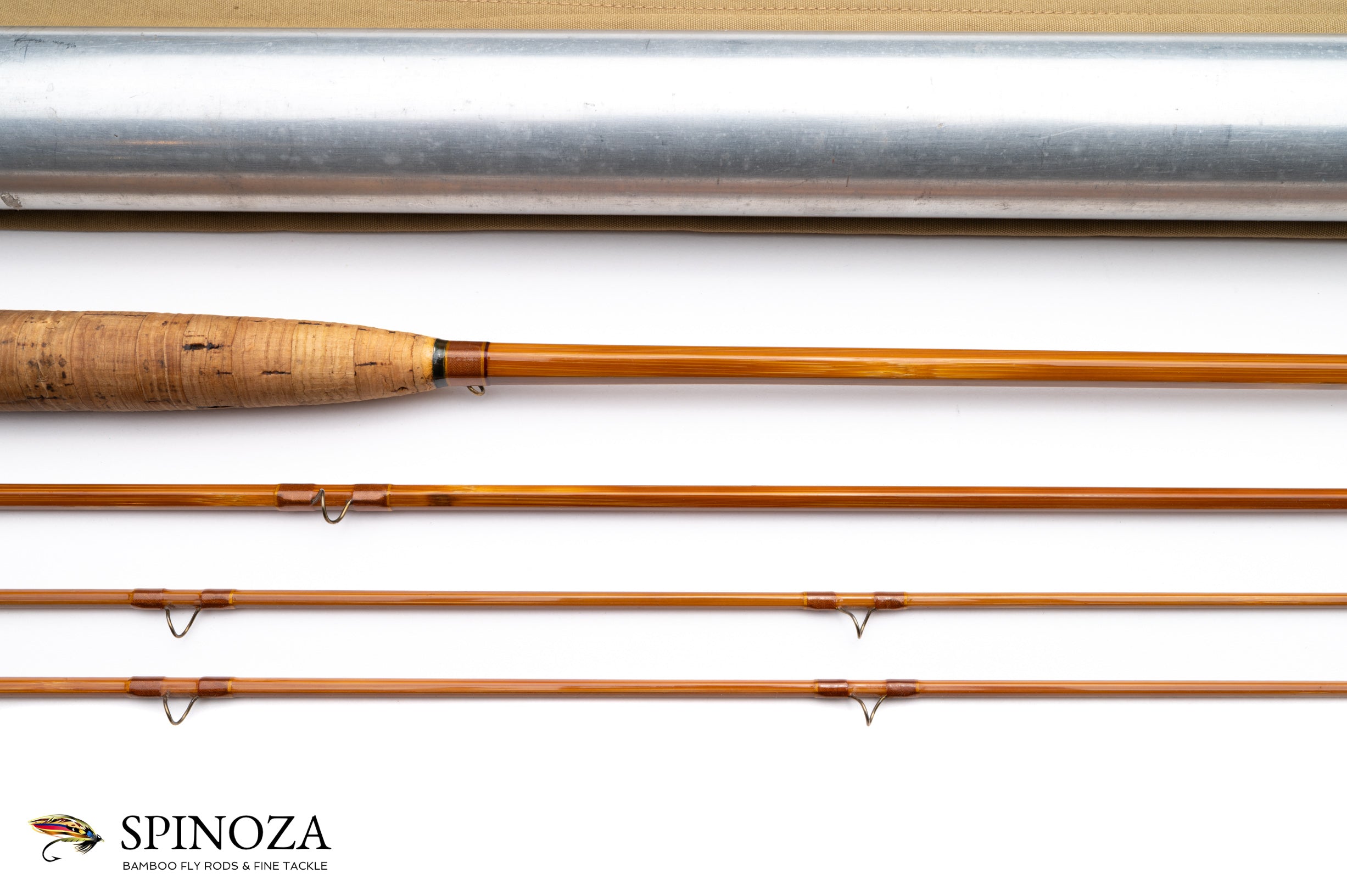 An EF Payne Model 200L bamboo fly rod, 8', 3-piece, 2-tip, and built for a #3 or #4. Slower action. Weighs 3.6 ounces on my scale. Recently refinished with a wrap color slightly lighter than the original and the stripping guide doesn't match what the original would have had. Fresh bronze guides and the first hint of cosmetic casting cracks at the ferrule wraps. The ferrules are oxidized and the fit is tight. Very good varnish job. The grip is 5" long and shaped to a slim cigar profile, and it has a bit of ridging from a prior cleaning. The seat has an oxidized cap and ring over what looks like a walnut spacer. The cap has the later die stamp "Payne" in a cartouche and a "Reg Us Pat Off" underneath. No hang tag with the olive color poplin bag. The rod packs into the original tan cloth bag and original aluminum tube with brass fittings.