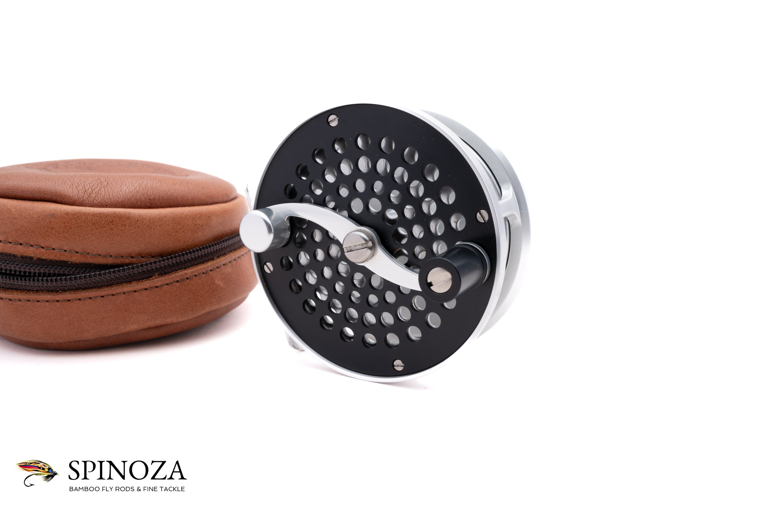 A nice little Peerless 2A fly reel, 3 1/4" diameter and set up for RHW. Excellent lightly used condition, bordering on near mint, with a tiny bit of wear on the frame edge in one spot and some mounting marks on the foot. Otherwise, the reel is very clean throughout and could not have been fished much. Clear anodized frame with black anodized sideplates. The maker and model name have been etched into the backplate which also features the drag adjuster. It weighs 5.3 ounces on my scale. This model is designed for #5 or #6 weight lines. It packs into the original leather zip pouch with the Peerless logo embossed on the top. A nice chance to get a classically-styled S-handle reel at a reasonable price.