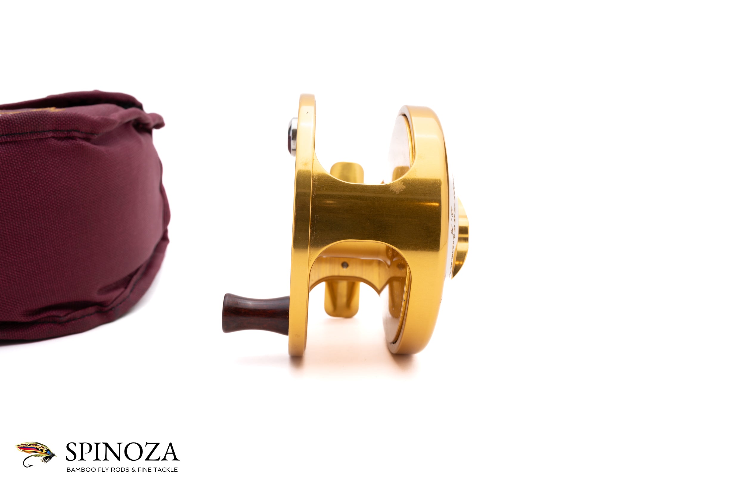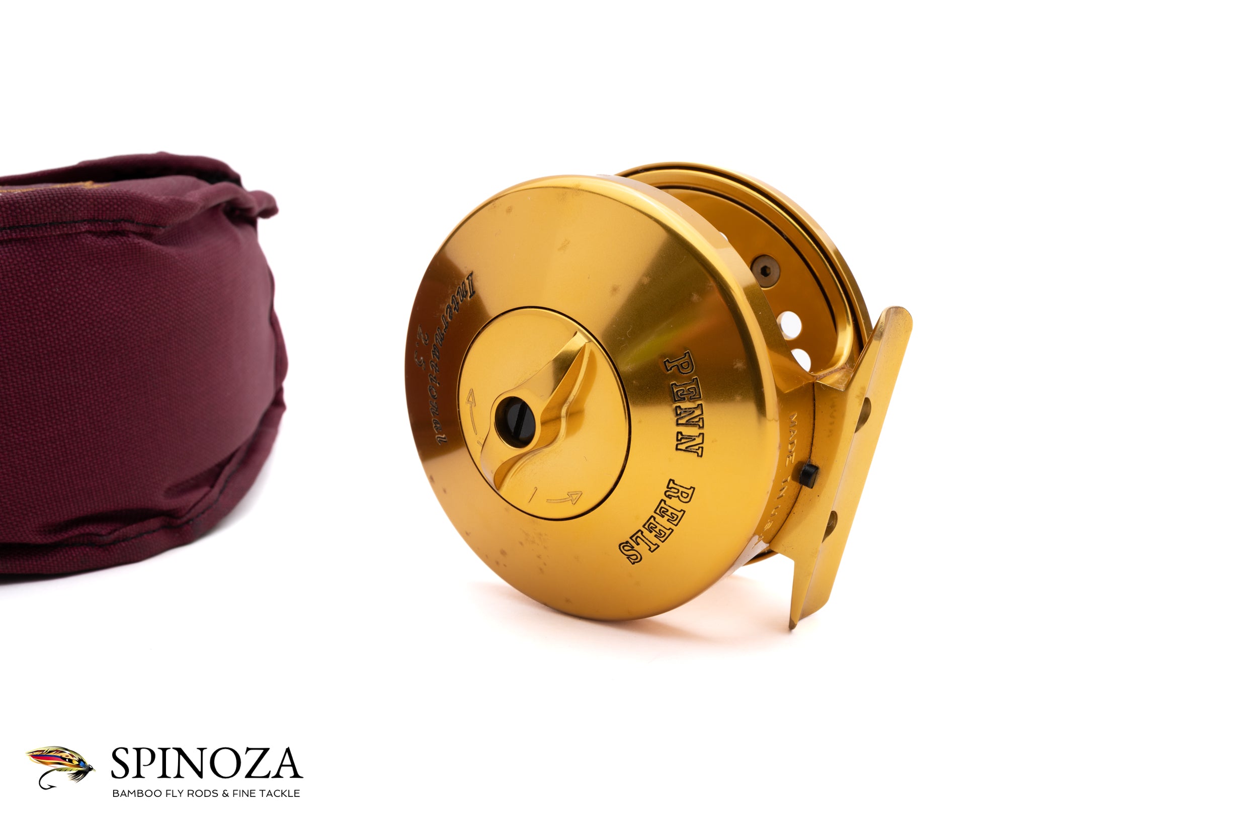 A Penn International 2.5 model fly reel, approximately 3 5/16ths diameter and set up for RHW. Direct drive. Mint unfished condition. Gold anodized frame and spool with the spool ported. The drag is adjusted via a dial on the backplate. Serial number C951048. Made in the USA. The reel weighs 9.9 ounces on my scale. It comes in its original pouch.
