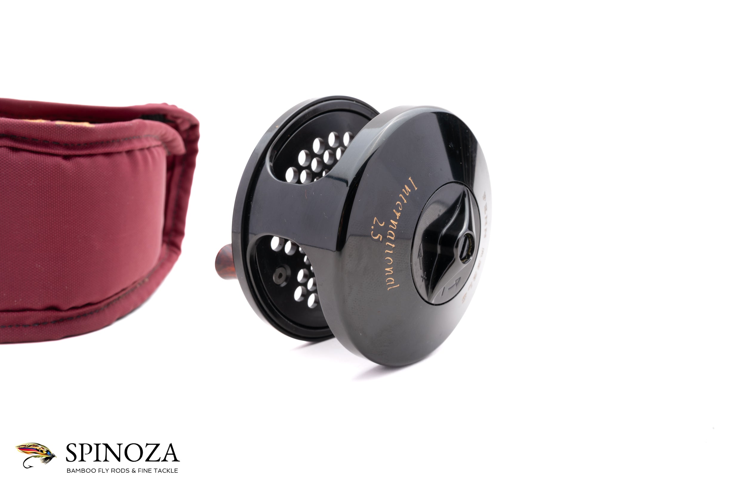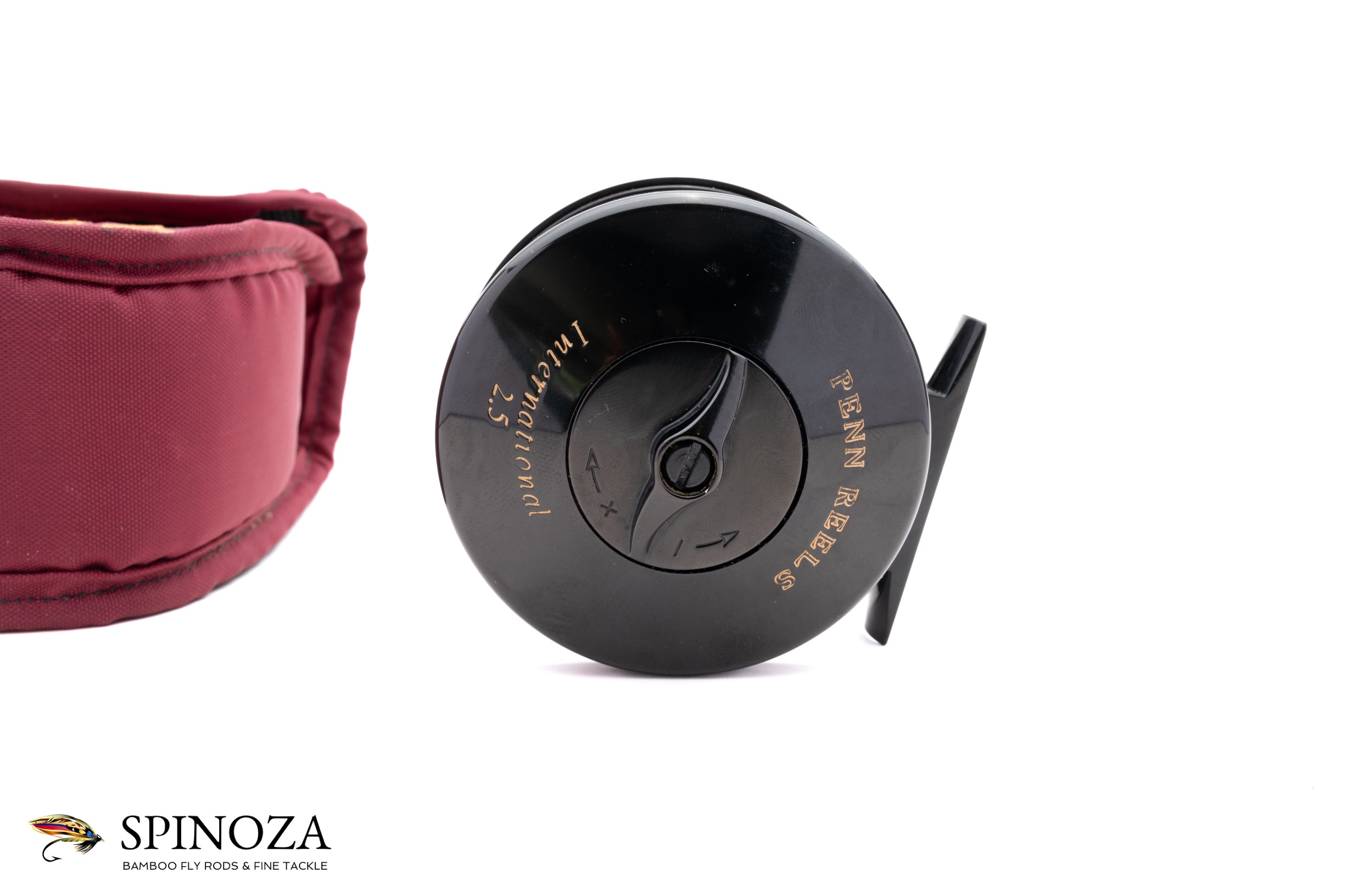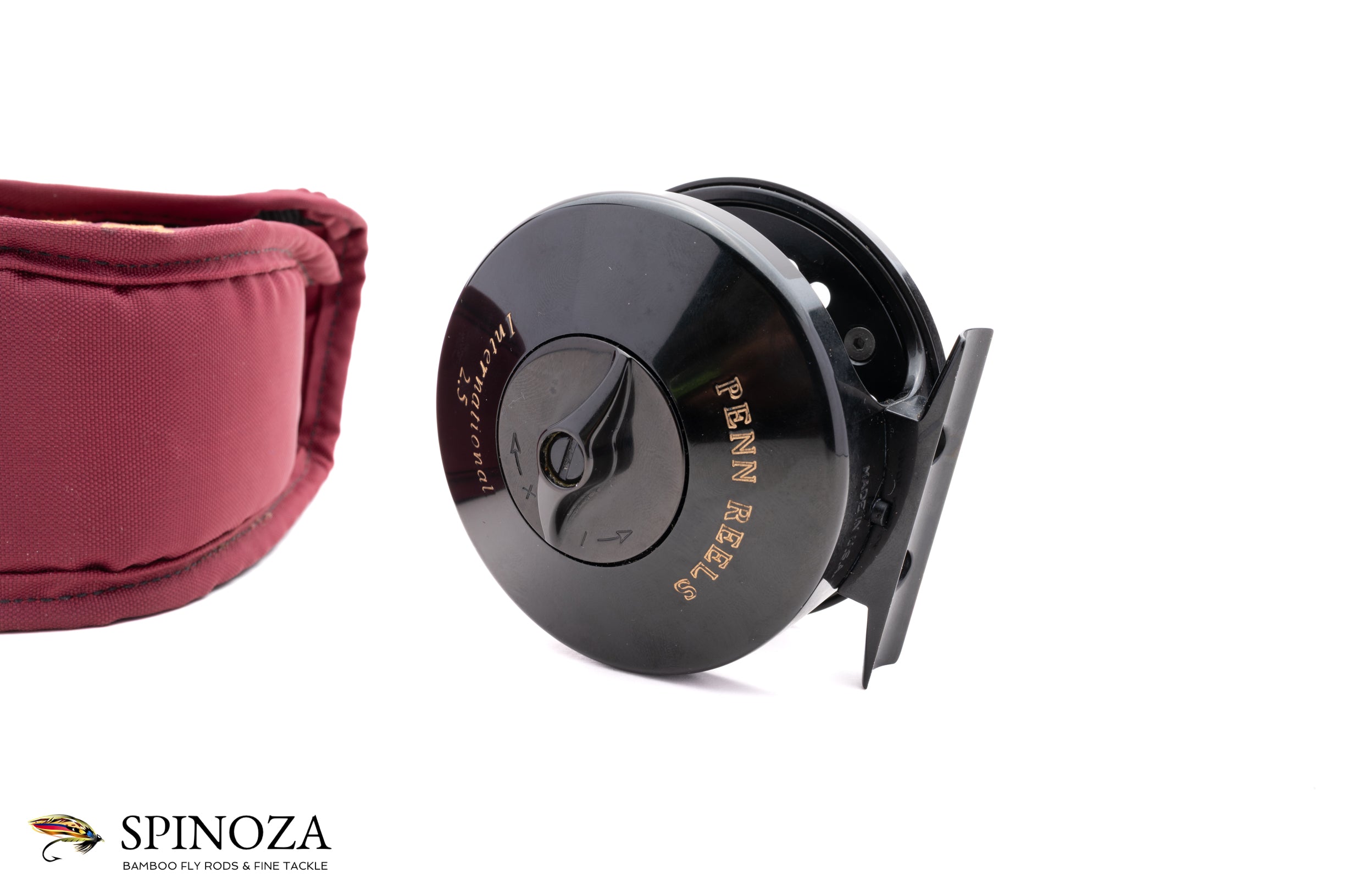 A Penn International 2.5 model fly reel, approximately 3 5/16ths diameter and set up for LHW. Direct drive. Near mint condition with just the tiniest trace of cosmetic wear here and there. It could not have been fished much. Black anodized frame and spool with the spool ported. The drag is adjusted via a dial on the backplate. Serial number H931549. Made in the USA. The reel weighs 9.8 ounces on my scale. It comes in its original pouch.