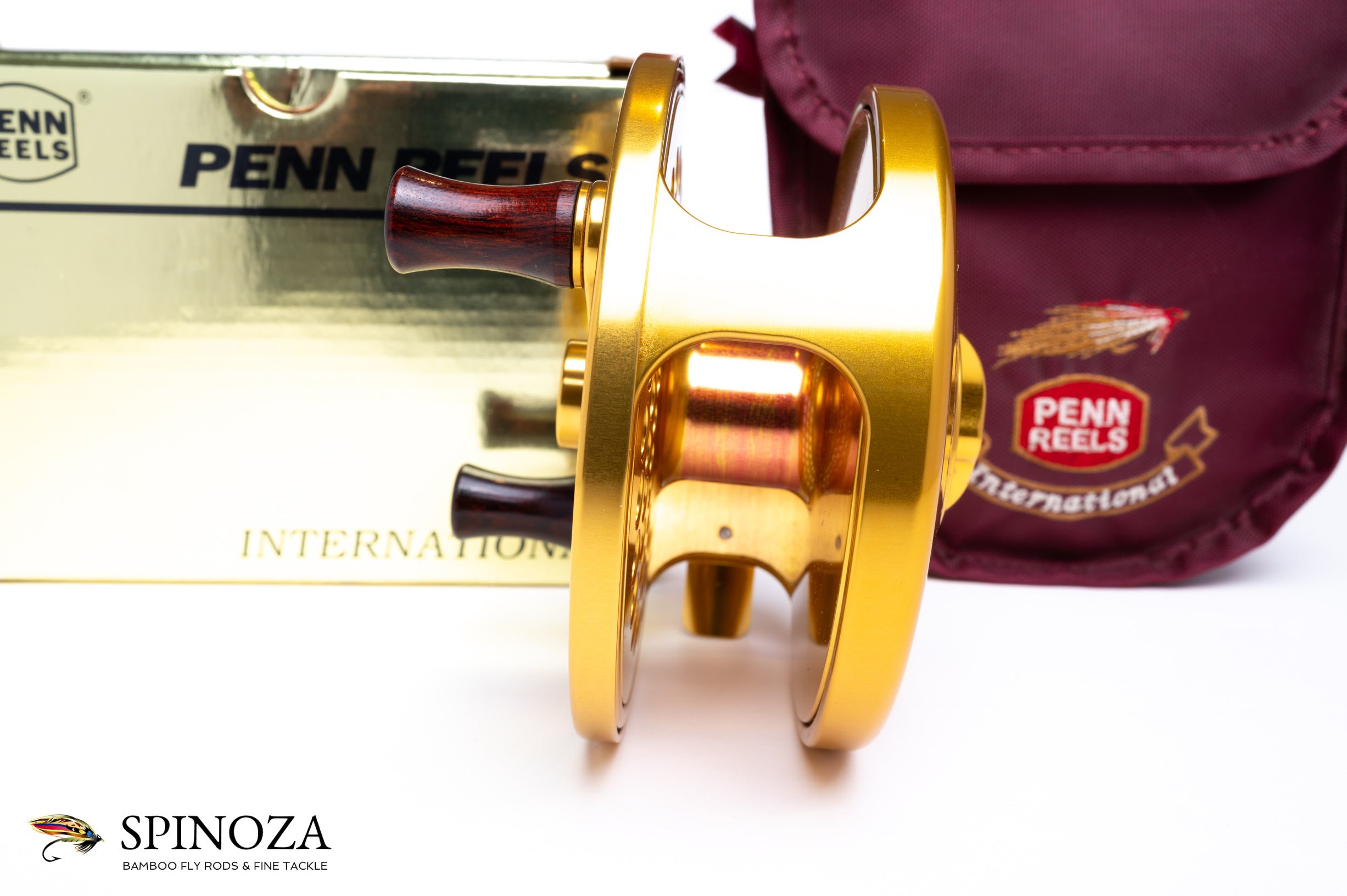 A Penn International 4G-AR model fly reel, set up for LHW. Anti-reverse design. Approximately 4 1/2" in diameter with a 1 1/8" spool width. The reel weighs 16.7 ounces on my scale. Gold anodized throughout with a disc drag that's adjusted via a dial on the backplate. Double handle crank. Mint condition. Serial #L970162 and made in the USA. The reel packs into the original pouch and box with paperwork.