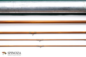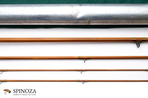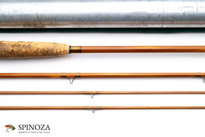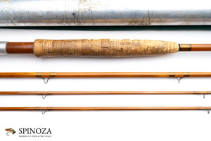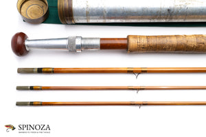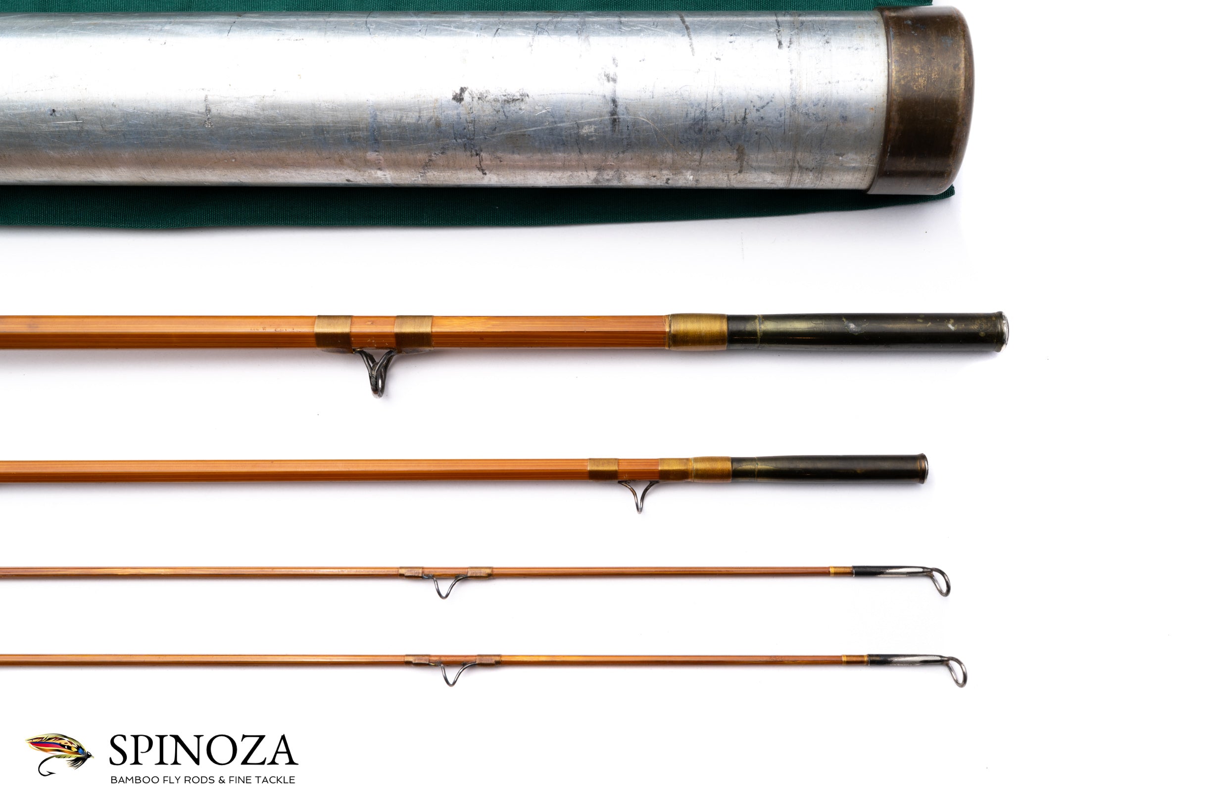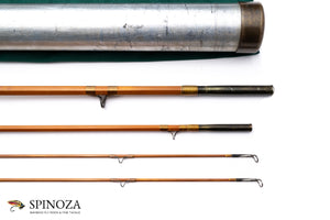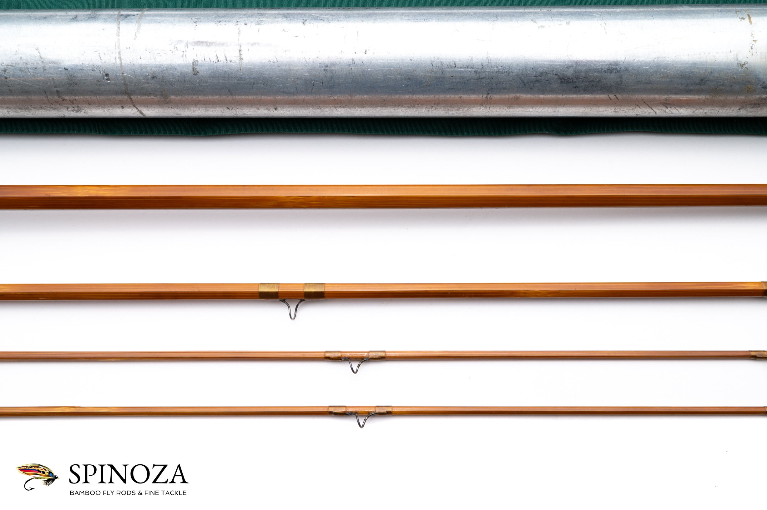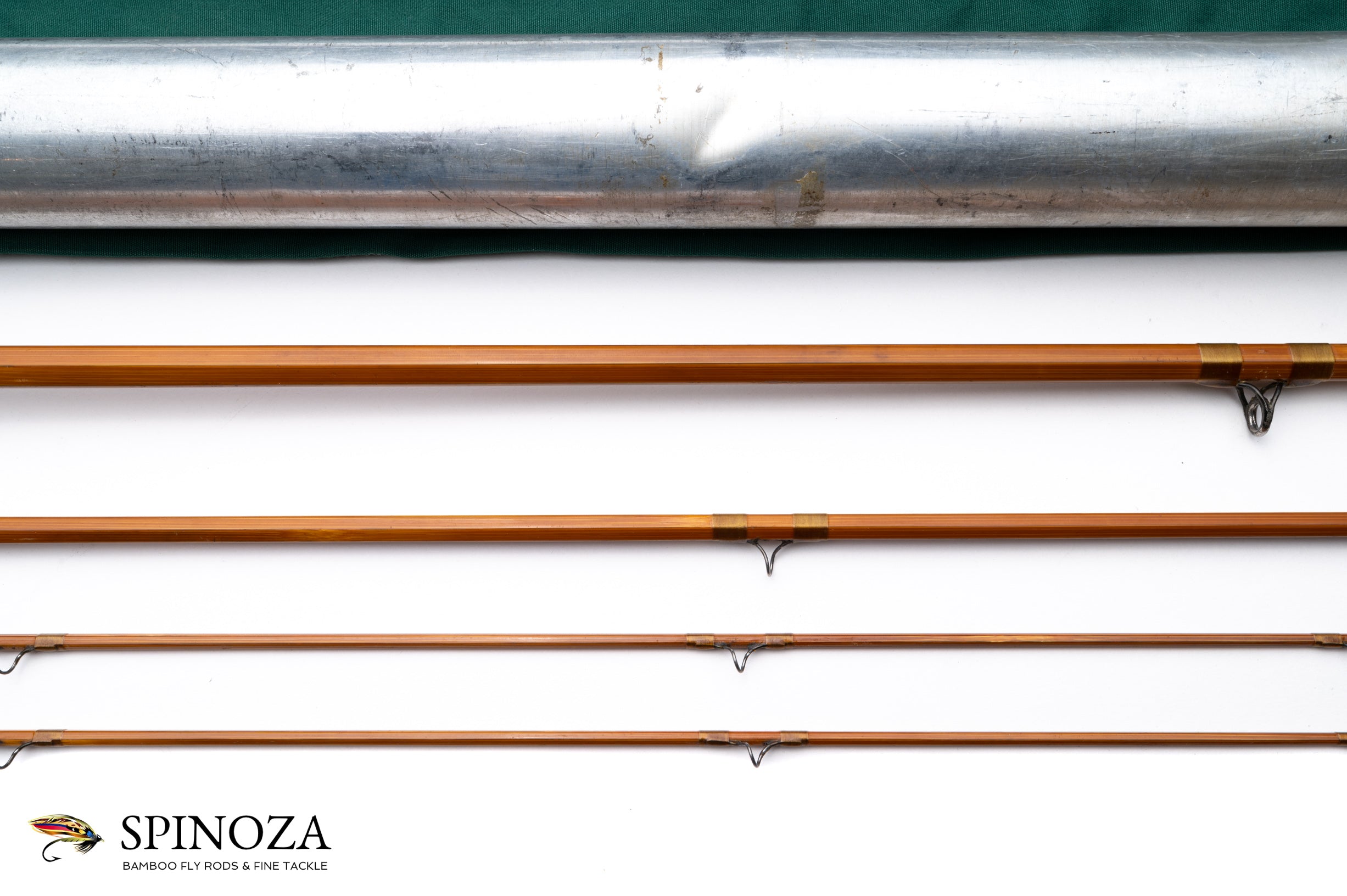 A HS "Pinky" Gillum bamboo salmon rod, 9'1", 3-piece, 2-tip, and built for what feels like a #8. Serial # 1-732. Fast DF action. Fair condition, with a small clear wrap below the bottom guide on one tip. The grip has some erosion, I suspect from storing the fly hook. There are some cracks to the ferrule wraps and the varnish overall is firm but has lots of scratches and scuffing. The snake guides have some noticeable flatting to the inner guides. Lastly, I also think the rod may have been purposefully cut down at one point, based on a somewhat unusual guide arrangement near the butt ferrule and because of some correspondence between the original owner and Pinky which references a cut down at the request of the owner (which I have seen but is not provided with the sale). The fixed fighting butt appears to have been added to replace the lost length. Light flame and oven tempered cane, with slightly lighter nodes done in a 2-opposed pattern. Light brown main wraps with black/yellow/black edges at the keeper and male ferrules. Perfection stripper. Black high arch H.S.S. snakes. Oxidized Super Z females and the fits are good. The grip is 7 1/2" long and shaped to a western profile with a hidden pocket cap. The uplocking aluminum screw lock is stamped "H.S. Gillum, Maker", and the varnished spacer is mahogany with a bit of tiger striping. The added-on fixed fighting butt is 3" long with a large rubber button. The rod packs into a green bag with a pull tie, and the aluminum tube has a brass colored bottom and top, but no data stickers.