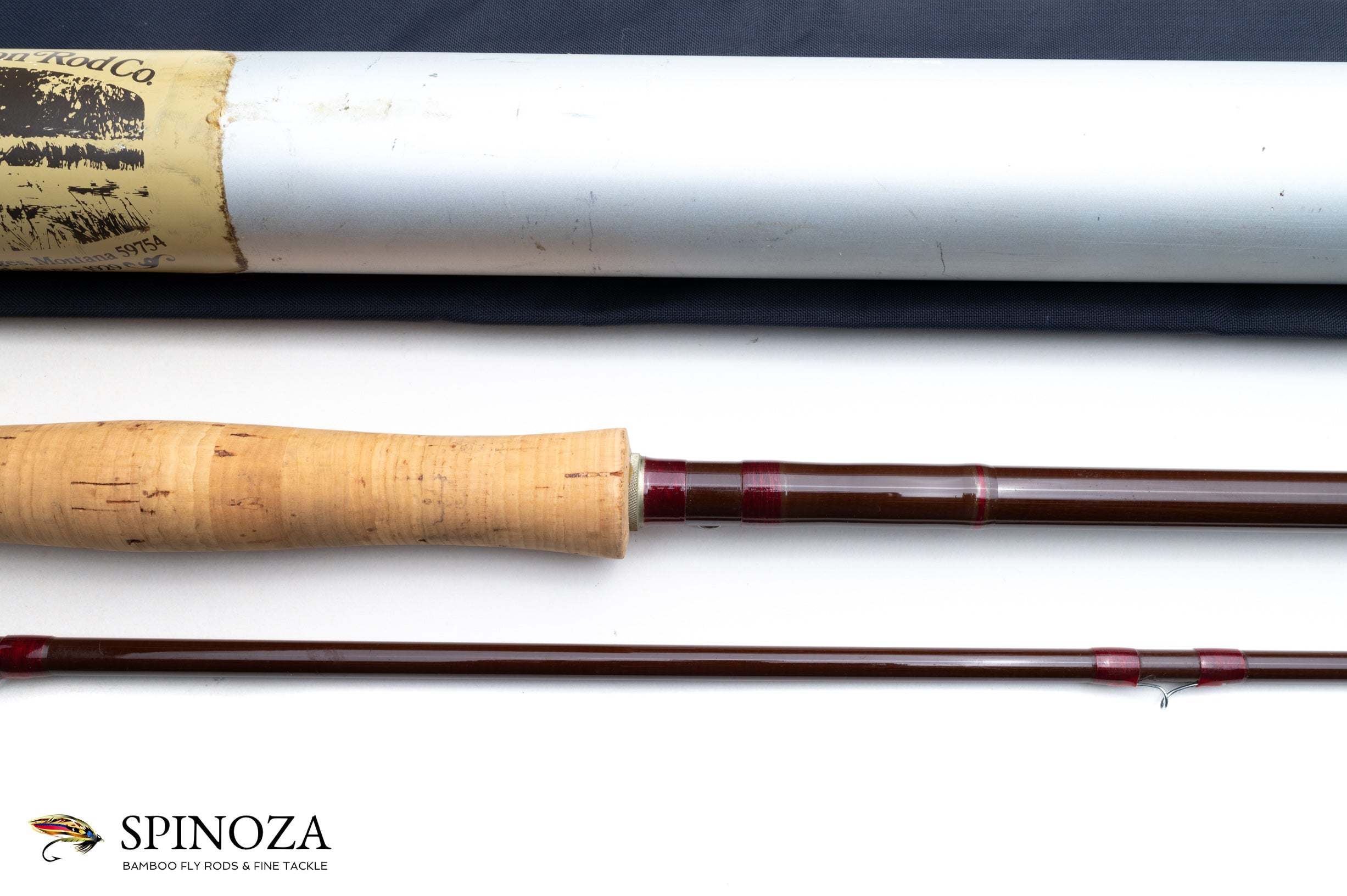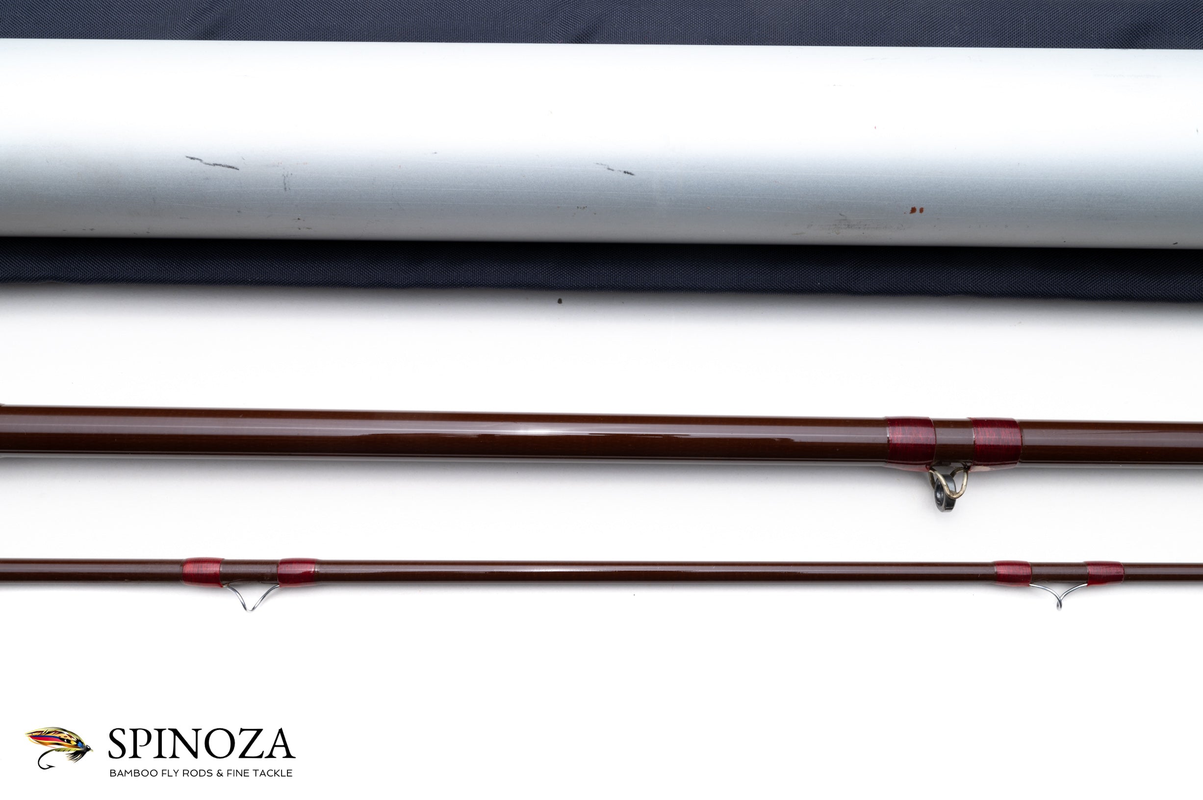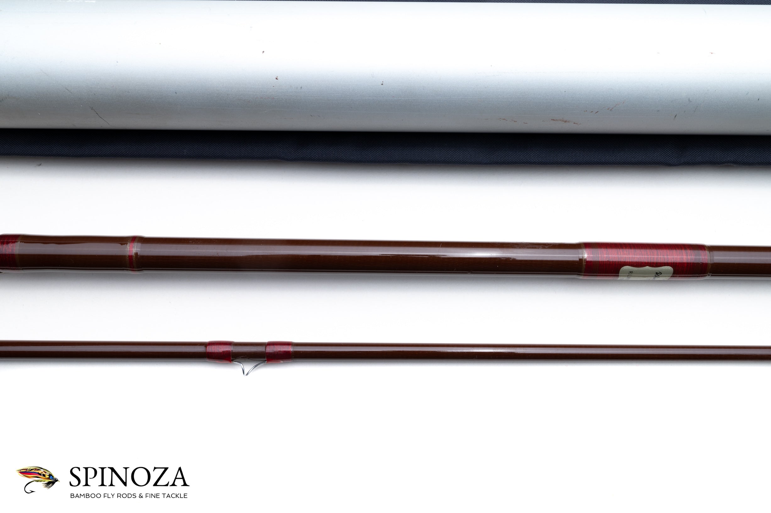 A Tom Morgan / RL Winston "Unity with the Universe" fiberglass rod, 8'6", 2-piece, 1-tip, and built for a #7 line. Serial number #1228. 4 ounces. Tom designed this rod when he was in San Francisco and nicknamed the rod "Unity with the Universe" because of its wonderful smooth casting qualities, and it remained one of his favorite rods that he ever designed. Excellent lightly used condition with a few cosmetic marks here and there but very nice overall. Maroon glass wrapped in red with the Winston Montana-era Champion Cup on the butt. Carbide stripper with chrome guides and tip top. 7" long grip shaped to a full wells profile. The seat is a downlocking aluminum screwlock over a varnished wood insert. The rod packs into a navy synthetic bag (there is a little bit of fraying at the top) with the SF-era label on it, and an aluminum tube with the Montana-era Winston sticker 95% intact. A nice one here for the Winston/Morgan fiberglass fan.