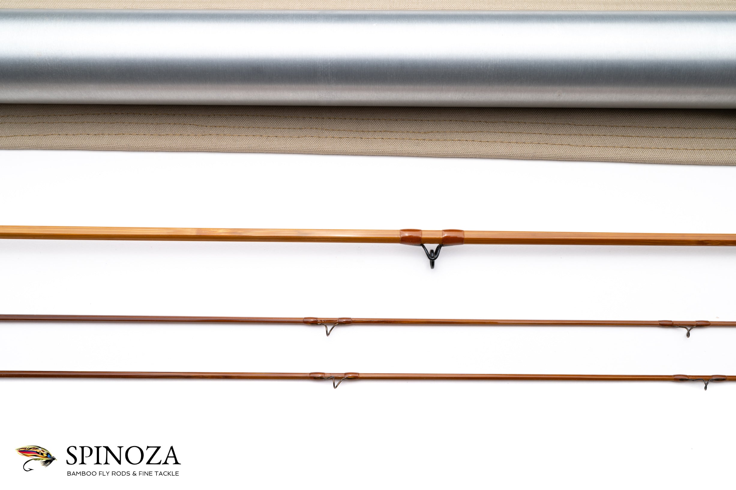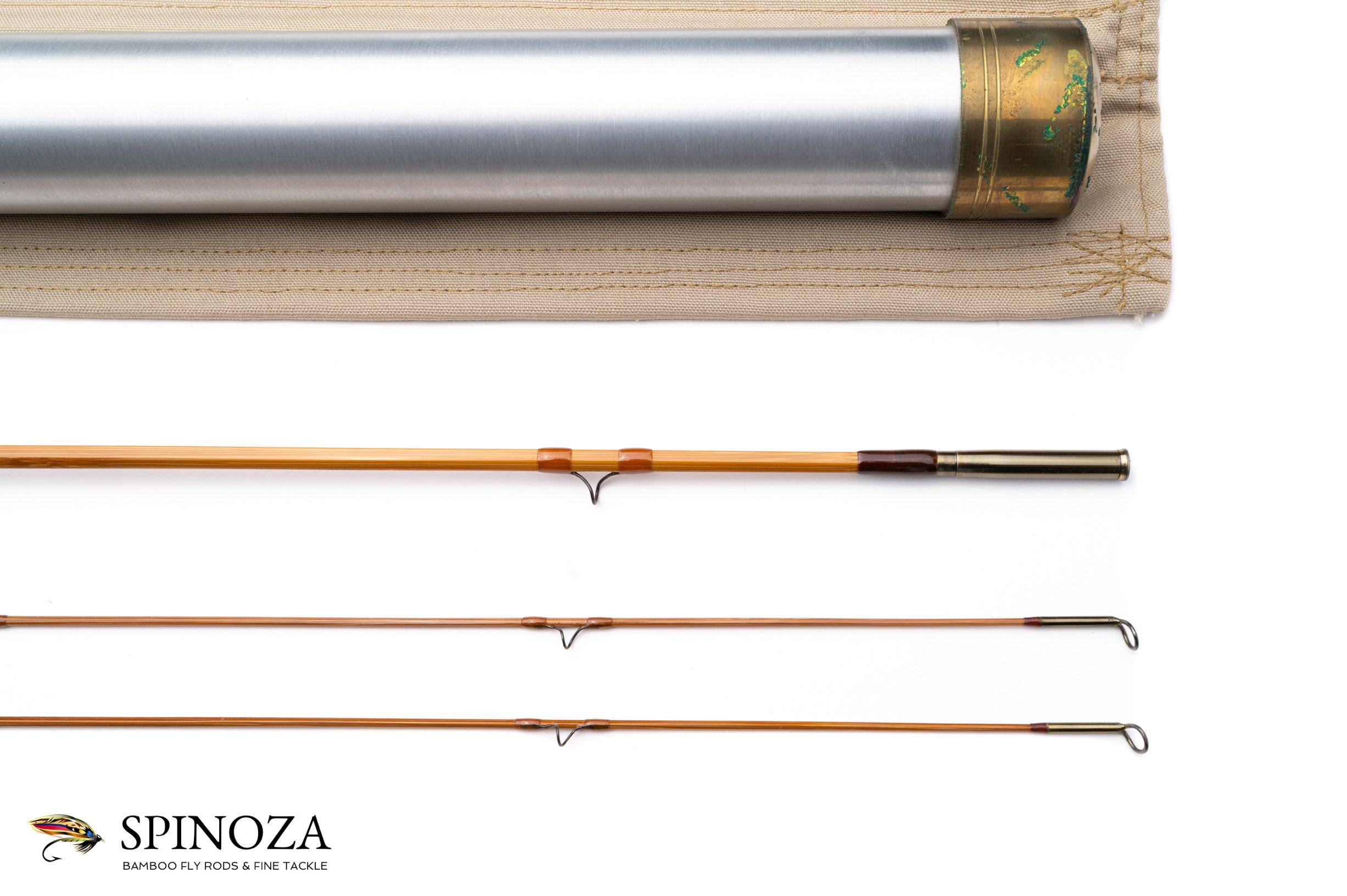 A Ron Kusse “Special Tempering” bamboo fly rod, 6'6", 2-piece, 2-tip and built for a #3 line. Serial 8656. The rod weighs 2.9 ounces (not the 2 1/4 ounces listed on the hang tag). Very fast DF action with a large swelled butt. The grip has a bit of use, hand soiling, and some of the snakes have micro brassing inside. Otherwise no sign of use so I’ll call it light use to near mint. The node pattern seems to be semi random. The “Special Tempering” is a very heavy oven tempering in the middle of both tips, getting lighter toward both the top and bottom. The butt is lighter still. The main wraps are tan with dark brown at the keeper and ferrules. The stripper is a black #8 SRMC carbide and the snakes are black high arch H.S.S. All wraps have a heavy coat of epoxy. The Swiss-style ferrules are oxidized black. The grip is 5 3/4" long and tapers to a super slim, meeting the front key cork check. The seat is attractively quilted maple with a lip meeting the rear cork. The seat hardware is a black oxidized cap and ring stamped “Ron Kusse, Maker” in a cartouche. The rod comes in a grey cloth bag with attached ferrule plug and hang/data tag. The rod tube comes with a protective Cordura sleeve and the tube itself is aluminum with brass fixtures and a “Ron Kusse, Maker” stamp on the top.