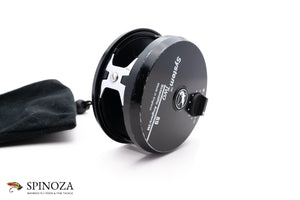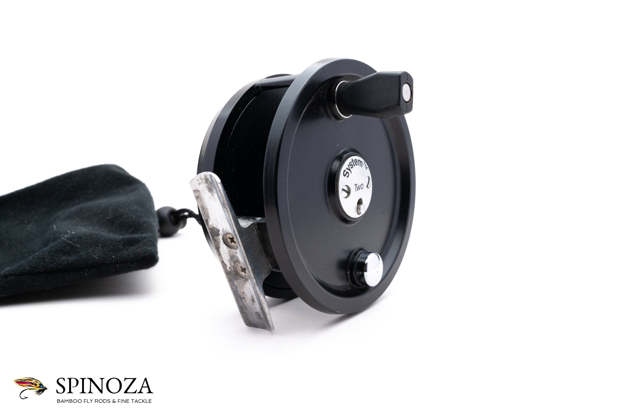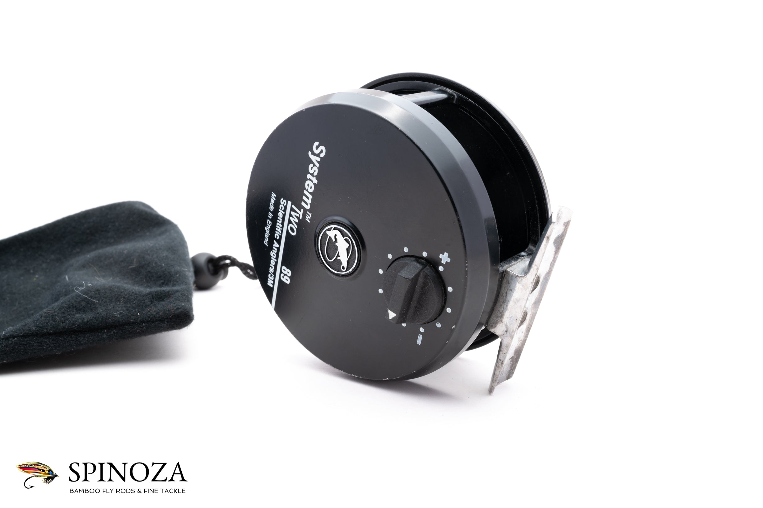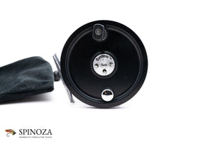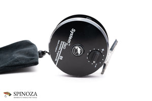 A Scientific Anglers System 2 fly reel for 8-9 weight lines. 3 3/4" diameter and set for RHW but can be changed to LHW. Made in England. Good used condition with normal cosmetic wear throughout. The only minor issue is that there is a little wobble in the reel foot, though it is certainly usable as is. Black anodized frame and spool. Adjustable drag. The reel comes in a black velvet drawstring pouch.