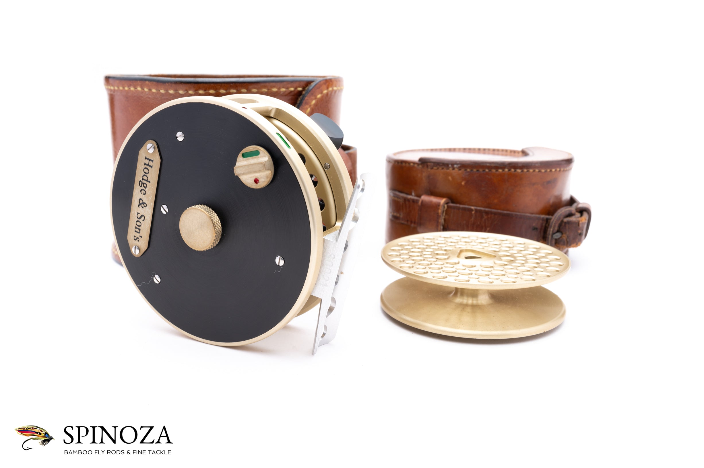 A Hodge and Sons Siskiyou Classic 3/4 reel with a spare spool, 3 1/8" diameter and set up for LHW. Serial 0021. The reel weighs 4.7 ounces on my scale. Adjustable drag. Both the reel and spool appear to be mint and unfished. S-handle design with black anodized ventilated sideplates with a gold anodized frame and spool (the foot is silver anodized). A Hodge and Sons nameplate is affixed to the backplate. "Grants Pass, Oregon" and "SD" are engraved into the counterbalance. Both the reel and spool pack into leather fleece lined cases, the larger of which has an Eddie Bauer stamp on the cover.