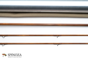 A Thomas and Thomas Classic model bamboo fly rod, 8', 2-piece, 2-tip, and built for a #5 line. Serial #4033 and weighs 5.2 ounces on my scale. Very light use with a hint of hand soiling and slight brassing to the inner snake guides. Medium fast action and straight as a pin. Flamed and impregnated cane with a three up node pattern. Very light tan main wraps with brown edges and a band of black at the keeper and ferrules. Dark brown at the ferrules. SRMC carbide stripper and black snake guides. The swiss ferrules are oxidized and have a collar on the male. The grip is 6" long and shaped to a western profile with a hidden pocket cap for the uplocking screwlock. The screwlock is nickel silver with the "Thomas and Thomas, Makers" roller die. The beautifully varnished mortised spacer is walnut. The owner's initials are engraved on the end cap. The rod packs into a tan bag with a stiffener and brushed aluminum tube with brass fittings and the T&T data sticker affixed to it.
