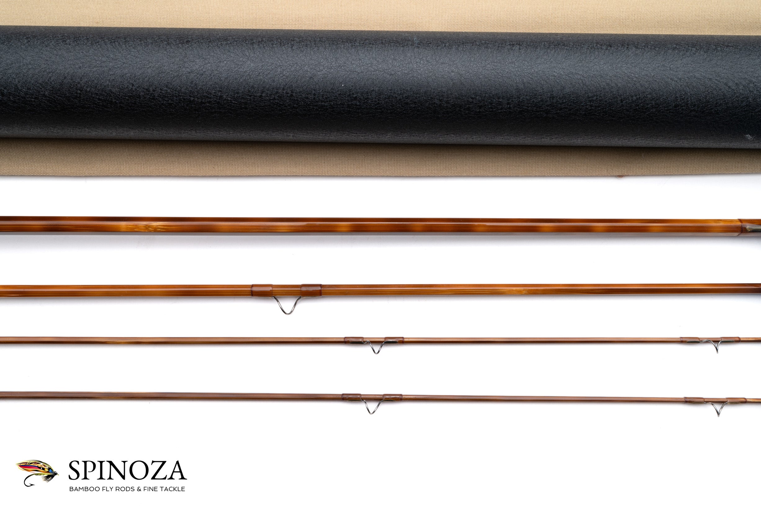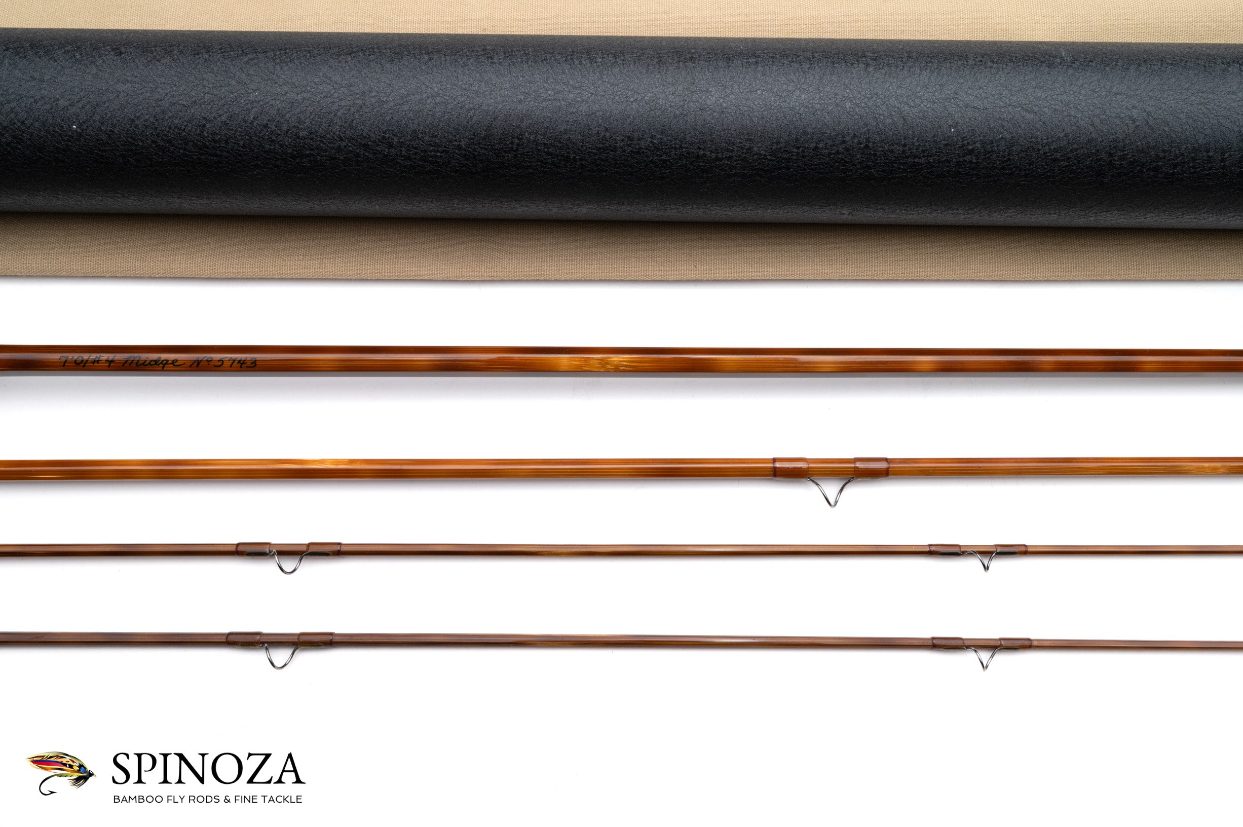 A gorgeous Thomas & Thomas “Midge” bamboo fly rod, 7’, 3-piece, 2-tip, and built for a #4 line. Serial #5743. The rod weighs 3.5 ounces. Fast D.F. action. This is my favorite T&T model. This one has been lawn cast and is near mint condition. There is a very small amount of brassing to the inner snake guide and cosmetic casting cracks to the mid female wrap. Otherwise the rod is in perfect condition and straight as a pin. This rod has standout engraving throughout, including on the ferrules, the seat cap and ring, and all the brass tube hardware. It is right up there with the best engraving I have seen. The cane is tiger striped / flamed and configured in a three up node pattern with mirrored tips. The varnish, as with most T&T’s, is flawless and like a pane of glass. The main wraps are clear with light brown edges, dark brown at the ferrules and tipped with black edges on all. The stripper is a banded agate and the snakes are black nickel. The ferrules are swiss style with a collar on the males, and oxidized (100% intact) and engraved. The grip is 5" long and shaped to a heavy cigar profile. The slide band seat is burl walnut, perfectly varnished, though shows some minute signs of use (a faint reel foot impression). The hardware is oxidized and engraved on all surfaces. The rod comes in a tan cloth bag with a stiffener. The tube is black crackle painted with brass fittings, all of them engraved, and has a T&T data sticker.