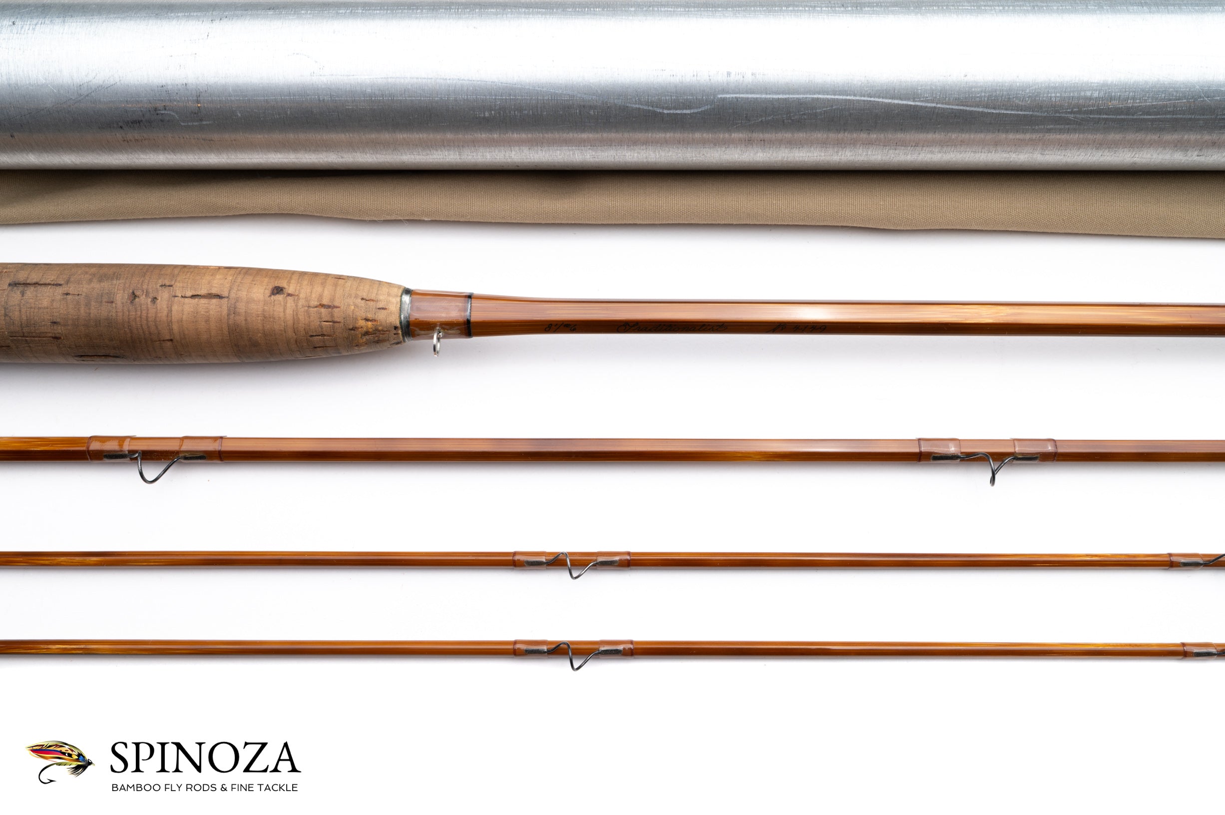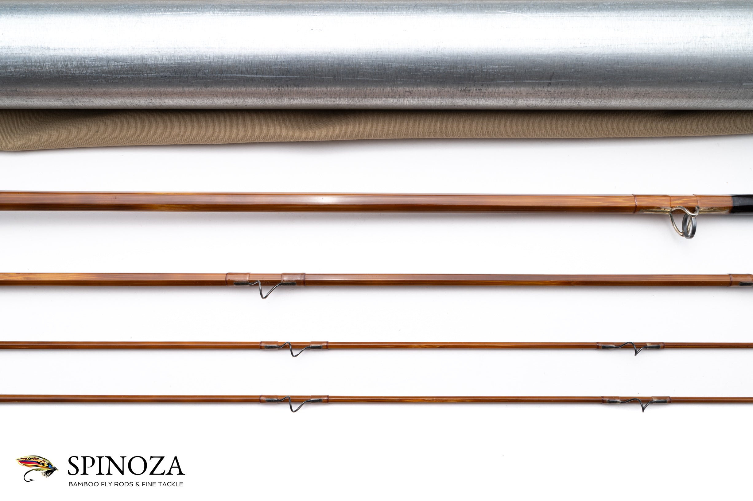 A Thomas & Thomas Traditionalist model bamboo fly rod, 8', 3-piece, 2-tip, and built for a #6 line. Serial #4149. The rod weighs 5.9 ounces on my scale (not the 4 1/2 ounces listed on the data sticker). Very powerful medium-fast 6 weight. Used but well cared for condition. It has some grip soiling, some scratches, and a small impression or two on the cedar seat. It has just the start of some cosmetic cracks at the ferrule wraps, and a small amount of wear to the inner snake guides. The ferrule fits are fine and the rod is still factory straight. Flamed cane with three-up node pattern and mirrored tips. The wraps are very light almost clear tan with brown edges on all wraps and an extra edge of black at the keeper, ferrules, and tip tops. The stripper is an SRMC carbide and the snake guides are black. The swiss-style ferrules have a collar and are oxidized. The 6" cork grip is styled to a western with a hidden pocket cap. The reel seat is nickel silver uplocking screw lock. The slide is independent of the nut and is stamped “Thomas & Thomas Makers.” The rod packs into a tan cloth bag and aluminum tube with brass fixtures.