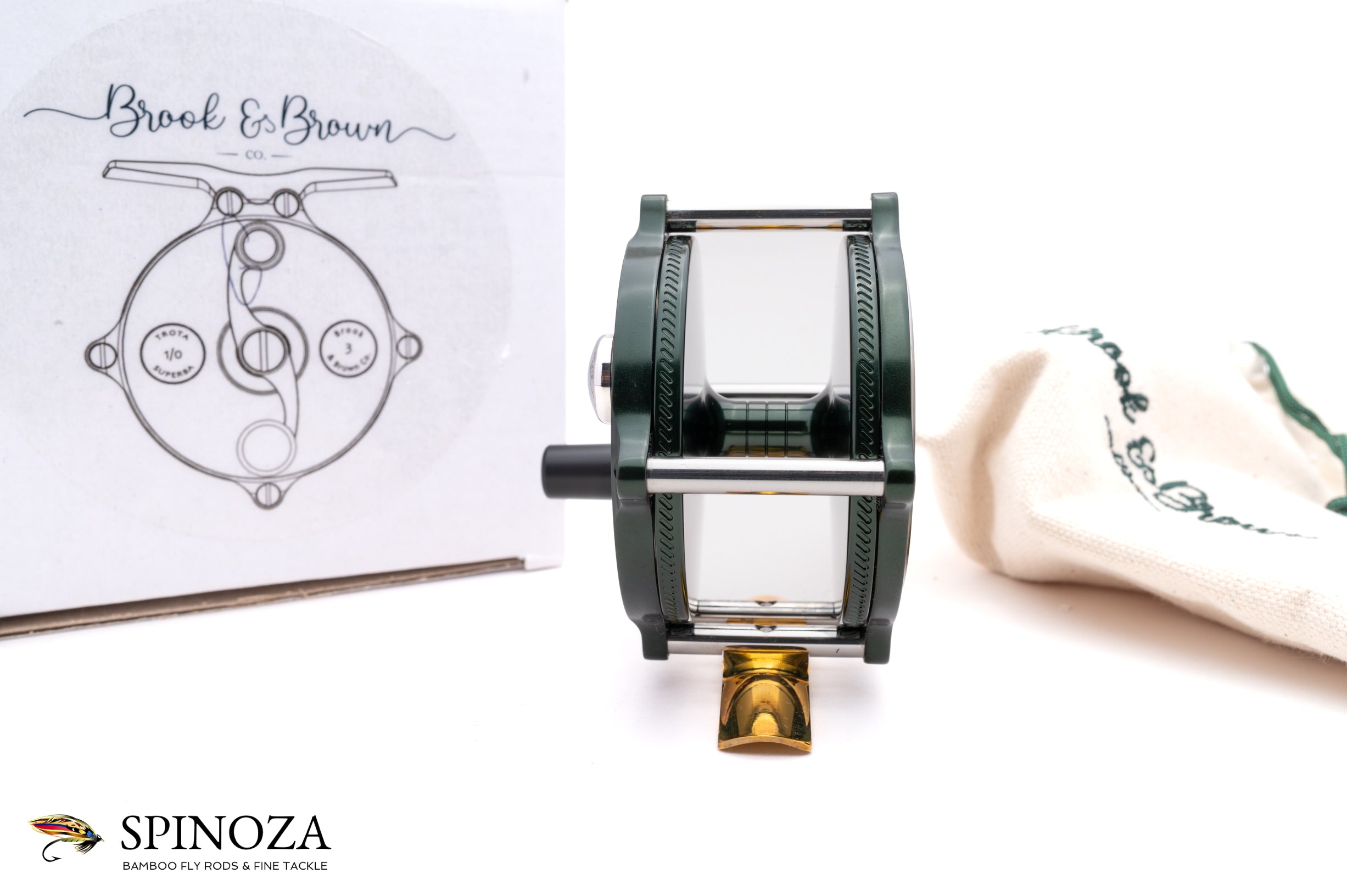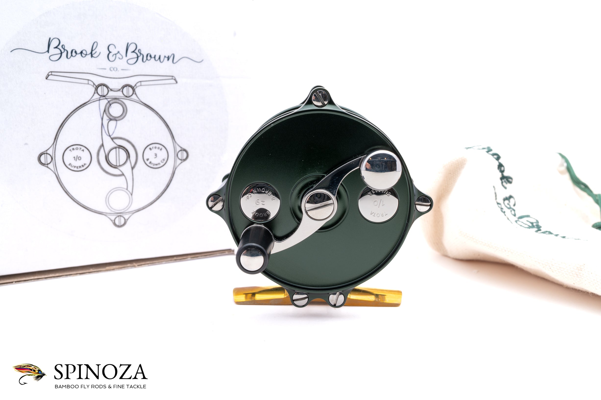 A VR Design (Vlad Rachenko) Trota Superba fly reel in 1/0 size, 2 3/4" diameter and with a neutral bias. Mint unused condition. Serial #29. Handsome raised pillar design with a dark olive anodized frame and brass foot with stainless pillars. Black handle with a polished counterbalance. As with many of Vlad's other classic models this one has knurling on the spool edge which allows for light palming. Vlad made these for a collaboration with Gray Wolf rods under the name "Brook and Brown". Dual medallions note the maker, size, and serial numbers. The reels comes packed into light canvas drawstring pouch and box with paperwork.