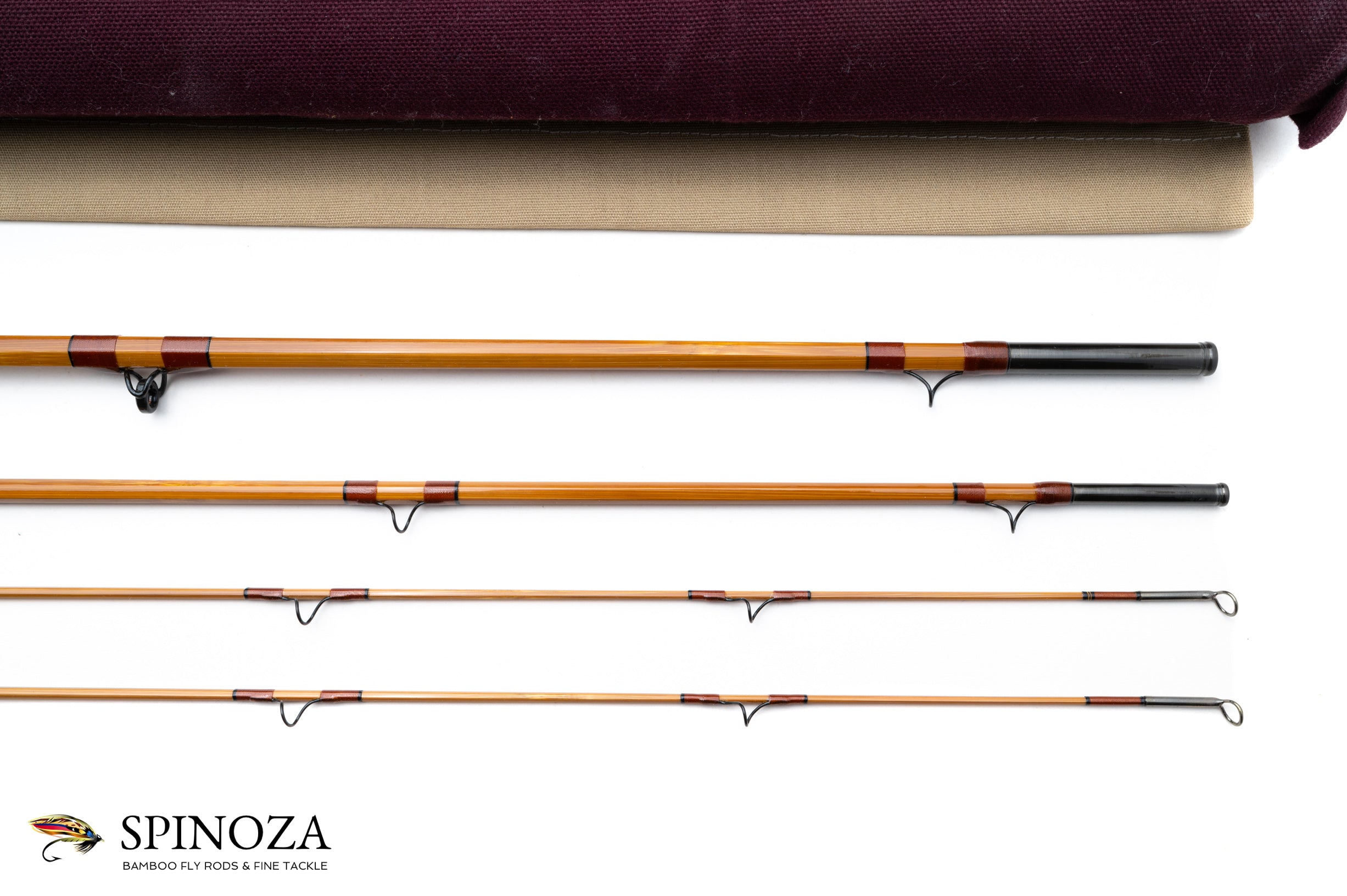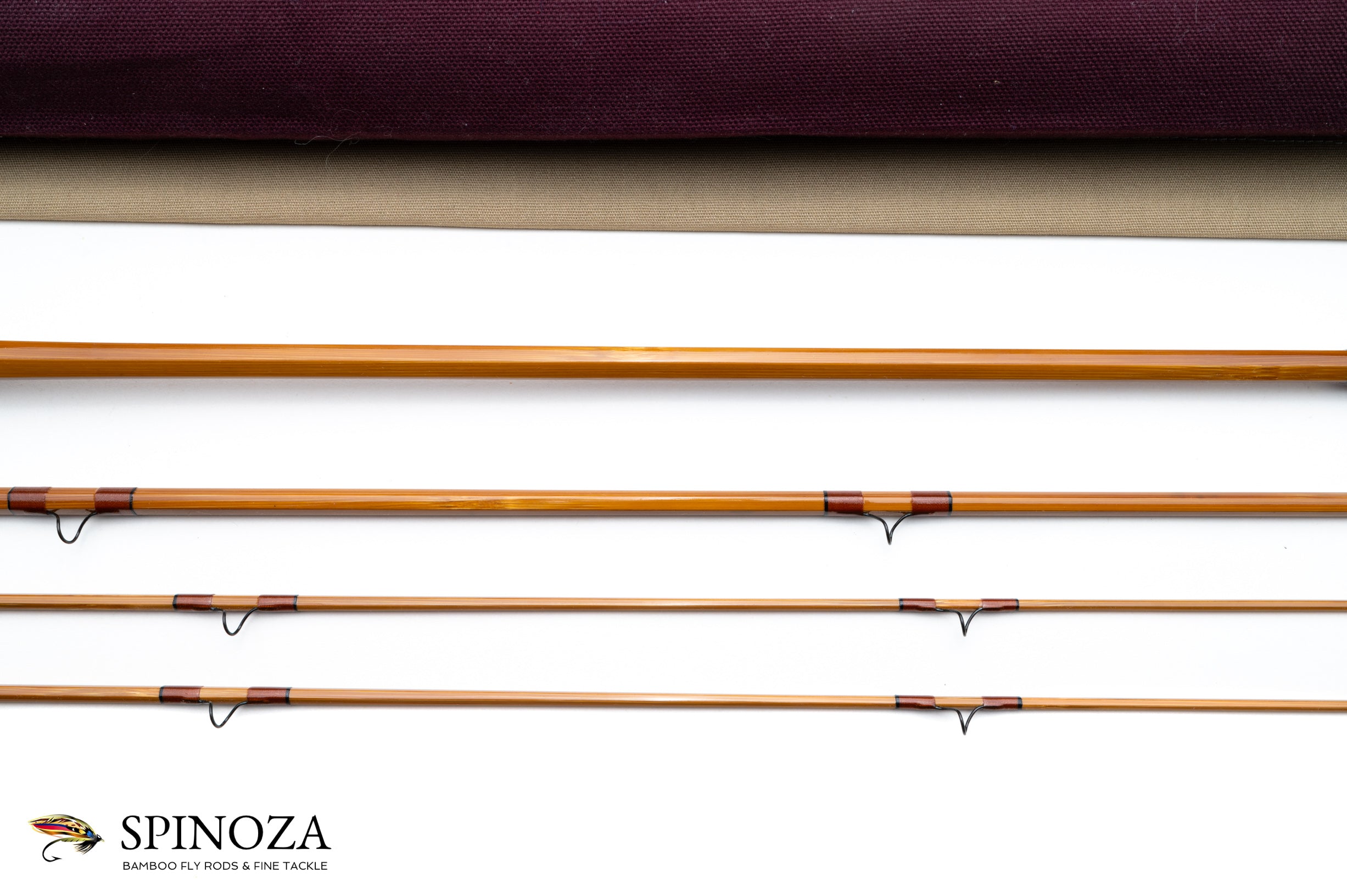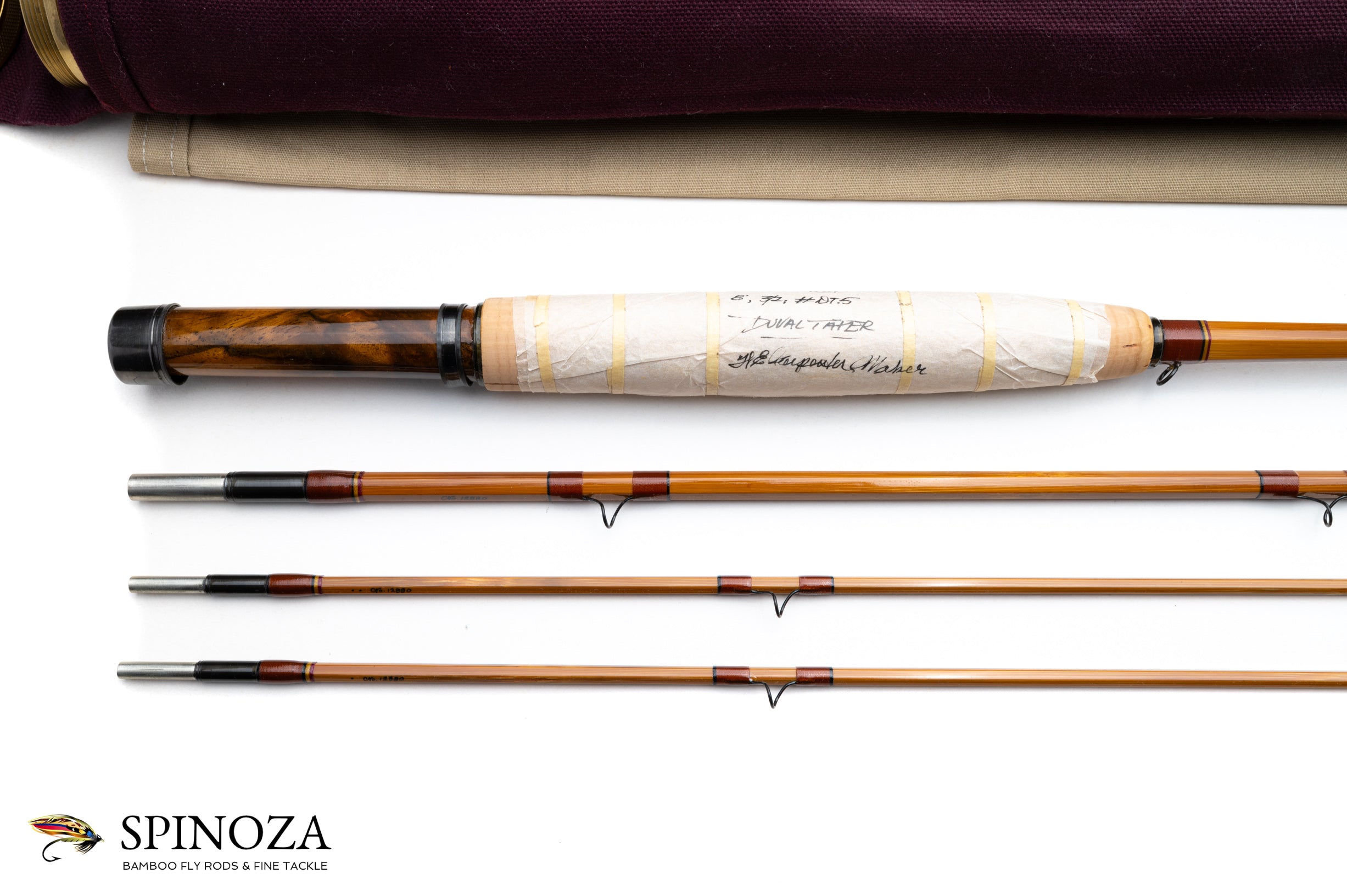 A beautiful Walt Carpenter Browntone model fly rod, 8', 3-piece, 2-tip, and built for a DT5 line. Serial #12880. The rod weighs 4.2 ounces on my scale. Mint, uncast condition with the paper and gum still on the grip. "French Walnut" and "Doval Taper" are inked on the grip by Walt, along with the rest of the rod data. Flamed cane done in a three up node pattern. Superb varnish. Brown main wraps with black edges and a band of yellow and red at the keeper and male ferrules. The step ferrules are oxidized jet black. The grip is 6" long and shaped to a medium cigar profile. The varnished cap and ring slide band seat includes a spectacular piece of smokey french walnut. "WS Carpenter, Maker" is stamped on the oxidized butt cap. The rod packs into a tan cloth bag and an aluminum tube with brass fixtures as well as Walt's data sticker.
