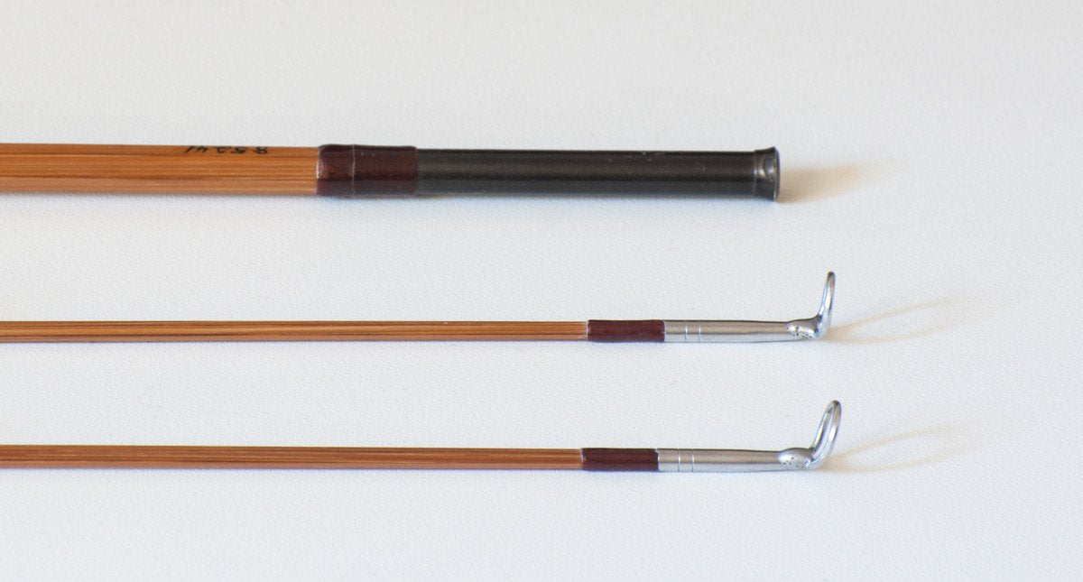 For sale here is a 7'6 impregnated Orvis Battenkill bamboo rod. 3 7/8 oz. 2/2. Rated for a 6 wt but throws a 5 best. Medium fast action. Serial number 85241 made in 1981. Tan bag, aluminum tube with green/silver foil label.The rod is in near mint condition with only some slight soiling of the grip. The ferrules are 12/64 and the ferrule fit is excellent. All sections are full-length and original.