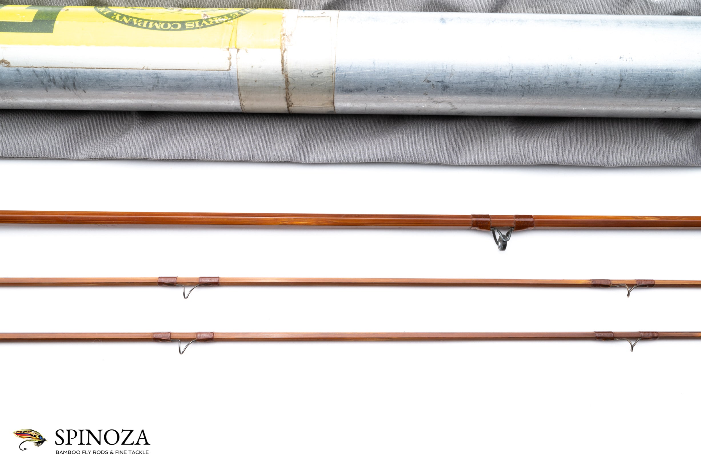 An Orvis Deluxe bamboo fly rod, 6'6", 2-piece, 2-tips, and built for a #6 line. Serial #43505, built in 1966. Used but well cared for condition. Medium action. 2/3 ounces. The owner's name is on the rod but all other writing has worn off. Impregnated, heat treated cane in a 3-up node pattern. Brown wraps with dark HSS snake guides. All sections are full length. The grip is a tiny 4" long super fine profile that tapers to the bamboo at the front. The reel seat is all cork, flatted for the reel foot, and with two small aluminum rings. The step ferrules are oxidized. A rarely seen Orvis model. The rod packs into the original grey poplin bag. The tube has the Orvis data sticker intact and a large "Think Trout" sticker from Orvis.
