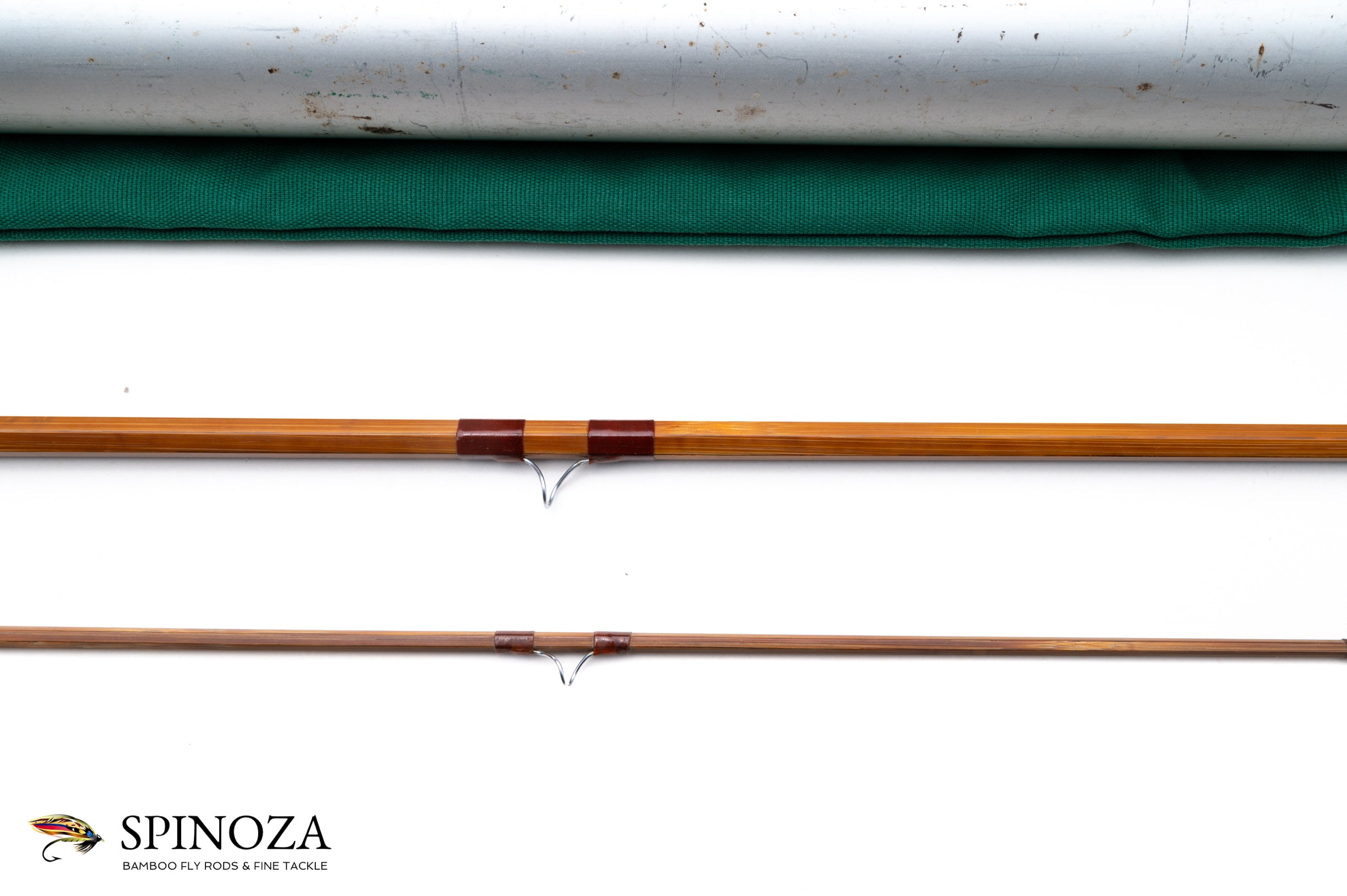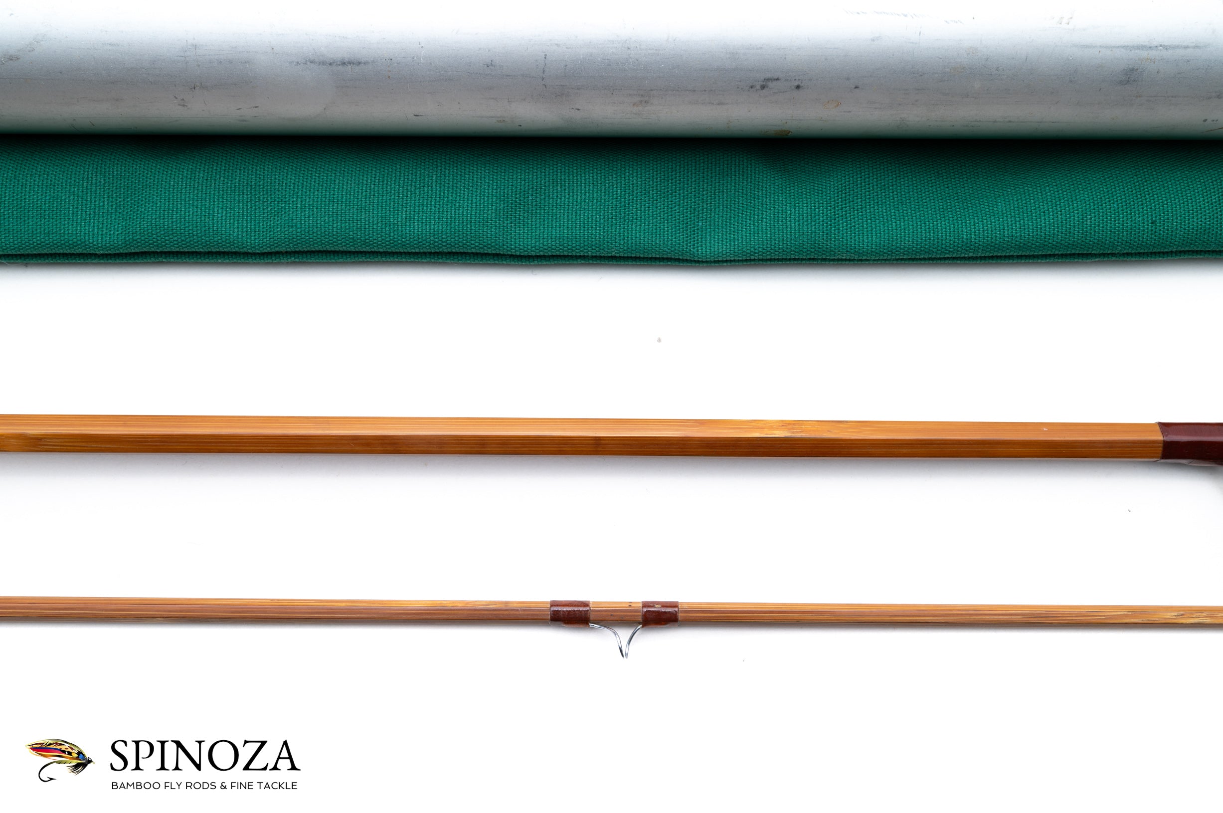 An Orvis Madison bamboo fly rod 8'6", 2-piece, 1-tip, and built for a #9 line. Serial #67808, built in 1972. The one tip is 1 3/4" short. Aside from the short tip the rod is in good used condition with normal cosmetic wear but nothing substantial that I could find. Powerful medium action. The rod is straight and the ferrule seats fully. Medium color impregnated cane done in a three up node pattern. Wrapped dark red throughout with a carbide stripper and chrome guides and tip top. Oxidized step ferrules. 6 1/2" long grip that's shaped to a medium blunt cigar with a fair bit of hand soiling. An aluminum downlocking screwlock reel seat over a varnished walnut spacer. The rod packs into a green cloth bag and the original tube with the data sticker 90% intact.