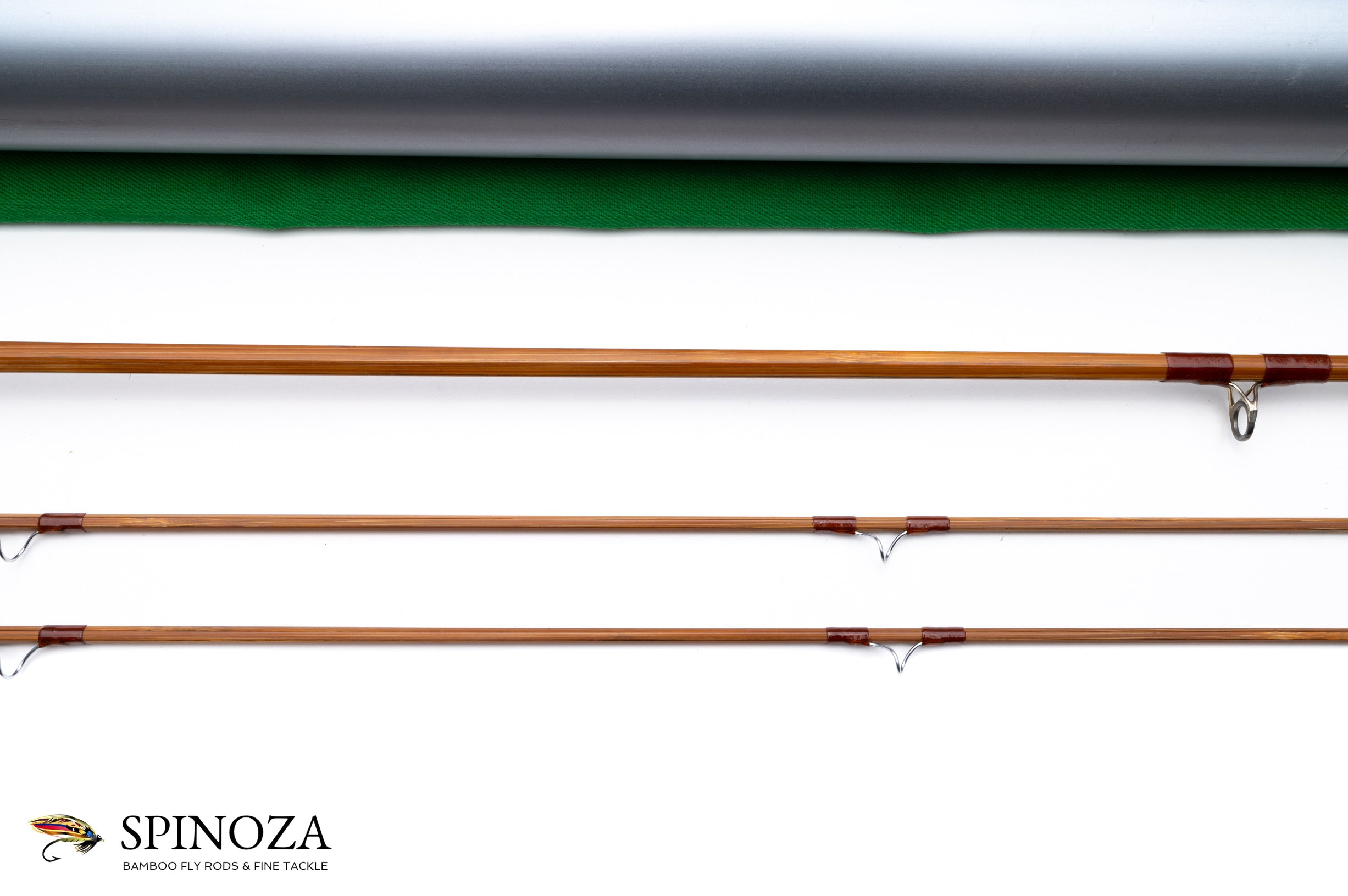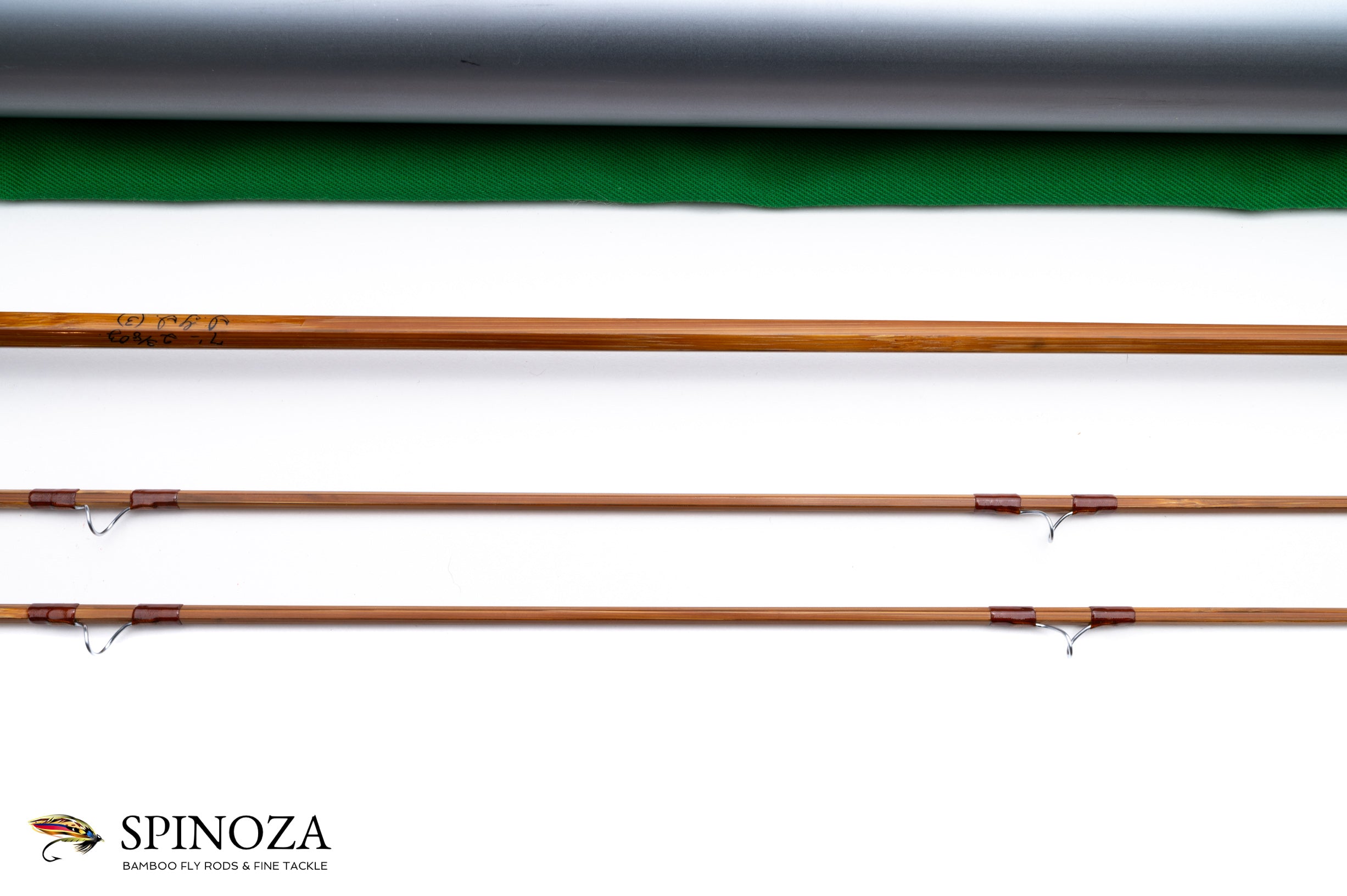 An Orvis "Seven Three" bamboo fly rod, 7', 2-piece, 2-tip, and built for a #3 line. Serial #76655. The rod weighs 2 3/8 ounces. Mint condition. The original owner’s name on the rod. Medium chestnut color cane done in a 3-up node pattern. Brown wraps with a carbide stripper and chrome snake guides. The step ferrules are oxidized black with a ferrule plug. Slow, full-flexing action. The 5 1/2" grip tapers down to the keeper wrap which is overwrapped. Medium cigar grip profile. The reel seat is flatted cork with 2 rings to hold the reel on. The rod bag is green. The aluminum tube is frost coated grey and the Orvis label 100% intact.