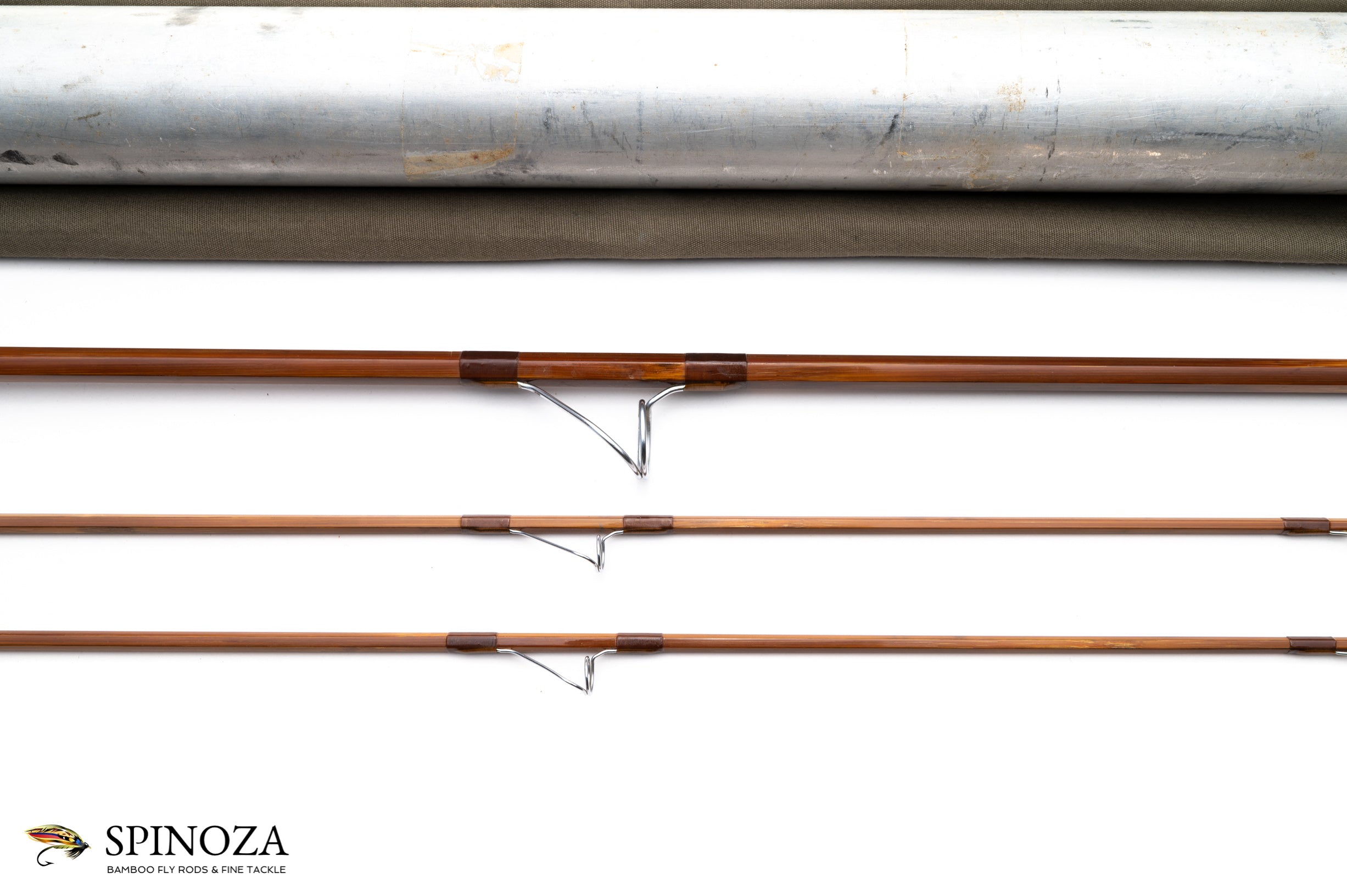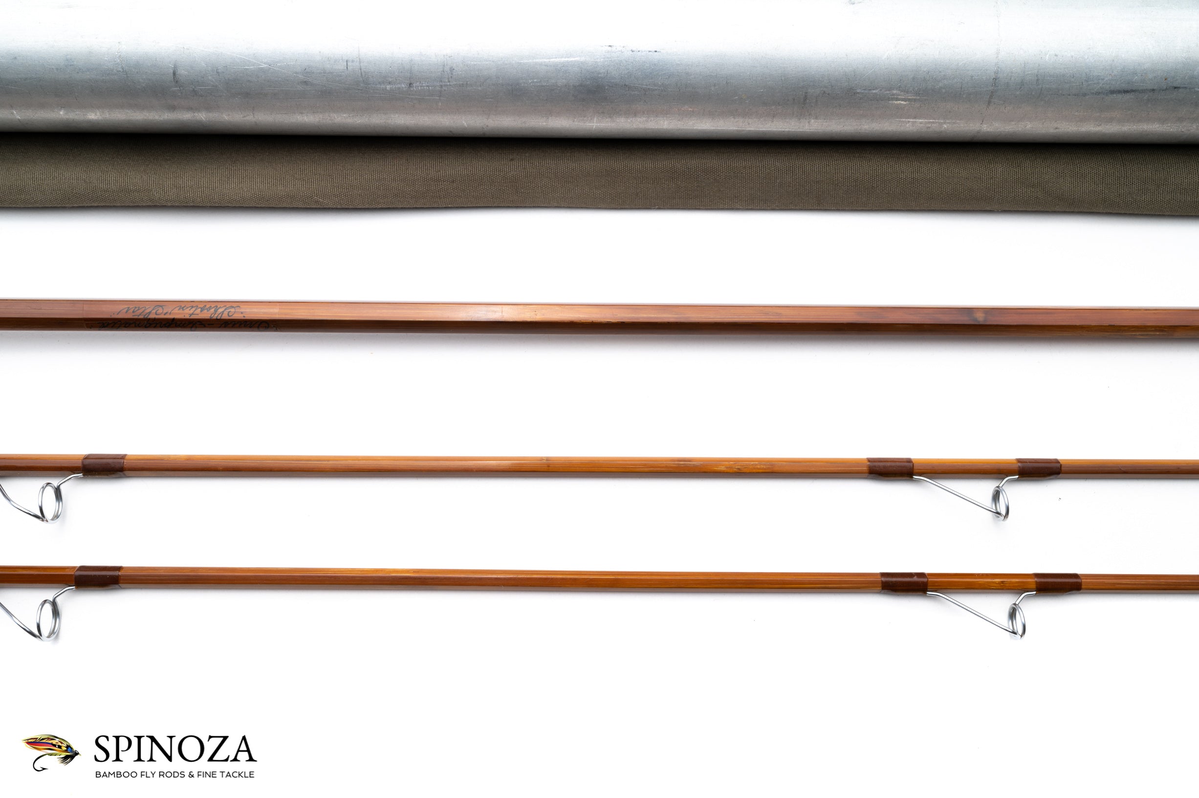 An Orvis Shooting Star bamboo fly rod, 9', 2-piece, 2-tip, built for a #9. 6.8 ounces. Medium to slow action. Used but good condition, straight, with no ferrule problems. Resorcinol glue and moderately dark cane done in a three up node pattern. Brown wraps. The rod is set up with aetna foulproof guides. The grip has a good amount of hand soiling, is 7" long, and tapers down to a slim cigar. The reel seat is a 4" long all anodized aluminum downlock. There is a 2" long permanent fighting butt with a heel plate. The rod is put up in a gray cloth bag and an aluminum tube with brass collar and aluminum top.