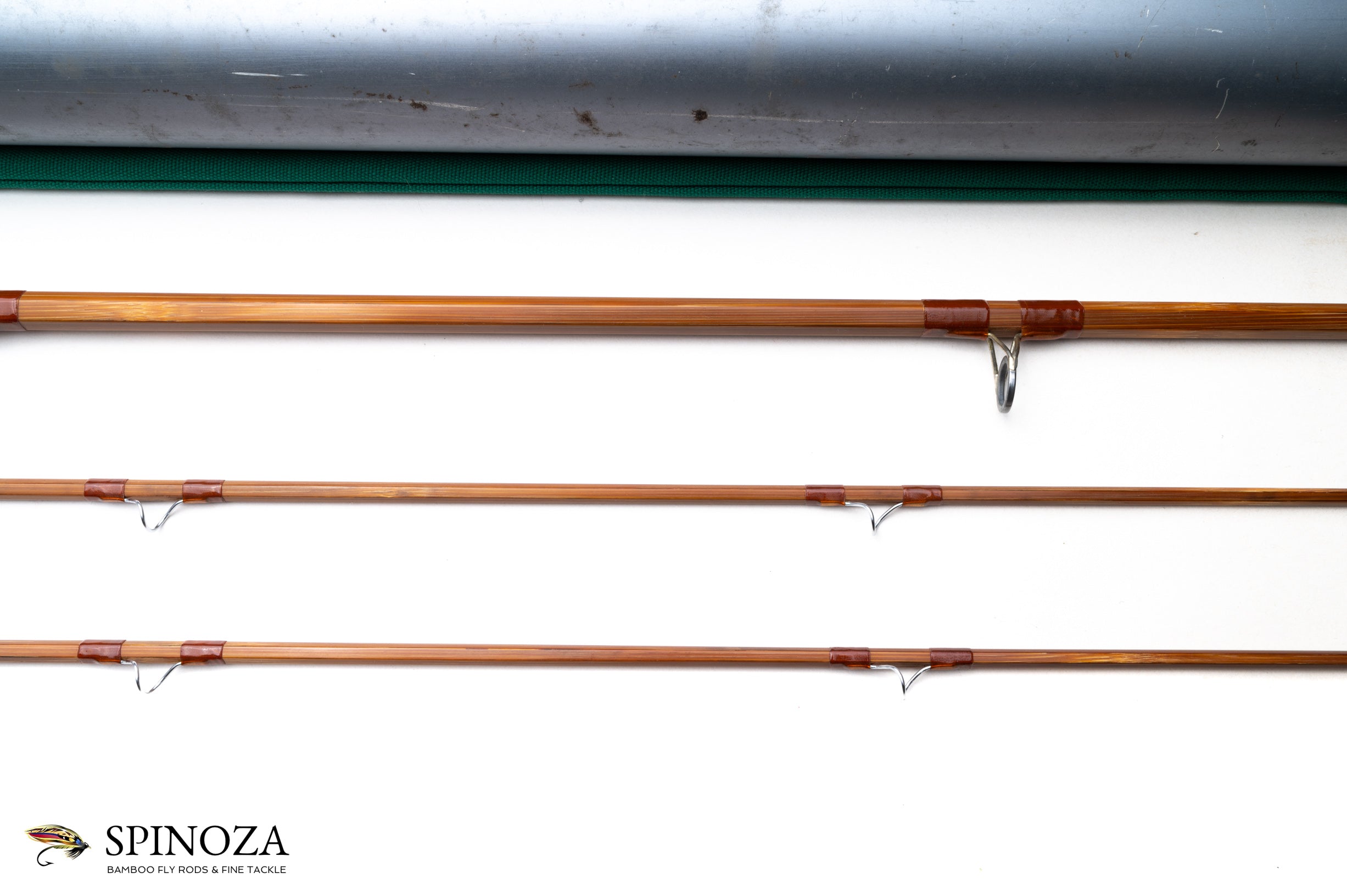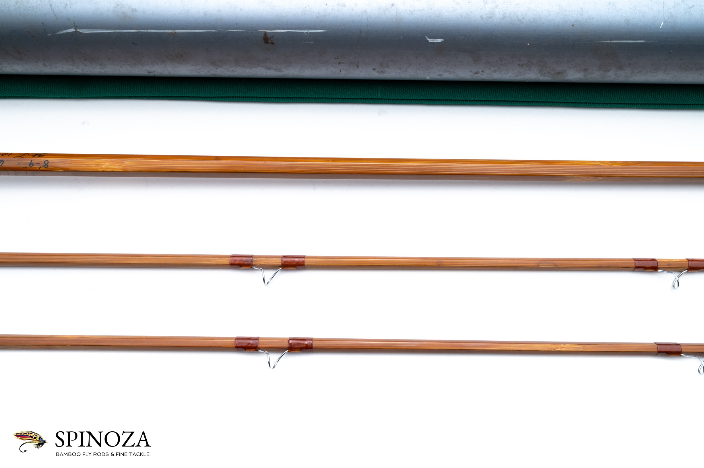 An Orvis SSS model bamboo fly rod, 8'9", 2-piece, 2-tip, and built for a #10. Serial #73211. Very light use. Medium full flexing action. 7 ounces. The butt is trimmed shorter than the tips. Dark oven temper cane with a three up node pattern. Brown wraps with no edges. 3 carbide ring strippers on the butt. Chrome snakes and tip tops. Oxidized ferrules. The rod is nice and straight. The grip is 7" long in a blunt cigar with little hand soiling. The reel seat is an all aluminum downlocking screwlock with a pocket cap. The bottom cap unscrews and pulls out to accommodate a fighting butt. The rod packs into a green cloth bag and original all aluminum tube with the data sticker about 80% intact.