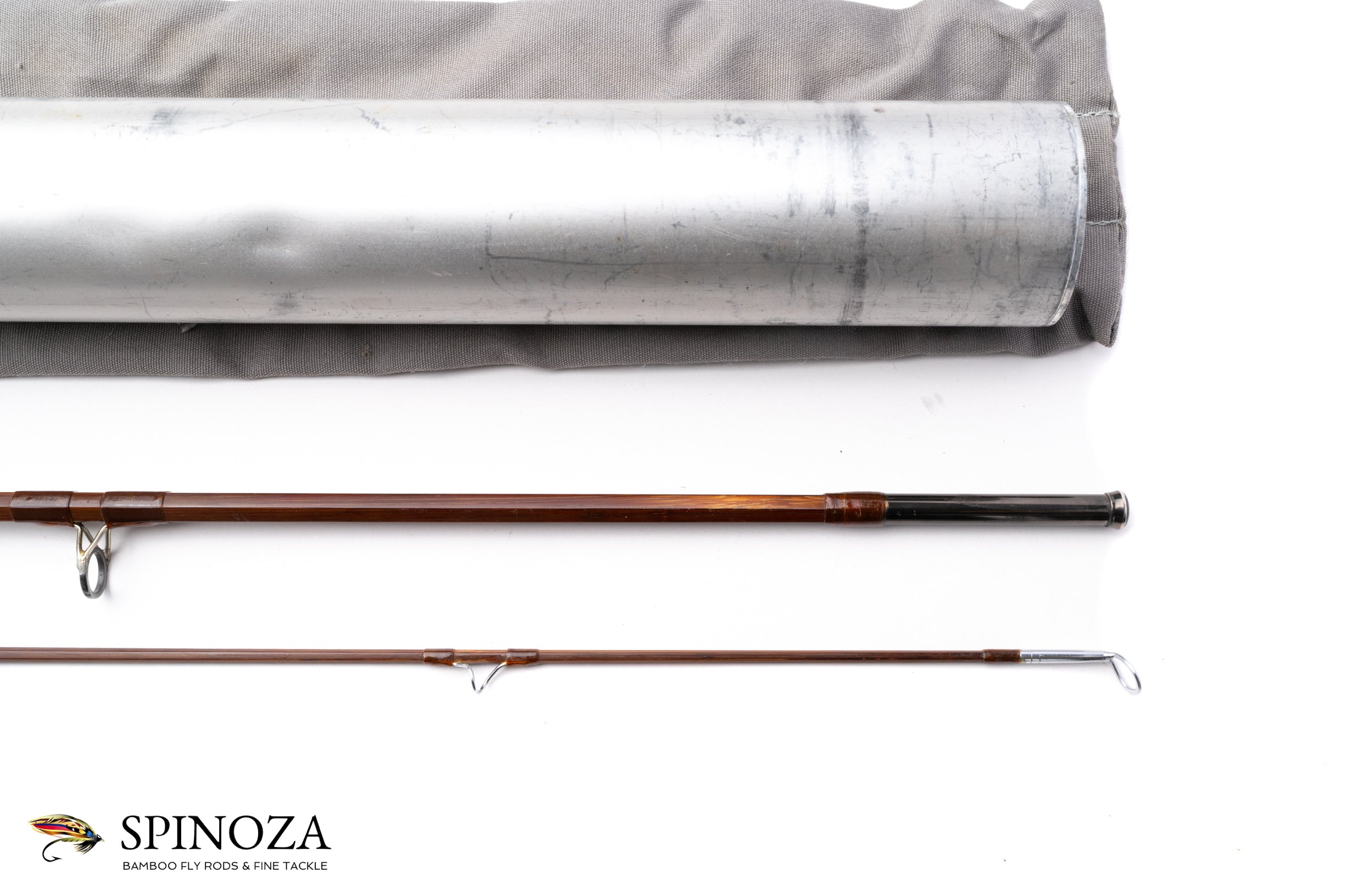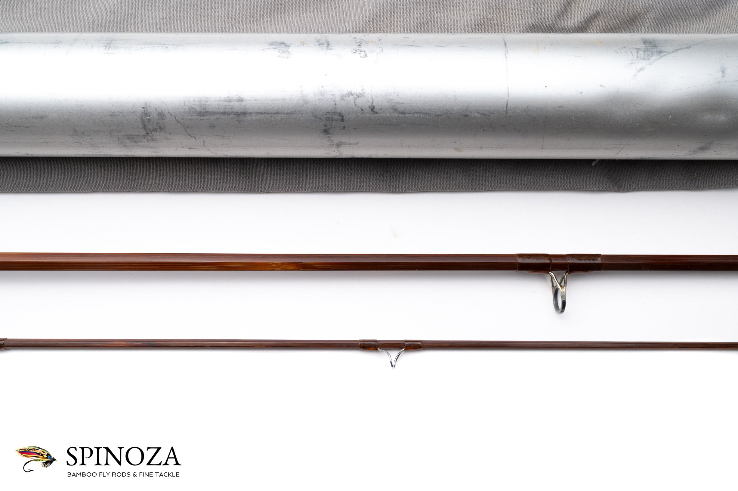 An Orvis “Wes Jordan” bamboo fly rod, 8', 2-piece, 1-tip, and built for a #7 line. Serial #45306. The rod weighs 4.6 ounces on my scale. Originally built with two tips. The ferrules are nice and tight. Good overall condition except that the grip has been cleaned. Medium to slowish action. Dark oven-tempered cane with three-up nodes. The butt has two carbide strippers attached with the standard Orvis brown wraps. The snakes are chrome. The nickel silver step ferrules are oxidized. The grip is 6 1/2" long and turned to a slim cigar profile. The seat is a down-lock aluminum screw lock with a pocket cap over a walnut spacer. Grey poplin bag. The rod comes in the original Orvis tube with the data sticker about 95% intact.