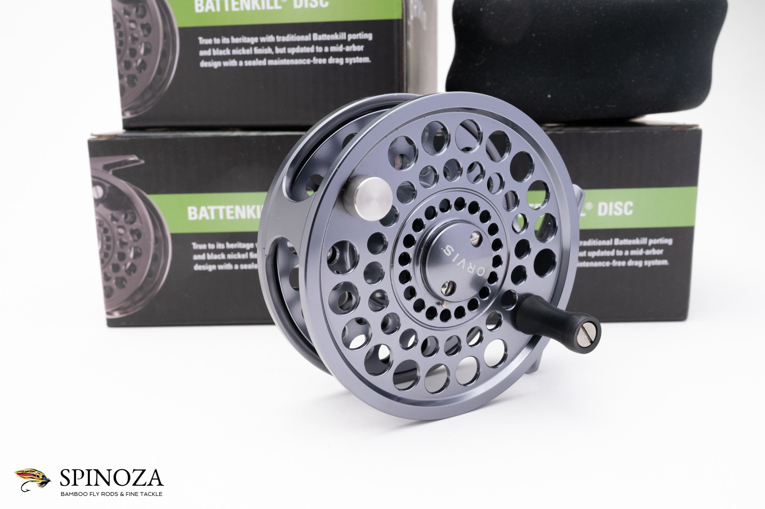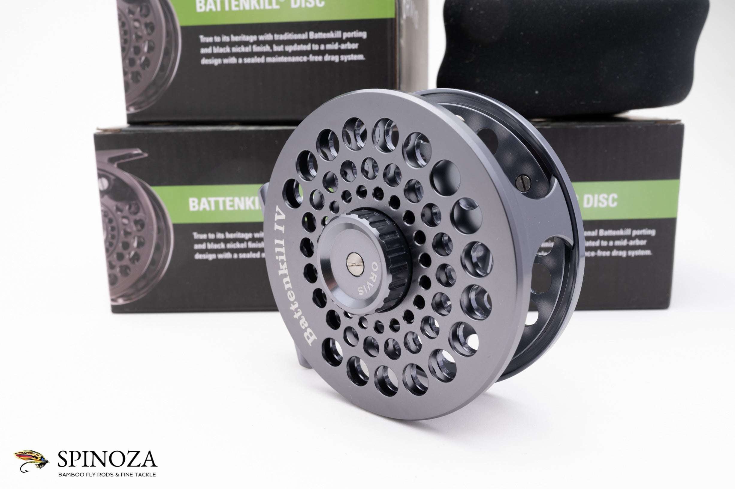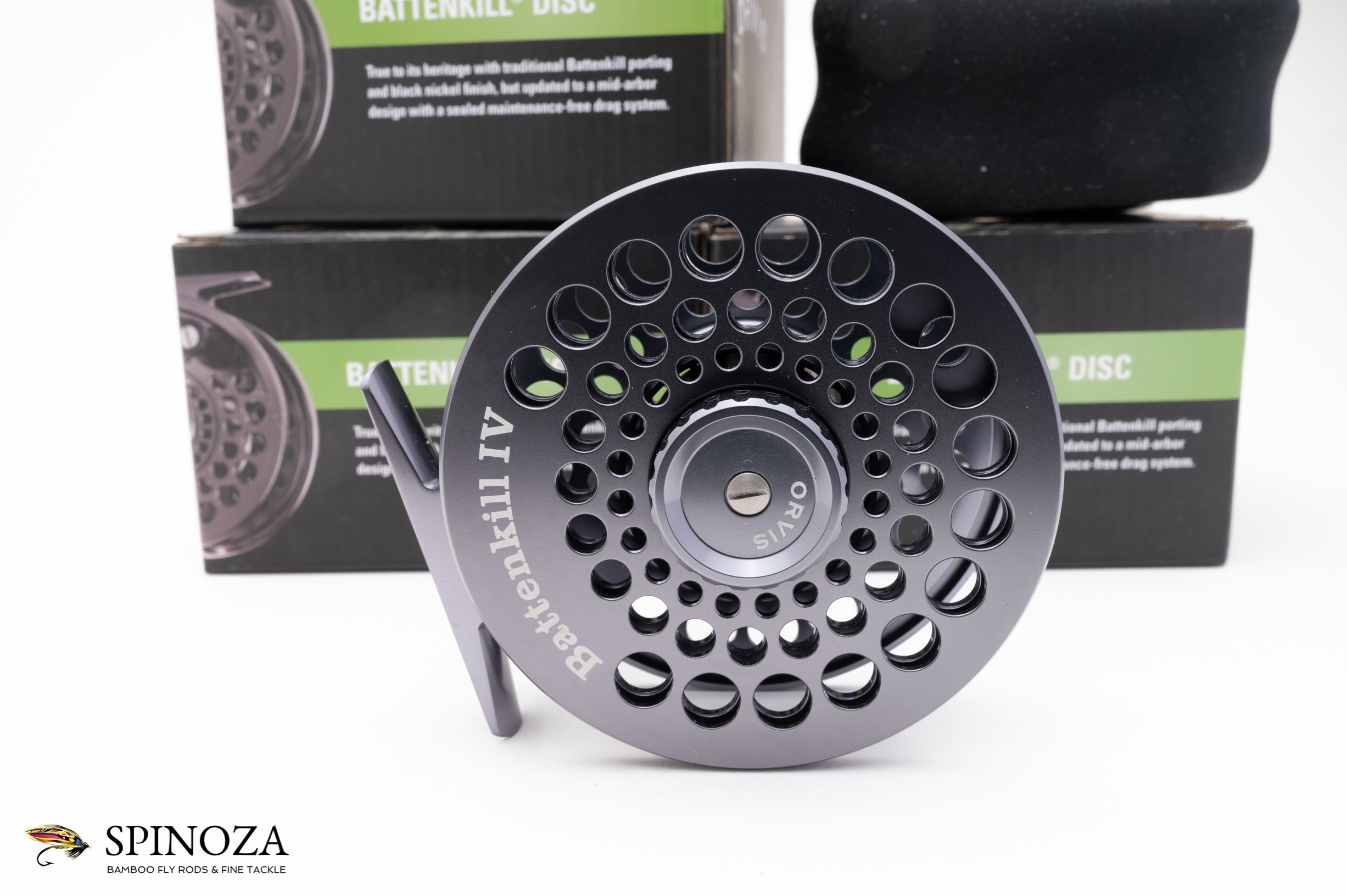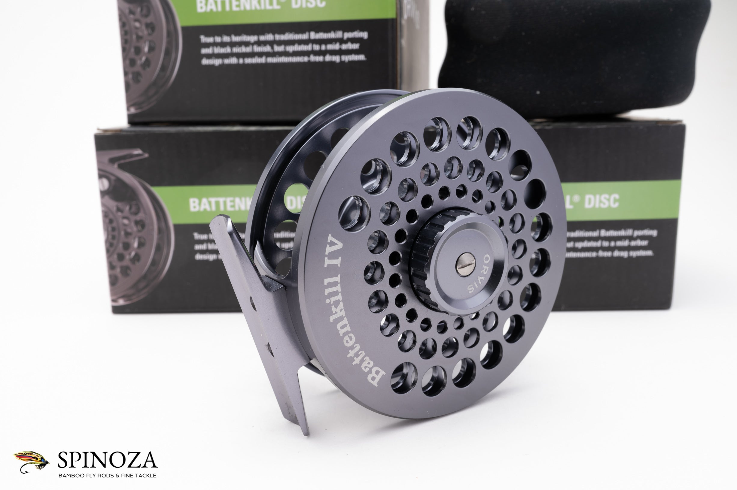 A Orvis Battenkill Disc Drag reel, size IV which is 3 1/2" in diameter and designed to hold 7/8/9 lines. Mid arbor design. Comes with two spare spools. Mint, unused. 5.9 oz. Comes with original pouches, boxes, and paperwork.