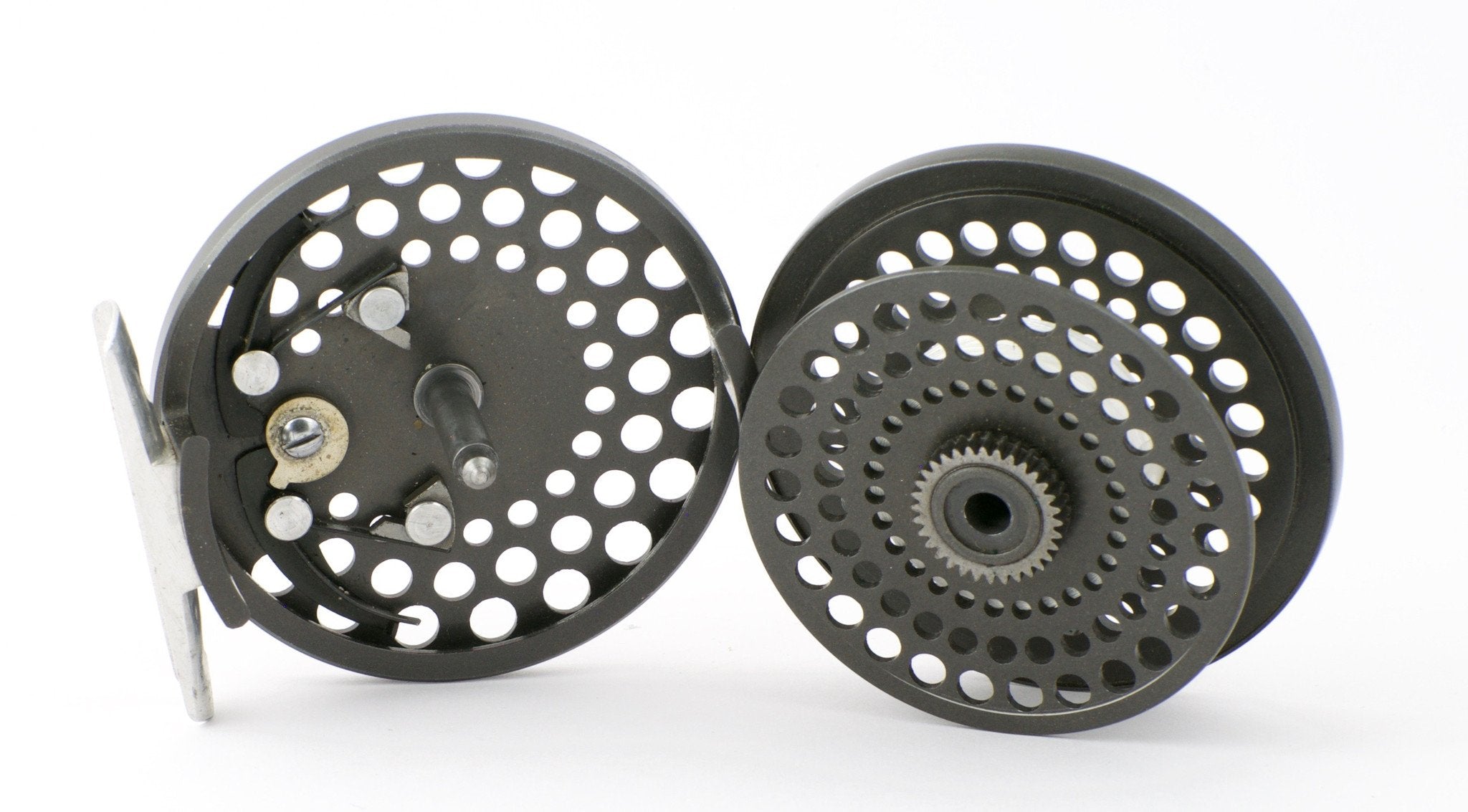 For sale here is a very early Orvis CFO IV fly reel - the screwback model with three holes in the reel foot. Made in England. Excellent condition. The reel is dated to 1972, the year the CFO premiered based on the lack of a nickel-silver line guard the models from 1973 forward possessed. Left or right hand retrieve. Exposed spool rim for easy palming. Tensioner still works great with a very pleasing clicker sound. The latch performs flawlessly. At a diameter of 3 1/8" the IV is a great all around reel for anything from a 4-7 wt rod. The reel weighs 4.0 oz. Comes with original reel case and includes backing.