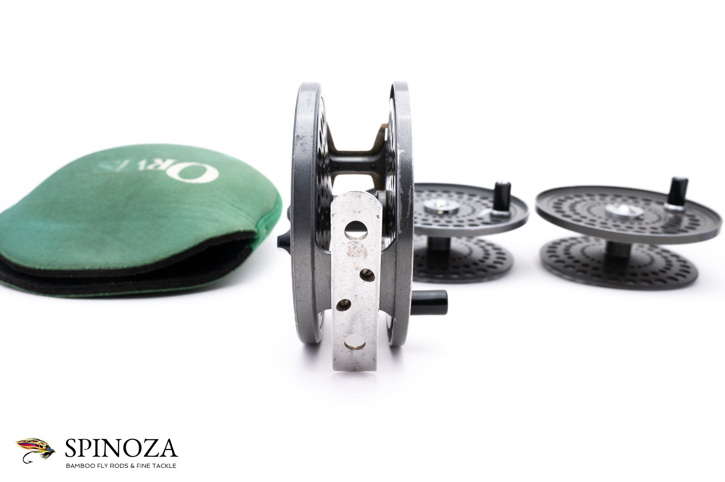 A nice Orvis CFO V fly reel with two spare spools, 3 1/2" in diameter, and currently set up for RHW, though easily switchable. Good used condition with some loss of finish on the frame edges (there is one small spot of potential corrosion on the frame edge) and normal cosmetic wear throughout. The spare spools show similar wear. The reel is sound mechanically. Exposed spool rim for easy palming. The drag adjuster works smoothly with a very pleasing clicker sound. The latch works great. Two screw nickel silver line guard. Made in England. A nice lightweight option here for #9 lines. The reel comes in a green neoprene Orvis pouch and the spools are loose.