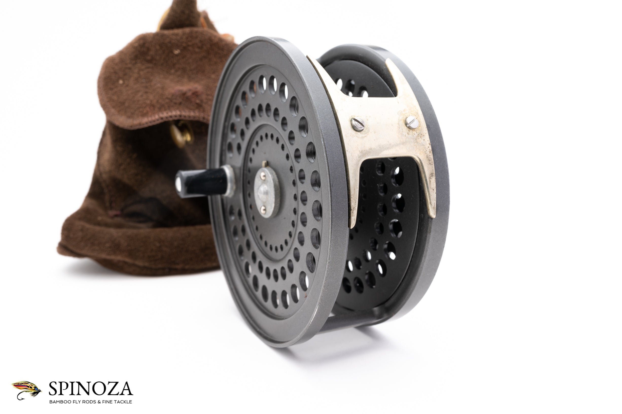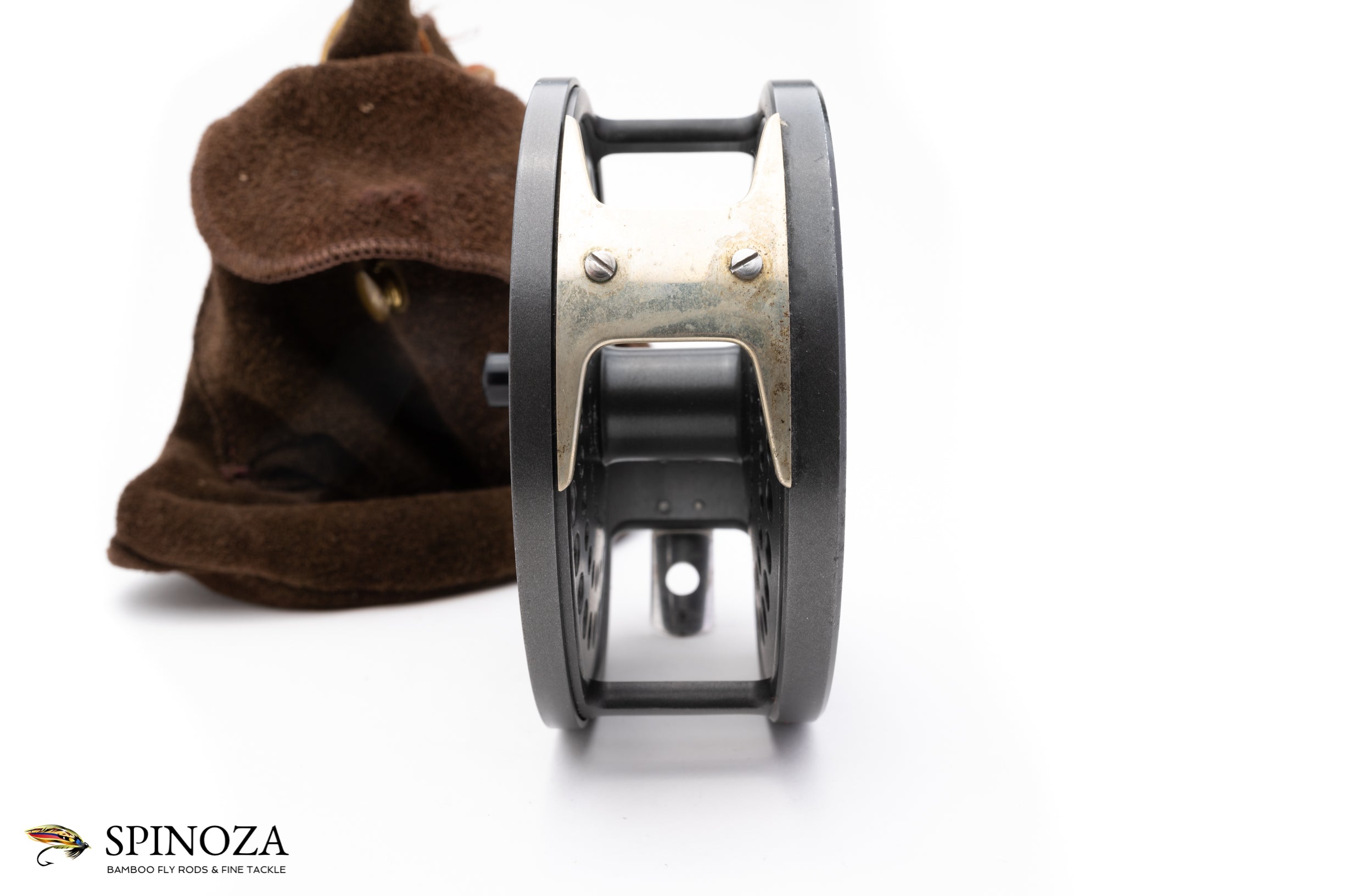 A hard-to-find Orvis CFO VI fly reel, made in England by Hardy Bros for Orvis. 4 1/4" diameter with a 1 1/8" spool width. 8 3/4 oz. Designed to hold a DT11 with 350 yards of #20 backing. Set up for LHW but easily convertible by flipping the internal pawls. Excellent used condition. Some signs of honest wear in the form of some light marks here and there but nothing major. The two spare spools look as though they haven't been used. The reel comes in a large, non-original leather pouch, and the two spare spools come in a double zippered suede pouch.