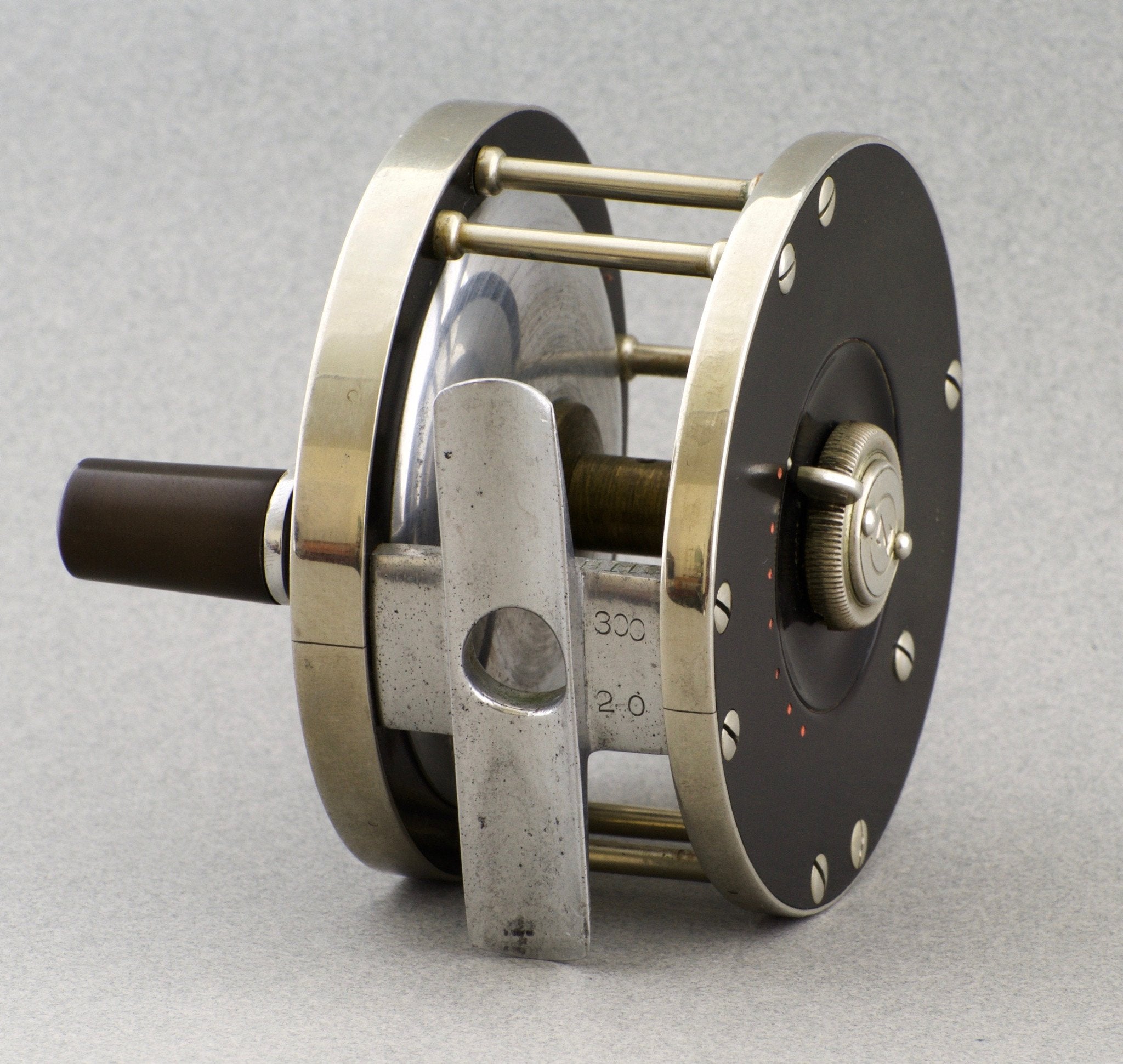 For sale here is an exceedingly scarce Otto Zwarg "Z" reel -- Model 300 Saguenay salmon fly reel - size 2/0. Excellent original condition. This is one of the few reels with the "Z" stamped oil cap that Zwarg used between the Brooklyn stamp and St. Petersburg stamp. Serial number B11 from the 2nd year of production (1947). The drag is still perfectly strong and smooth. Full length and unmolested reel foot. Also comes with an original Zwarg leather reel case in superb condition as well.