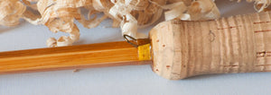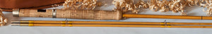 This particular version of the Martha Marie has random node spacing on all sections and the cane is not your typical "clean" variety cane used by PHY in his rod building career. One tip is 3/32" longer than the other. The longer tip appears to have an invisible wrap surrounding both silk windings on the last guide, with the guide being a smaller replacement. There is some black tape on the cork spacer to snug up reels it seems. Cork slightly ridged but otherwise fine. Thumb indentation in normal position on grip. Size 14 ferrules. Rod weighs 3.75 oz. Fish ruler black windings for 7 and 11 inches. Ferrule fit is good with both tips. I've learned that the blanks could have been sourced from the South Bend Rod Company and Paul then finished the rod. The rod remains in excellent+ original condition. Original bag and tube in excellent condition.