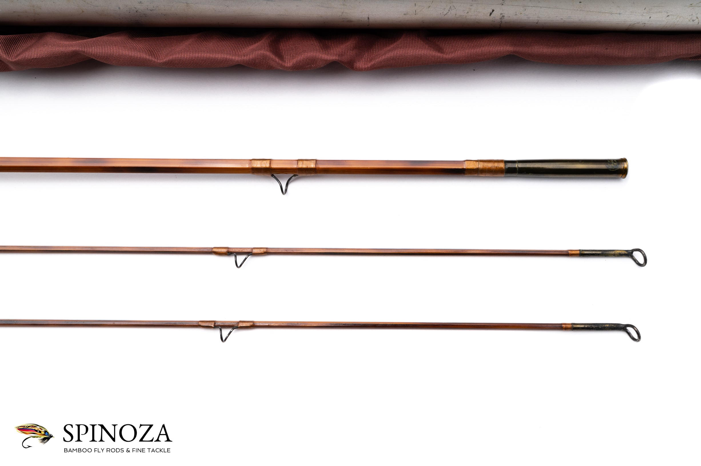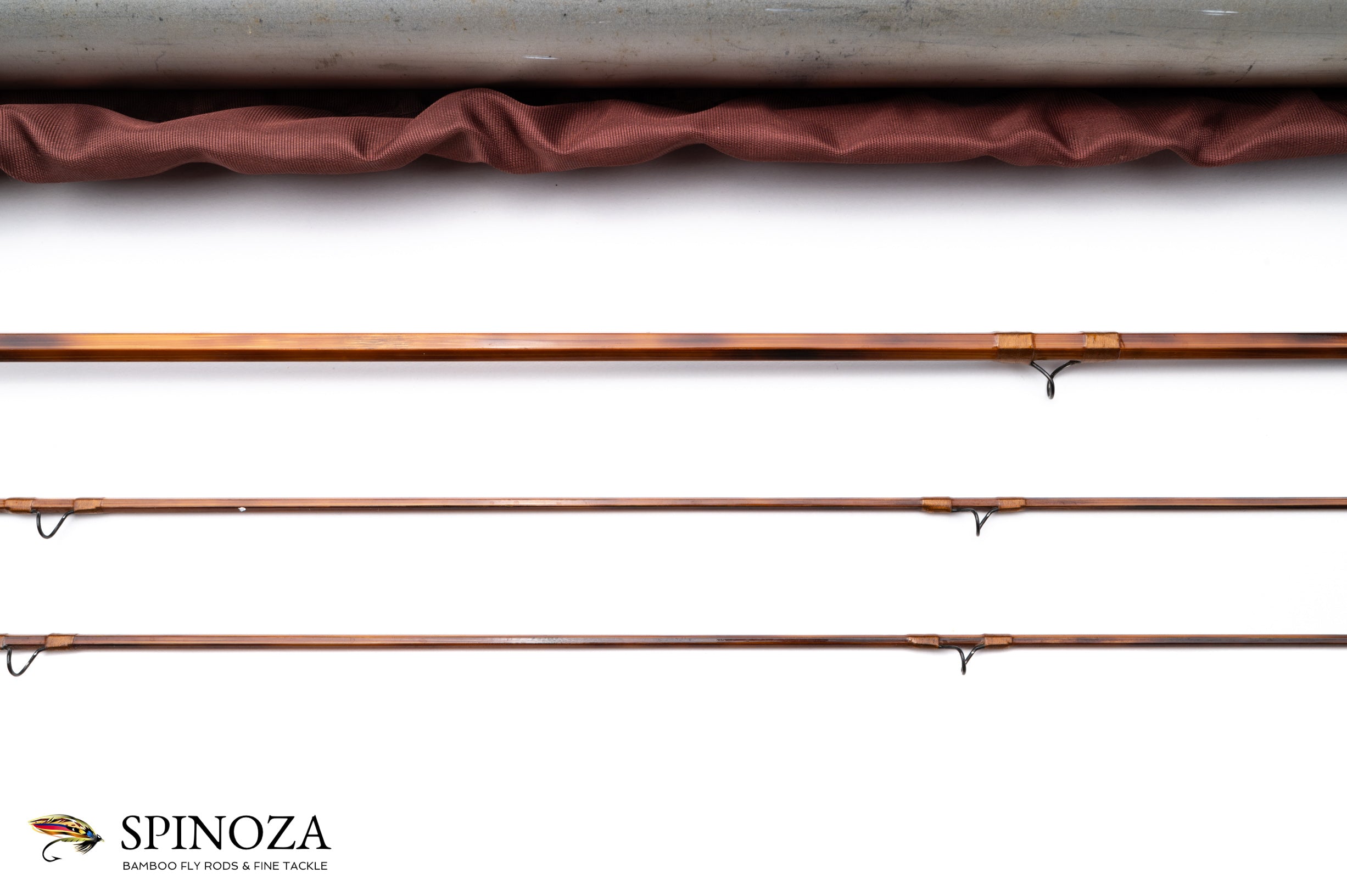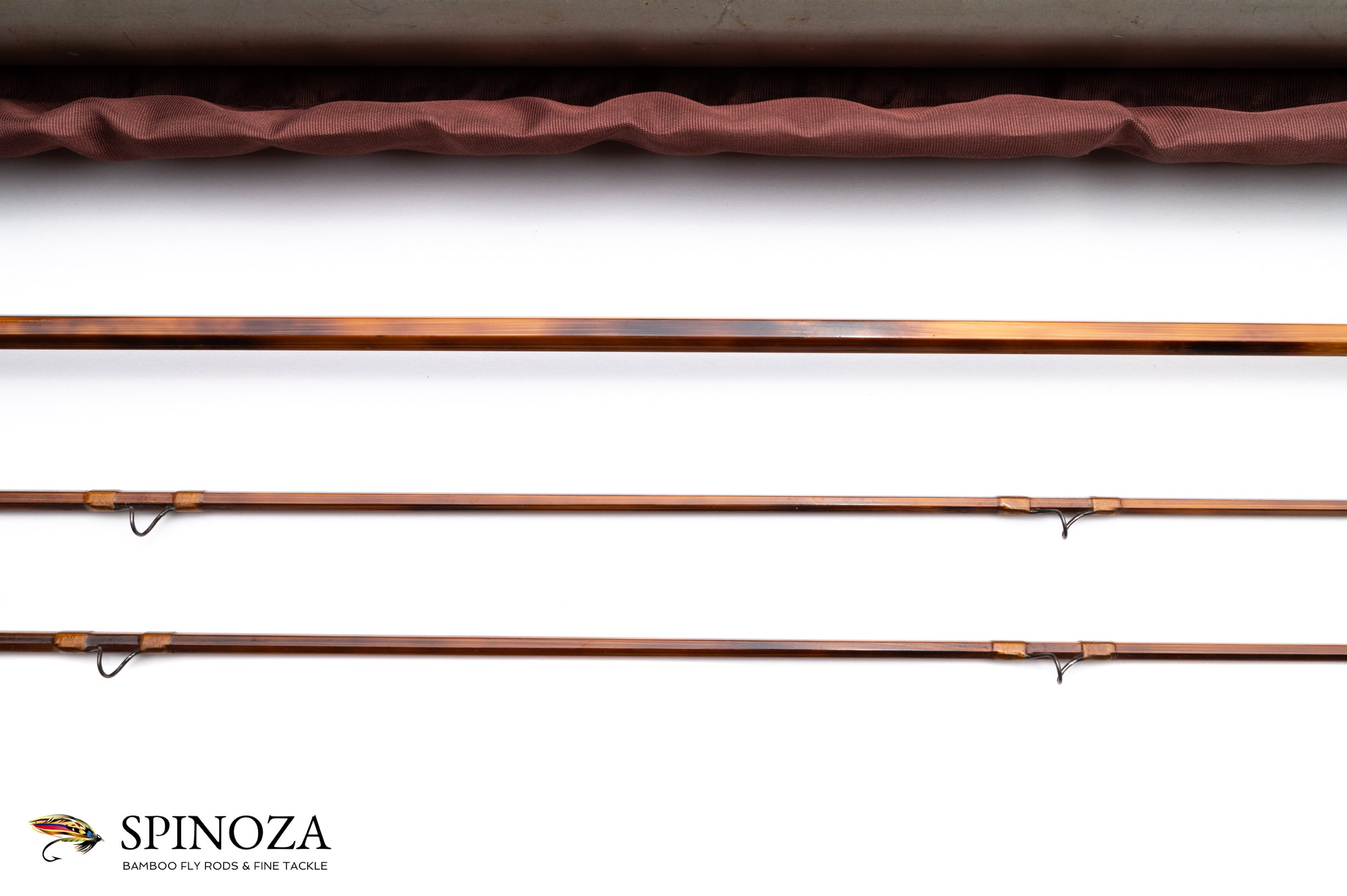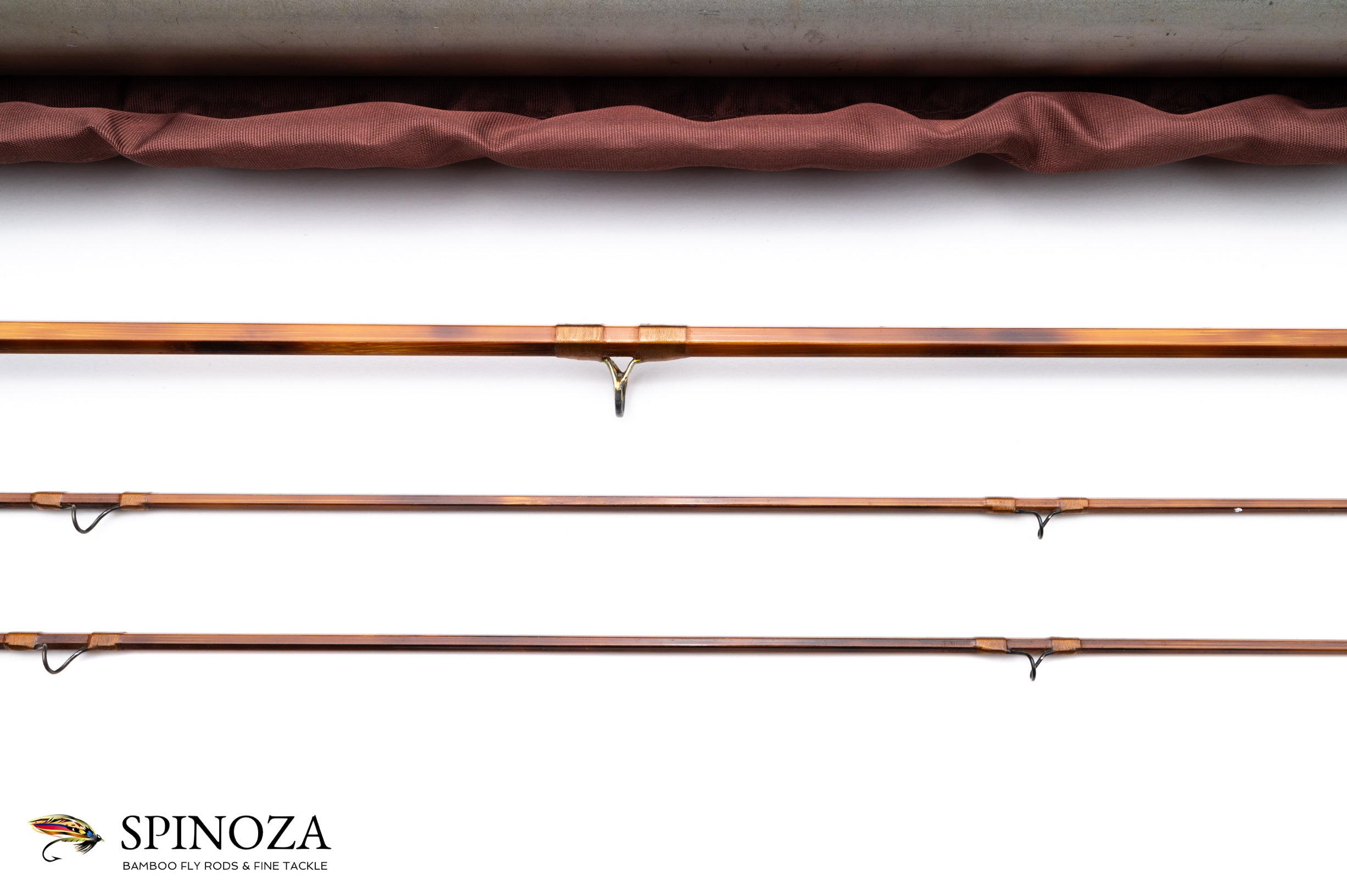 A very nice Paul Young "Midge" model bamboo fly rod, 6'3", 2-piece, 2-tip, and built for what feels like a #4. Serial #4415. Made in the late 1960's during the Bob Summers era. The rod weighs 2.2 ounces on my scale. Fully original condition and has seen very light use with no cracking at the ferrules wraps, a tiny bit of wear to the snake guides, and some light riding and soiling to the grip. That's about it, the rod is otherwise in very good shape. The cane is flamed and very dark in places, and the nodes are two opposed. The wraps are gold/tan with a carbide stripper and black snake guides. The ferrule is a Super Z with the stamp and it retains 99% of the original oxidation. The grip is a forward weighted cigar 5 1/4" long and the all cork reel seat is flatted with two black anodized slide band rings and a cork heel to retain the rings. The rod comes with the original maroon bag and tube. A very fine example of one of Young's well liked models.