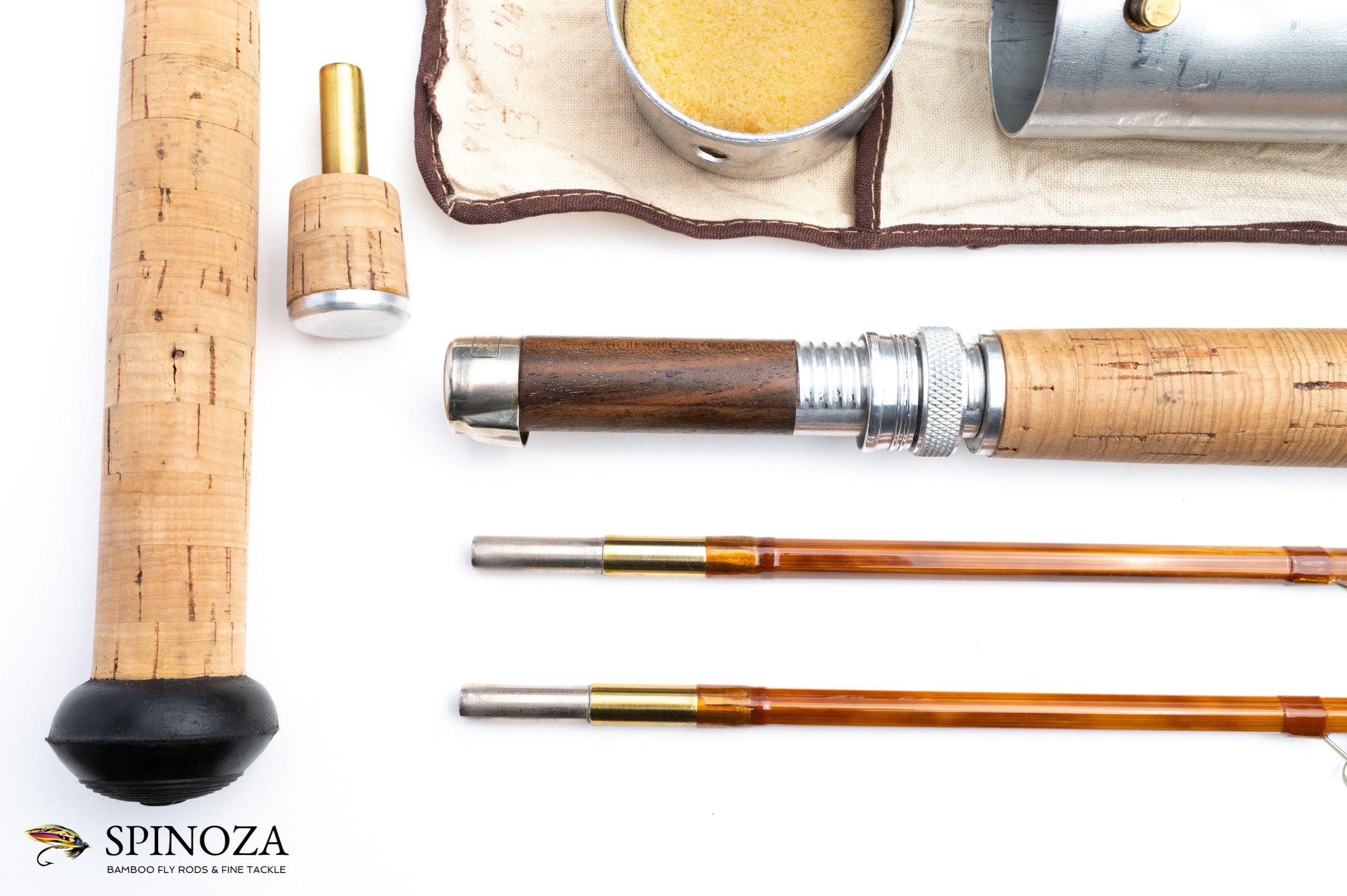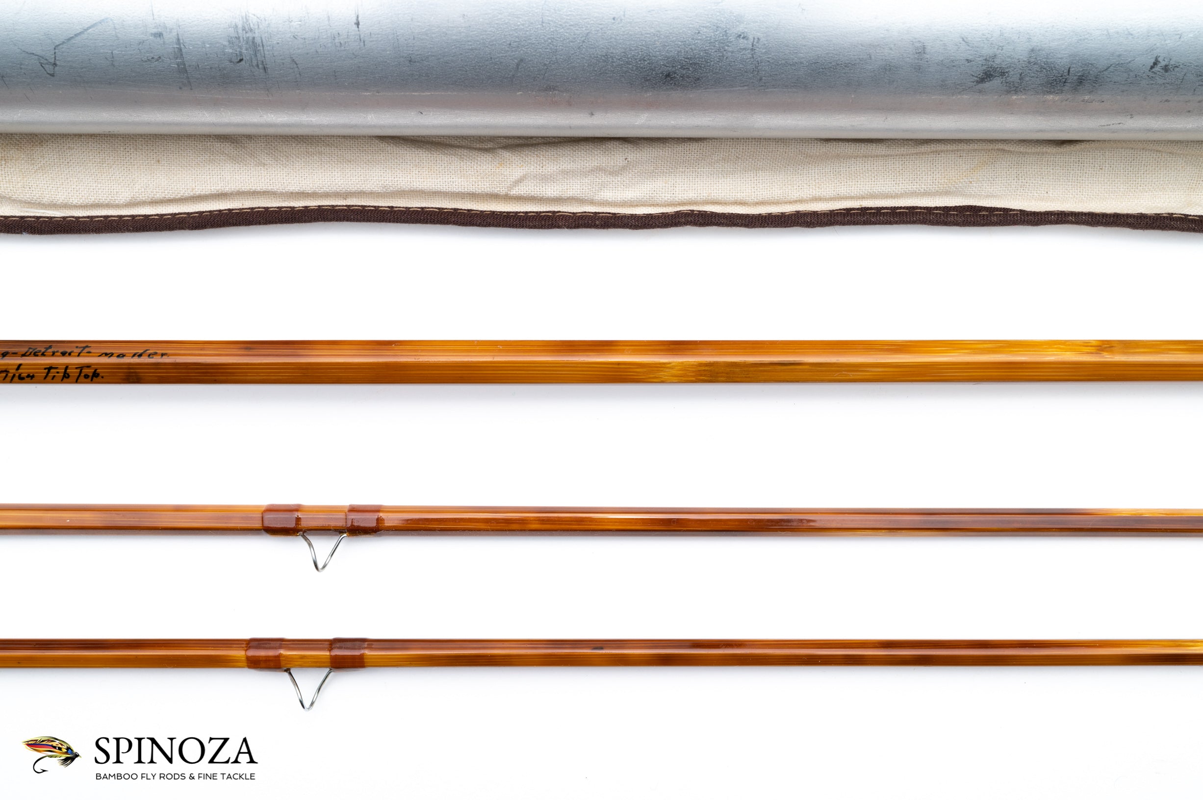 A Paul Young Parabolic 18 model fly rod, 9'3", 2-piece, 2-tip, built for a GAF line weight or the equivalent to a modern #9. Weighs in at 7.4 ounces. Lightly used condition after being refinished by Bob summers. Very powerful action. The inscription on the rod reads one flat right "Reel Seat, Etc. + refinished by RW Summers, 7/1/2013", then three flats right "Parabolic 18 - 9'3" 6 1/8 oz GAF", then four flats right "Paul H. Young - Detroit - Maker" and finally five flats right "18/64 fer 7/64 tip top". The rod is straight as a pin and the ferrule fits are good. 2 opposed node construction and mottled flamed cane. The wraps are a light brown with chrome snakes. Polished step ferrules. The keeper is on the wrap flat. 7 1/2" long grip, which tapers down from the front to the reel seat at the back. A thumbpad has been carved into the grip opposite the wrap flat. The downlocking reel seat is polished aluminum with a mortised walnut spacer. A nickel silver pocket cap is stamped "Paul H Young Co., Detroit, Mich" in a cartouche. A hole is ported in the bottom with a ferrule to receive the fighting butt which is attached to the outside of the tube. One tip has a faint pencil mark circling around teh top between the first guide and the tip top. The second tip has 2 seams that appear to be a joining issue rather than glue. The rod comes packed in a white cloth bag and an aluminum tube with a snap locking top. The fighting butt pocket of the bag needs some re-sewing.