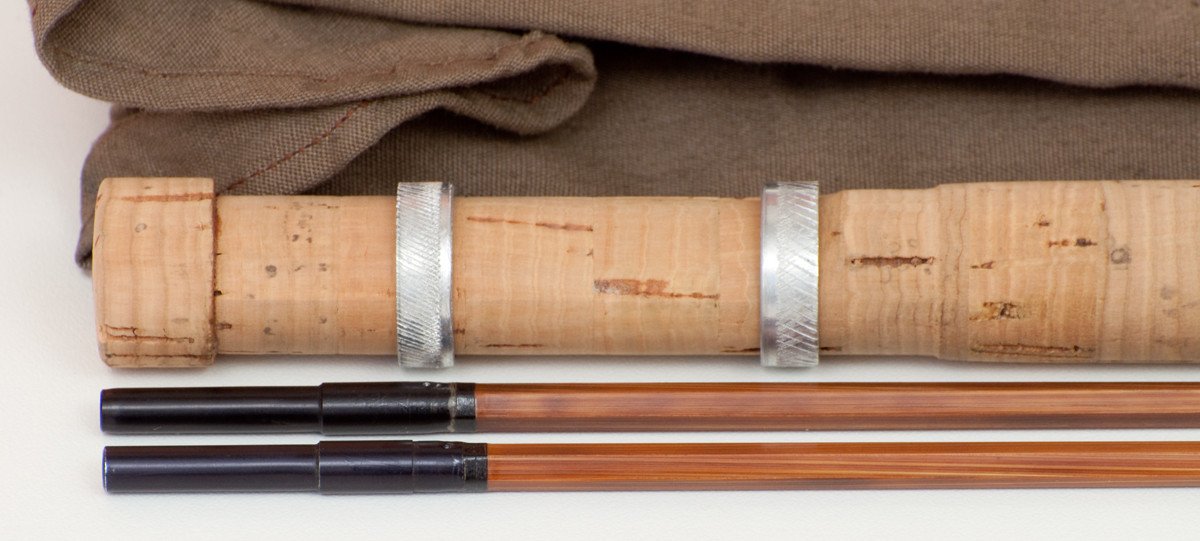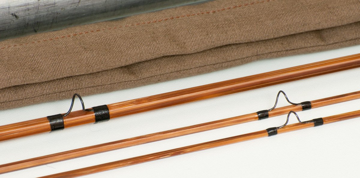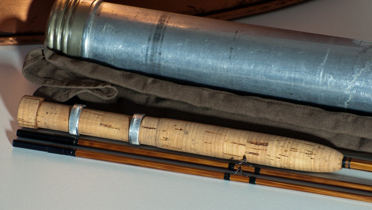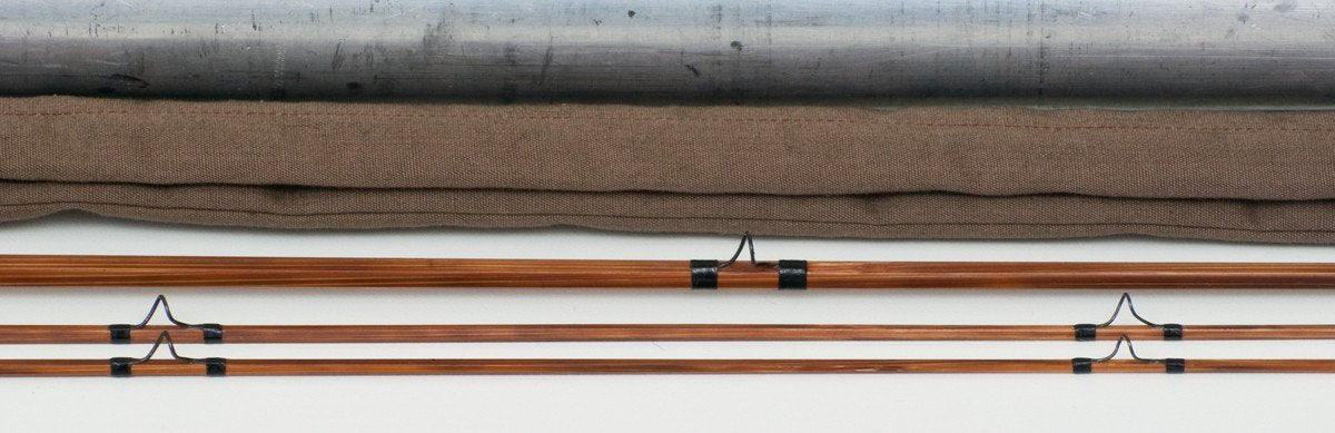 The rod has richly flamed cane, an oil finish with varnish overcoat on the script, black silk wraps and decorative spiral wraps in front of the grip, dual bright aluminum rings over all cork reel seat, size 12/64" black aluminum ferrules with a great ferrule fit. Original bag and tube. Lettered on three flats in PHY's handwriting. First flat: Lloyd Lawson - Dearborn - July 1954.Second flat:"Midge" 6' - 3" - 1.75 oz. H.E.H. Third flat:Paul H. Young Co. Detroit. Maker.