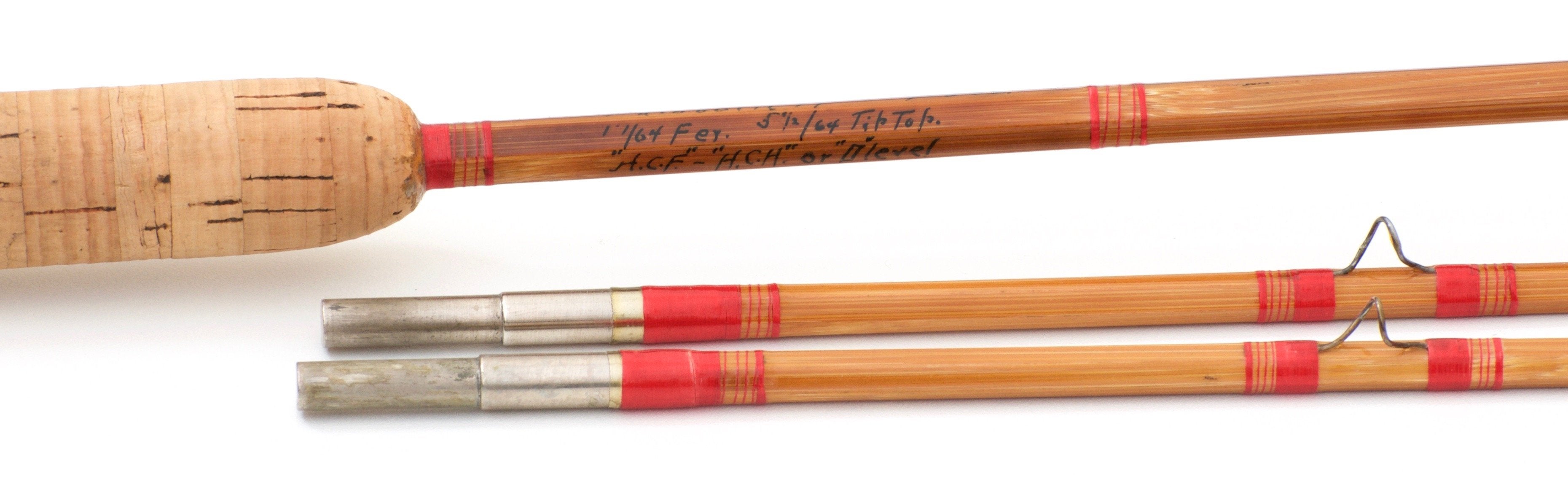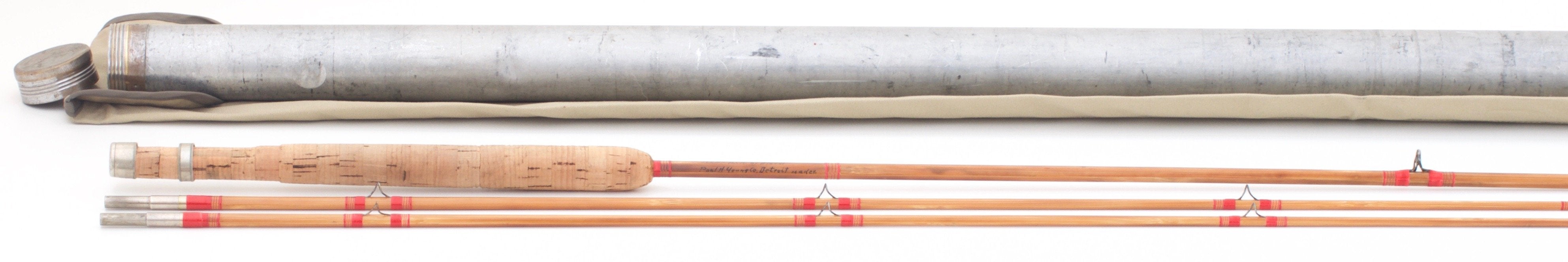 The Garrision-style grip measures 7 7/8" with mild soiling and light ridging. Bright nickel silver cap and ring reel seat over a mortised cork spacer. The butt cap features the "PAUL H. YOUNG CO. DETROIT - MICH." stamp. The step-down Pernack ferrules are size 17/64 with a great fit. The rod weighs 5.35 oz. The action is a powerful and parabolic medium-fast. A very accurate long-range casting rod. Includes a replacement bag and the original tube.