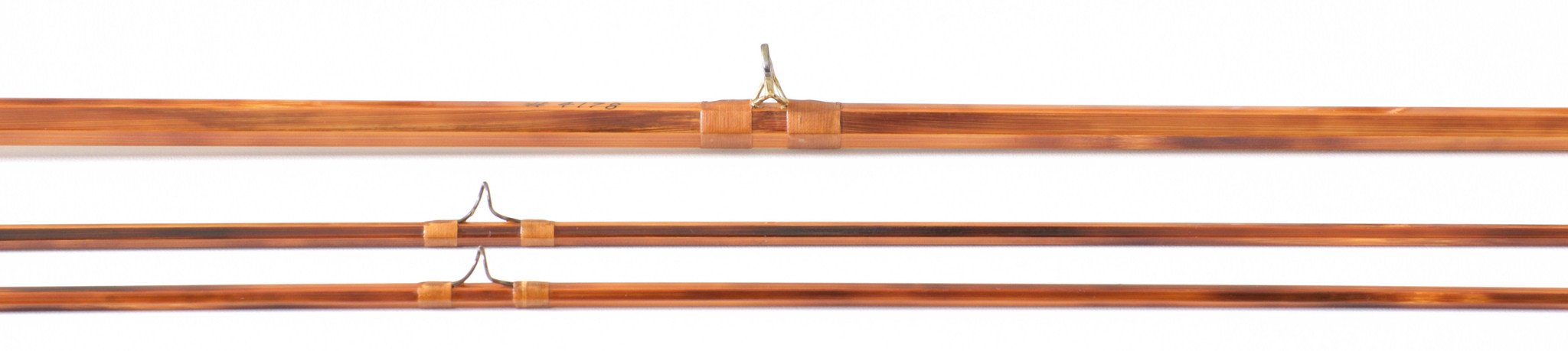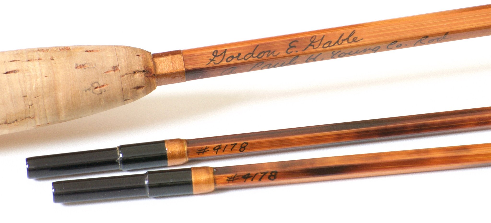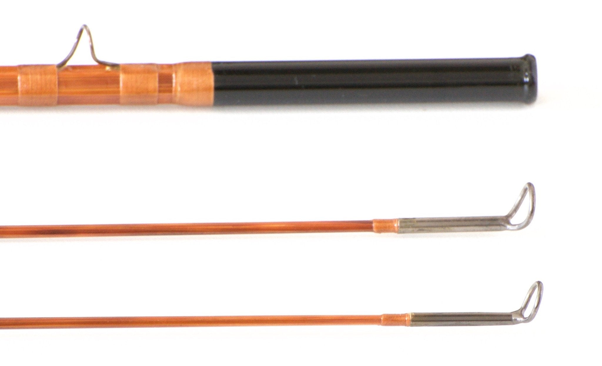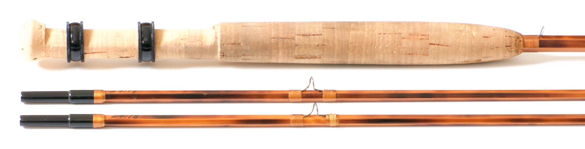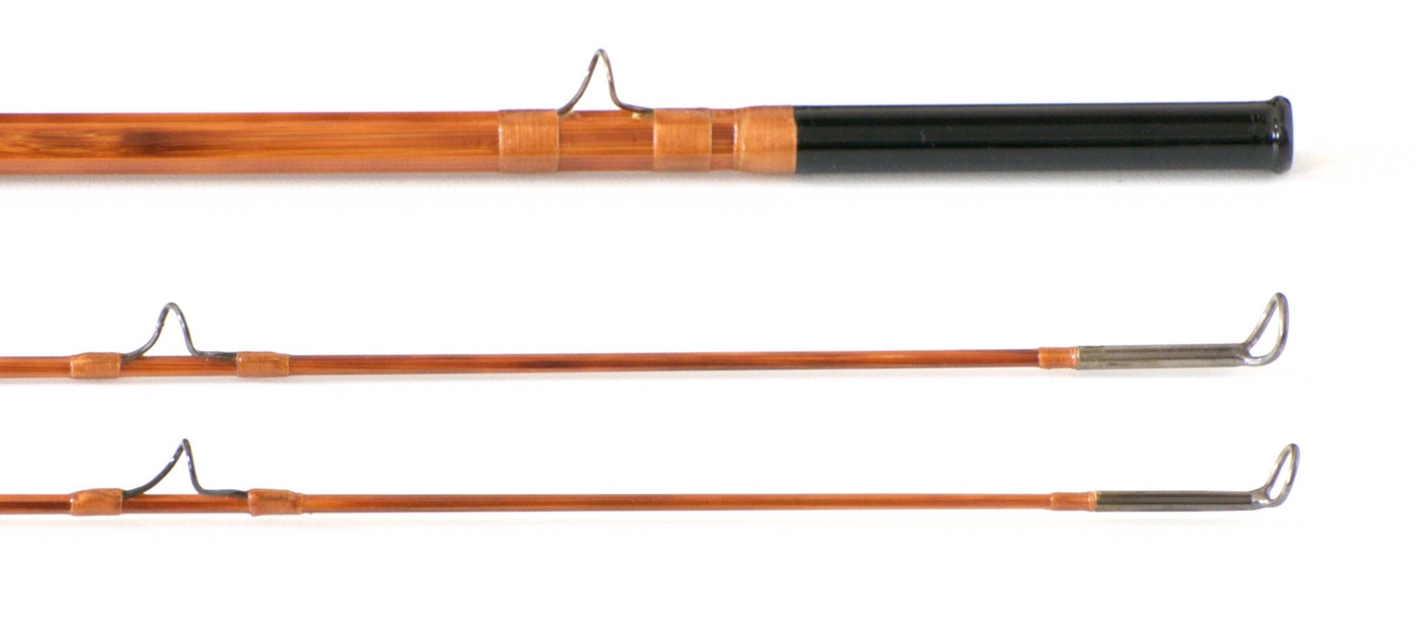 For sale here is a Paul H. Young Perfectionist bamboo fly rod from the Bob Summers era at the PHY Rod Co. The rod is in excellent and all-original condition. 7 1/2 feet with two sections and two tips. Casts a five weight line brilliantly. All sections are full length, straight and have never been repaired. The varnish finish is flawless. Two guide wraps are slightly frayed. Dual black aluminum rings over all-cork reel seat. The rod weighs 2.9 oz. and the black aluminum ferrules are size 13/64. The rod comes with its original bag and tube.