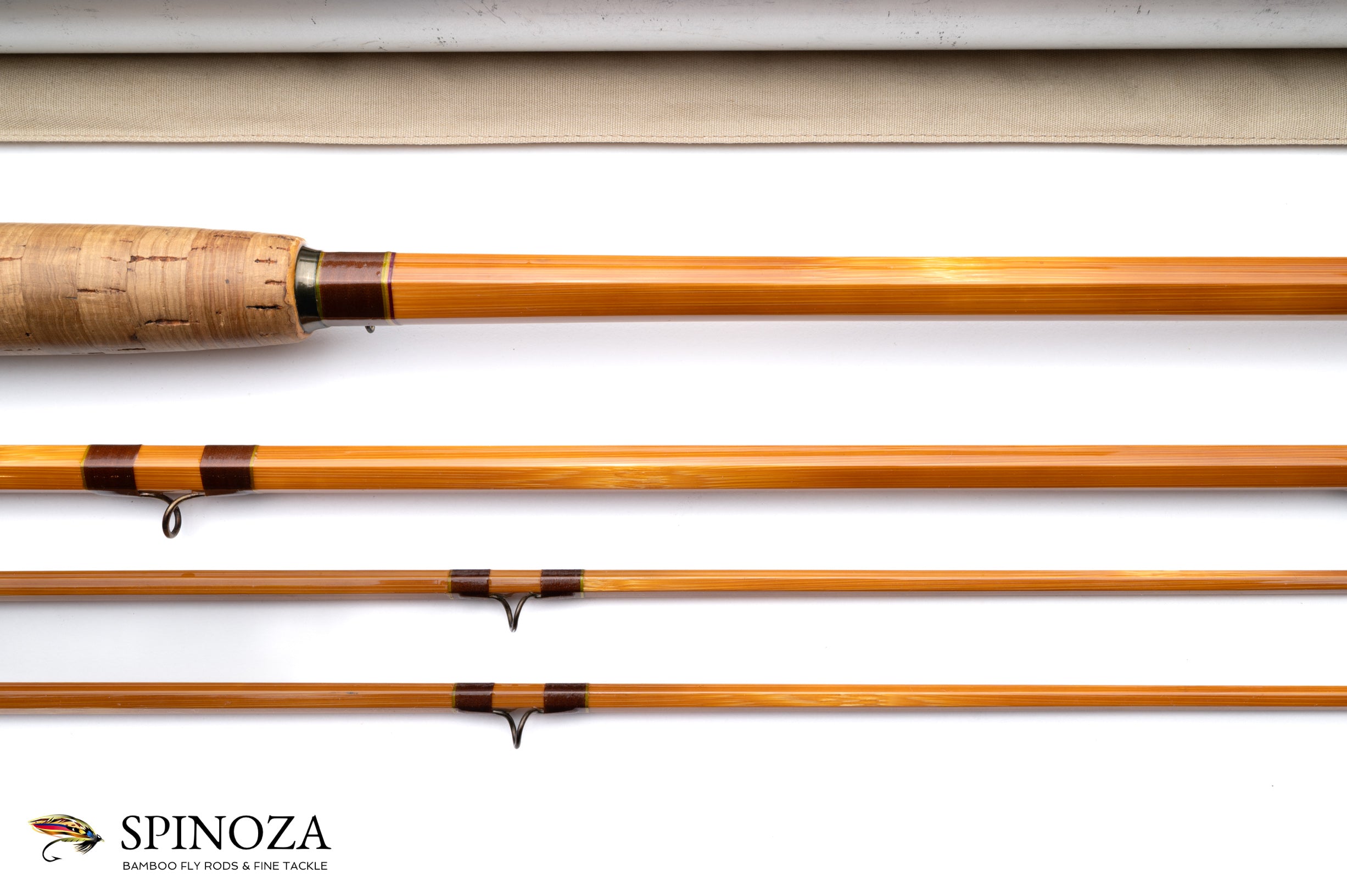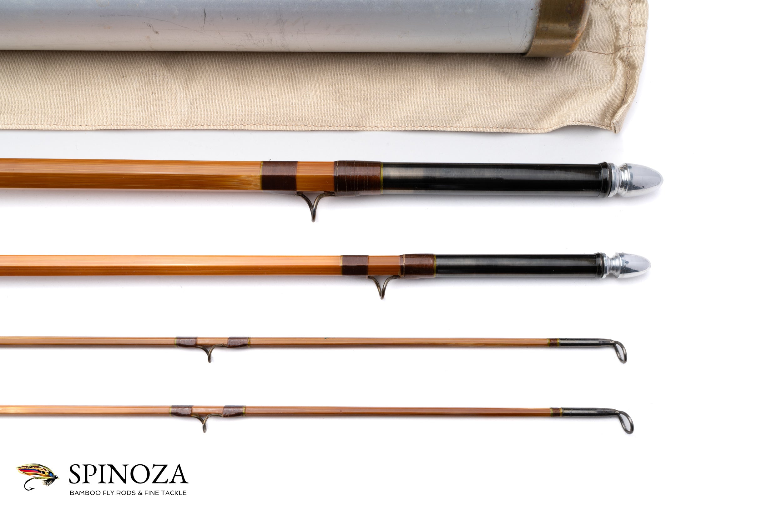 A nice EF Payne two handed bamboo fly rod, 12'6", 3-piece, 2-tip and built for what feels to me like a #8 or #9. The rod weighs 18.8 ounces on my scale. This magnificent rod has seen minimal use. There is some darkening of the grip and some cosmetic cracking at the ferrule wraps but almost no brassing anywhere, not to the bronze snakes or the ferrules. Superb ferrule fits and the rod is as straight as the day it left the Payne shop. This rod dates from the 1960’s as evidenced by the “Made for Abercrombie & Fitch” stamp located down near the rubber button. Flamed and oven-tempered cane with impeccable Payne varnish. One of the rare occasions when there is a discernible double-spiral node spacing in the butt and mid. The main wraps are brown with pale green edges and additional edges of yellow and purple at the keeper and male ferrules. Carbide stripper and bronze snake guides. The step ferrules retain 100% of their jet black oxidation and the lower ferrules are crafted from double wall tube. The ferrules have finial ferrule plugs. The front grip is 10" long and shaped to a cigar profile. The down-lock screwlock is a polished bright aluminum and has the modern Payne stamp. The insert is walnut. The lower grip is 5" long with an aluminum socket for the large rubber button. The rod packs into a tan cloth bag and large aluminum tube with brass fixtures that are all original.