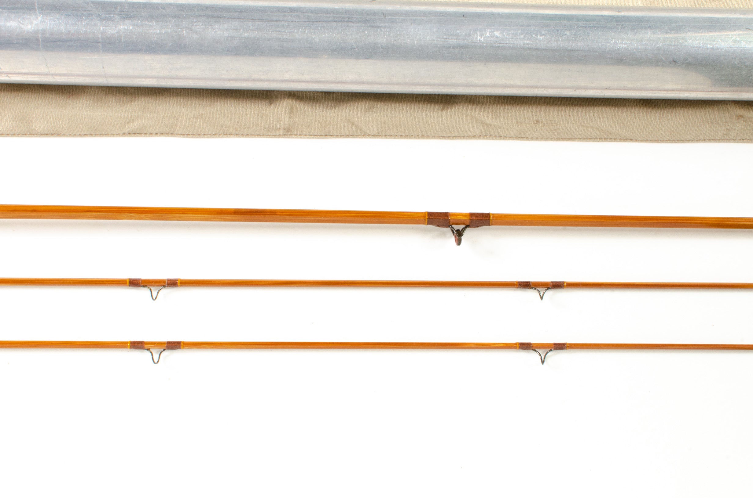 A superb Payne model 96 fly rod, 6'6", 2-piece, 2-tips. A sweet medium action for a #3 or #4 line. Very good refinished condition and it does not appear to have been fished much as there is no cracking at the ferrule wraps. The varnish is very well done. The wraps are brown with yellow edges and an extra band of purple at the keeper and the male ferrules. The #10 ferrule retains all of its oxidation. The guides are high arch snakes and an agate stripper. The grip is 5 1/4" and in the shape of a slim cigar. The cap and ring reel seat wood is varnished mahogany. Both the cap and ring are oxidized and the cap has been polished enough to make the roller die stamp illegible. No rear cork check. The ferrules are tight and the rod is ready for the river, a nice opportunity for someone who desires the Payne experience. The rod comes packed in a light tan poplin bag with a hangtag. The hangtag states "57431-20-01", "6 1/2 feet", "2 3/40z" ( my scale says 2 1/2oz), "No 96". The rod tube has the 1950's data sticker but there is no ferrule plug. Grey felt in the brass cap.