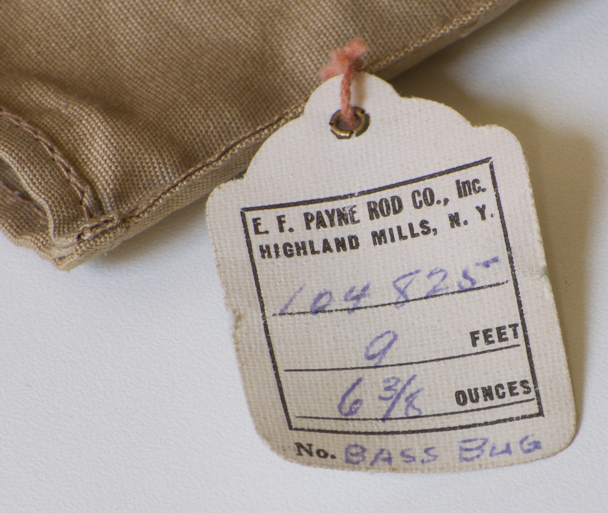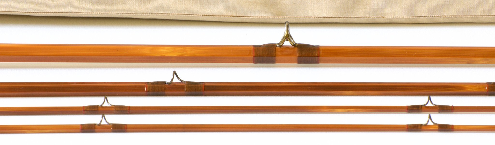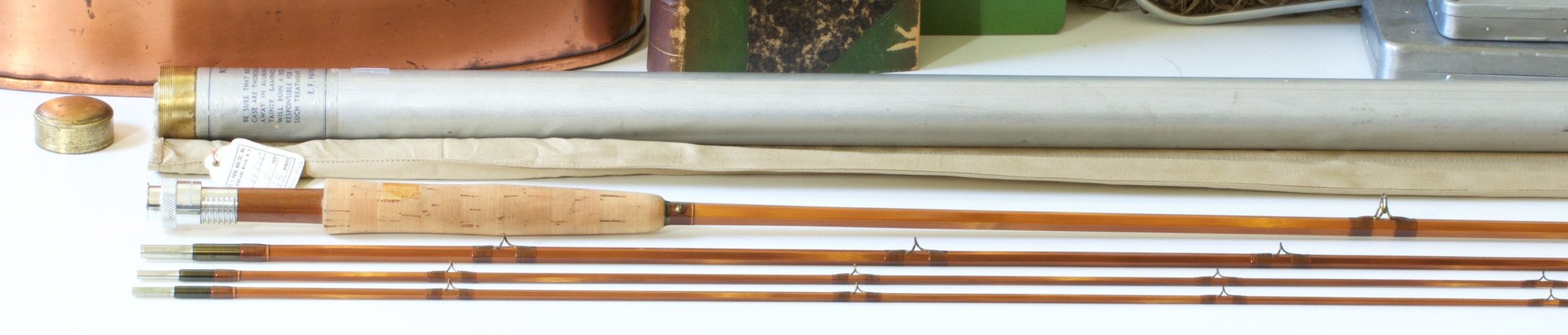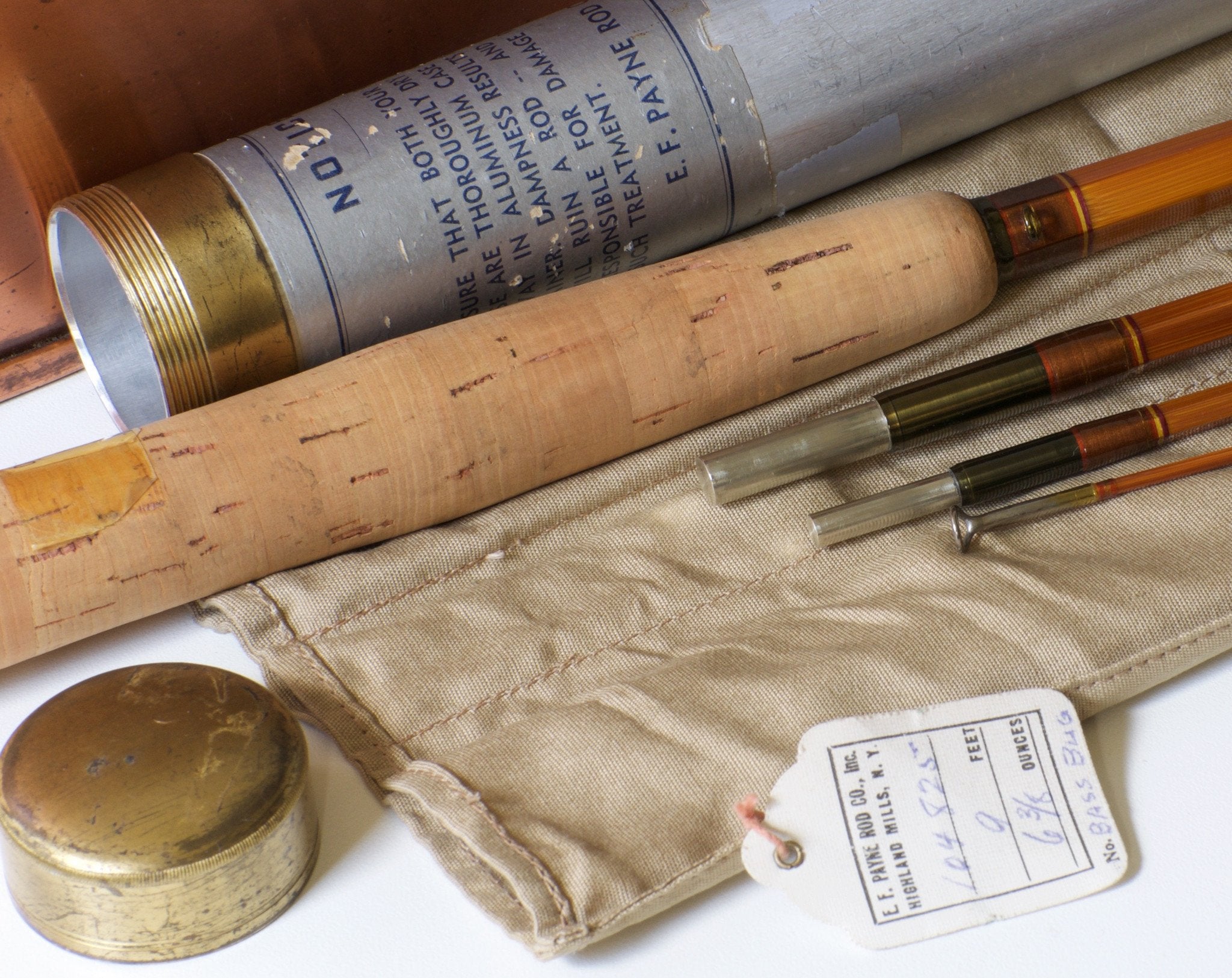 The rod is nine feet in length, three sections with two tips. The weight of the rod is 6 3/8 oz. All sections are full length and straight. The rod has been lawn cast but does not appear to have seen time on the water. The varnish is flawless. The original VL&A price tag remains on the grip. Uplocking reel seat over a Spanish Cedar spacer. The cap bears the “Payne” trademark stamp as well as the "Sold by Von Lengerke & Antoine Chicago" stamp. Wrapped in dark brown with red edges. The ferrule fit is excellent. Complete with original bag with hang tag and the original labeled tube.