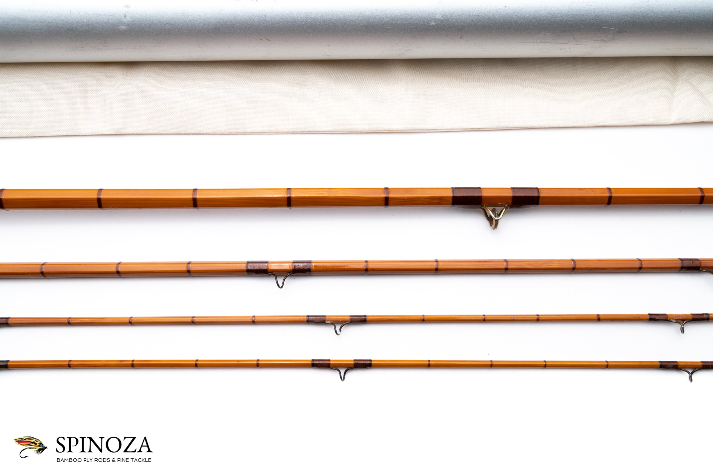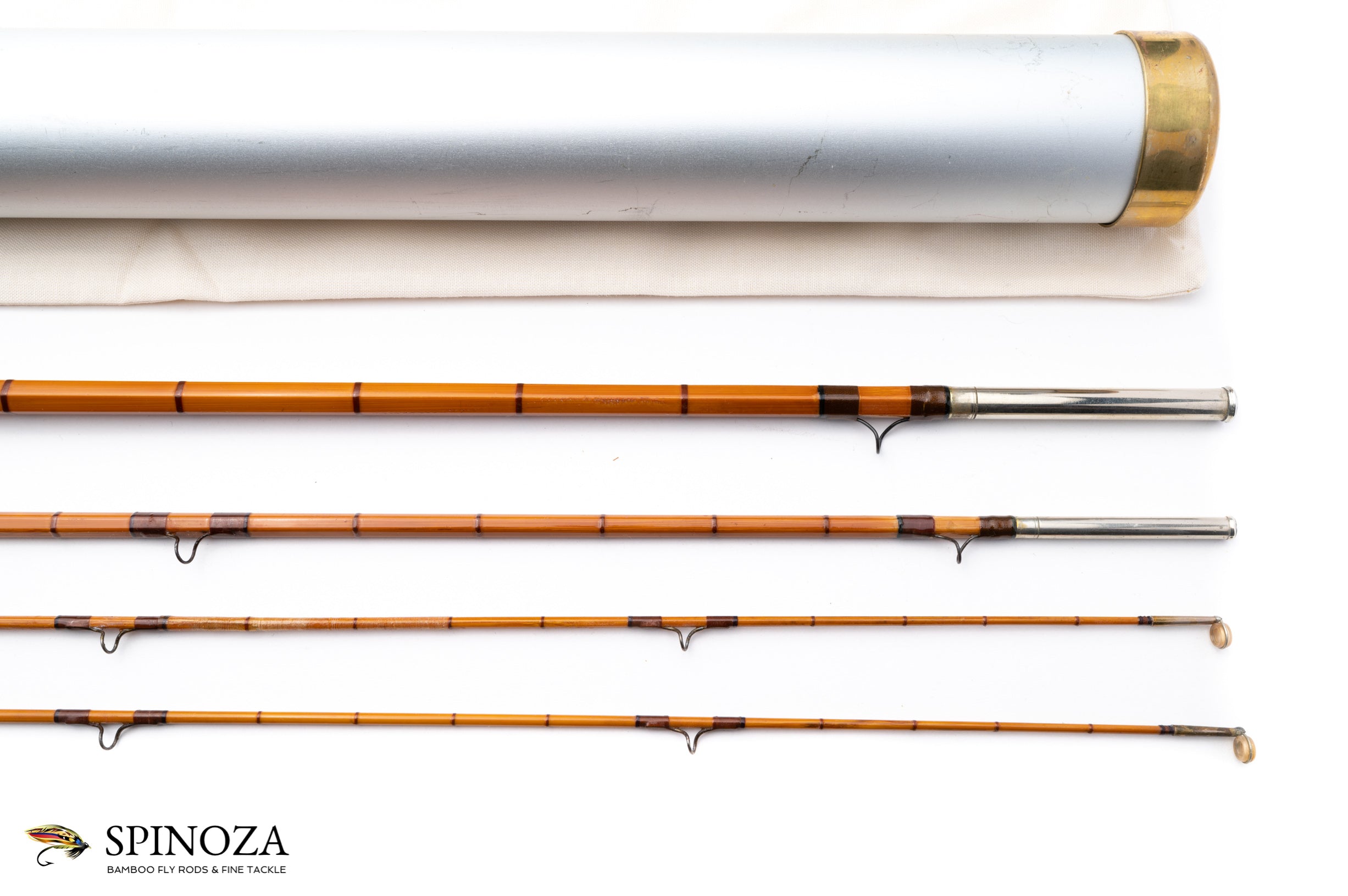 A nice EF Payne Rod Co, 9'6", 3-piece, 2-tips, built for what feels to me like a #5. Full flexing action. 5.5 ounces. Refinished. Although the ferrules and check are made of drawn tube, the all-metal reel seat and ring are rolled and soldered sheet. That, and the front cork check which bears a strong resemblance to the large and early Leonard checks. That should date this rod to about 1910-1914 during the very last years of Ed Payne's leadership before he passed away and left the rodmaking operation to Jim. I suspect it may have been originally wrapped in Chinese red though it is currently wrapped brown with darker brown edges and an extra band of yellow and brown at the keeper and male ferrules. Small agate stripper and modern snake guides of black stainless steel. The ferrules are polished bright and in the pot belly style. The varnish is in fair condition but has some patches of bag adhesion. Agate tip tops. The grip is 6" long and tapered to a slim cigar at the front. There is considerable cork erosion from cleaning. The reel seat is all nickel silver with the slide band and soldered pocket cap that has a few dings and a brad has been used to secure it in place. The ring is also somewhat misshapen. The seat is stamped "EF Payne, Maker, Highland Mills, NY" in a cartouche. The rod is full length and in very fishable condition, a wonderful chance to fish a piece of history. Non original bag and tube. The tube should be shortened to better accommodate the rod as it is about 6" too long.