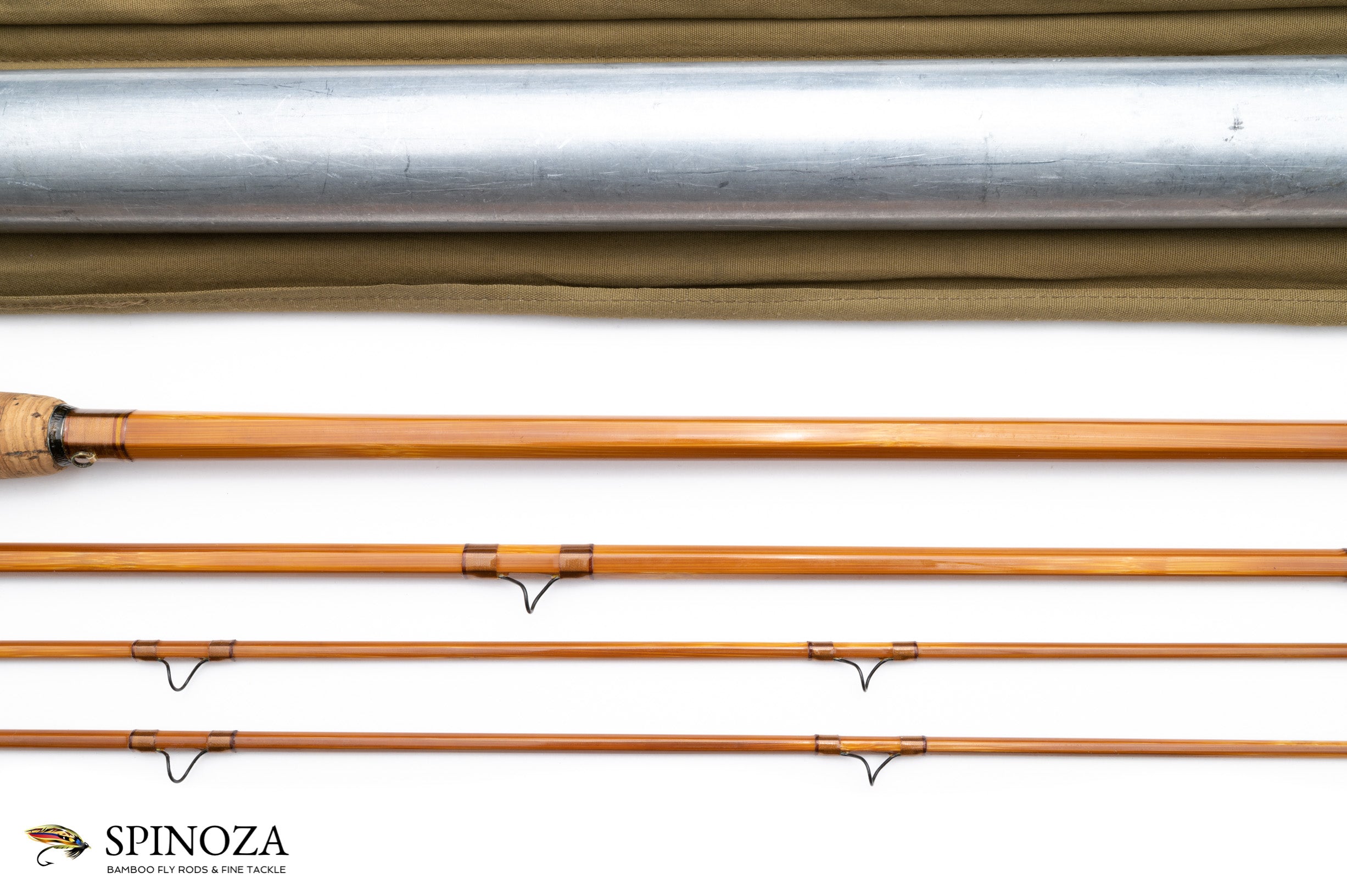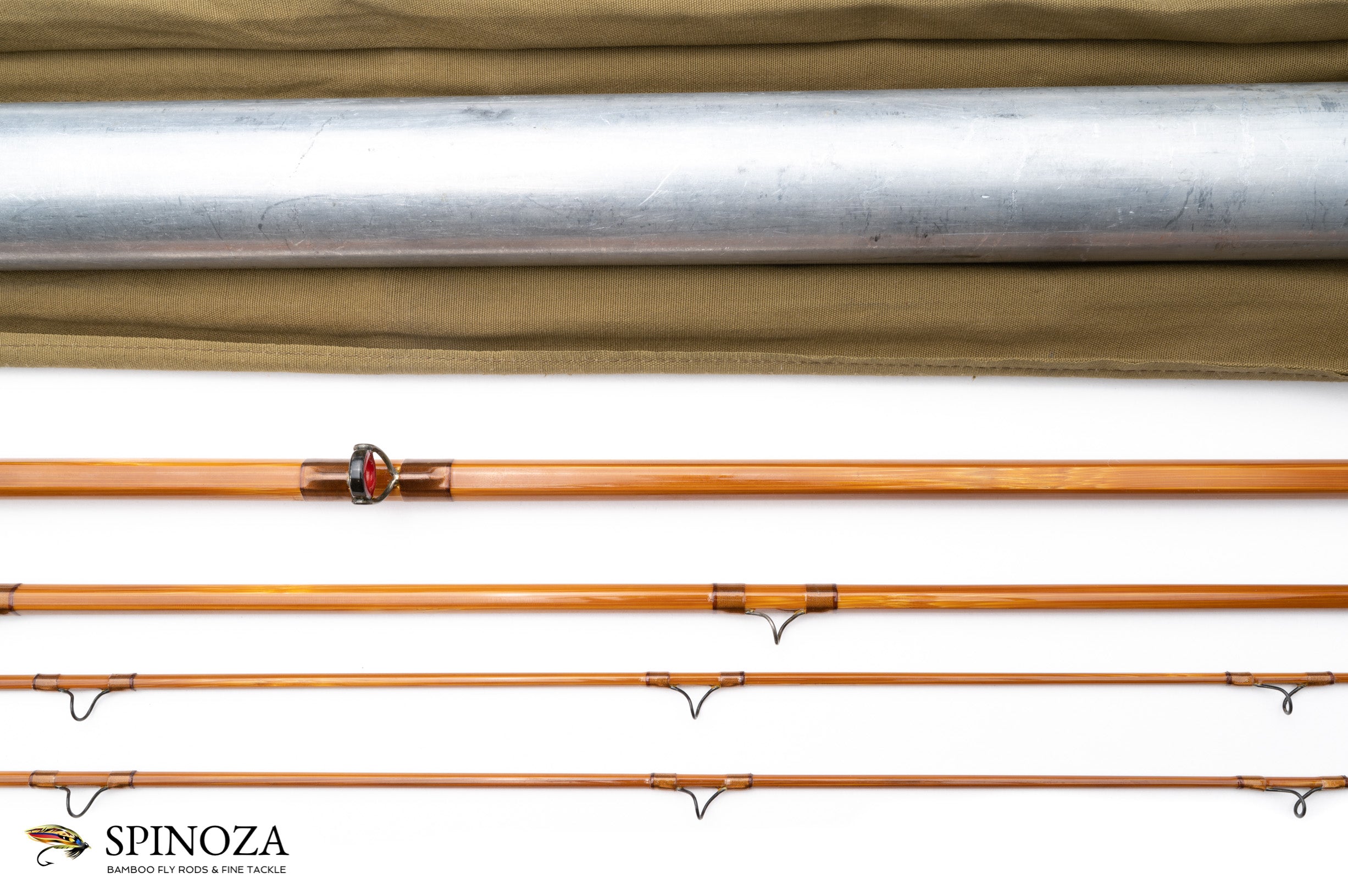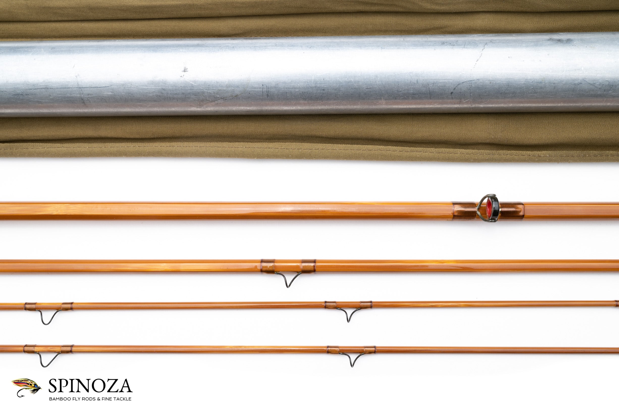 A Payne salmon rod, 9'6", 3-piece, 2-tips, built for what feels to me like a #8 line. 7.1 ounces. Refinished. Medium slow action. The varnish on this rod is nice but the wraps on the rod are not quite of the same standard. The silk color is too light a brown and the edges of the wraps often have some roughness. The tungsten snake guides have been replaced with black stainless and the stripper is agateen (glass). One tip has a partial facet crack between the ferrule and the lowest guide. The second tip appears to have been splintered in the same area and has been re-glued. The grip is a Western style so often favored by Jim Payne and is 7" long. It has some soiling but no ridging. Uplocking screwlock seat of aluminum which is stamped "Payne" in a cartouche and "Reg Us Pat Off" beneath it. The spacer looks like spanish cedar. The ferrules are tight but could use a mild cleaning. The tips have a sweep and could use some straightening. The rod packs into the original olive poplin bag (though the tag is missing as is often the case) and comes in the original aluminum tube with brass fittings.