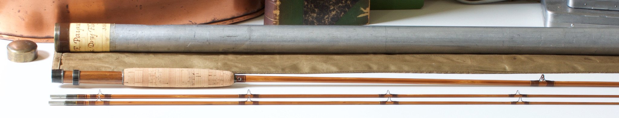 For sale here is a Payne Model 100 bamboo rod in excellent condition. The rod weighs 3 1/4 oz. with cap and ring reel seat over a Spanish cedar spacer. 7 1/2' 2/2, best with a DT4. The reel seat bears the “Payne” trademark stamp as well as the Sold by Abercrombie and Fitch stamp. Red agate stripping guide. The Model 100 is one of Payne’s most popular tapers, with a more medium action as compared to the slightly heavier Model 101 which was a faster action rod. All sections are full length and straight. The size 12/64 ferrule fit is perfect. Complete with original bag and tube. Steve Blake rewrapped the hook-keeper silks but it's difficult to notice.