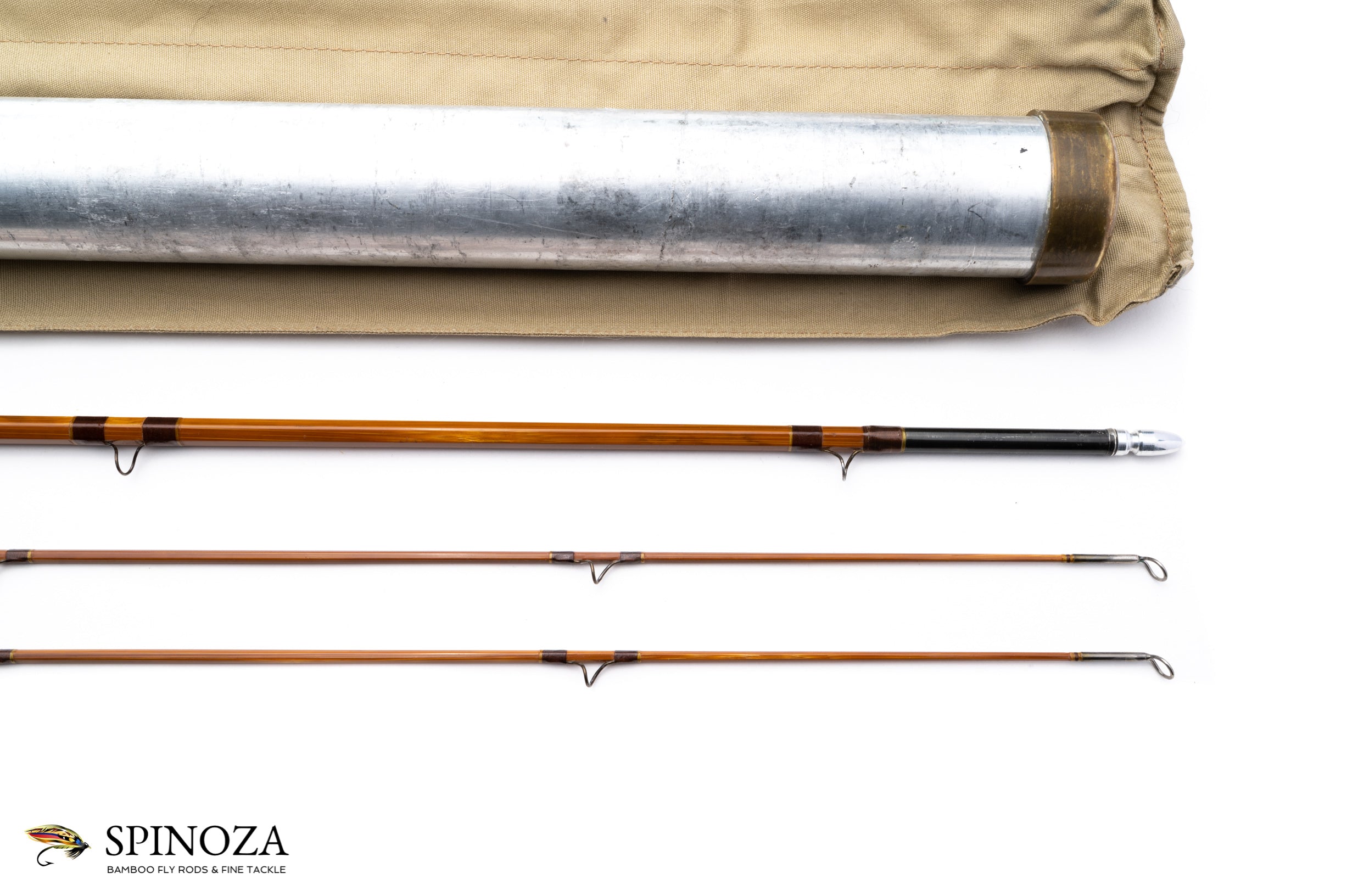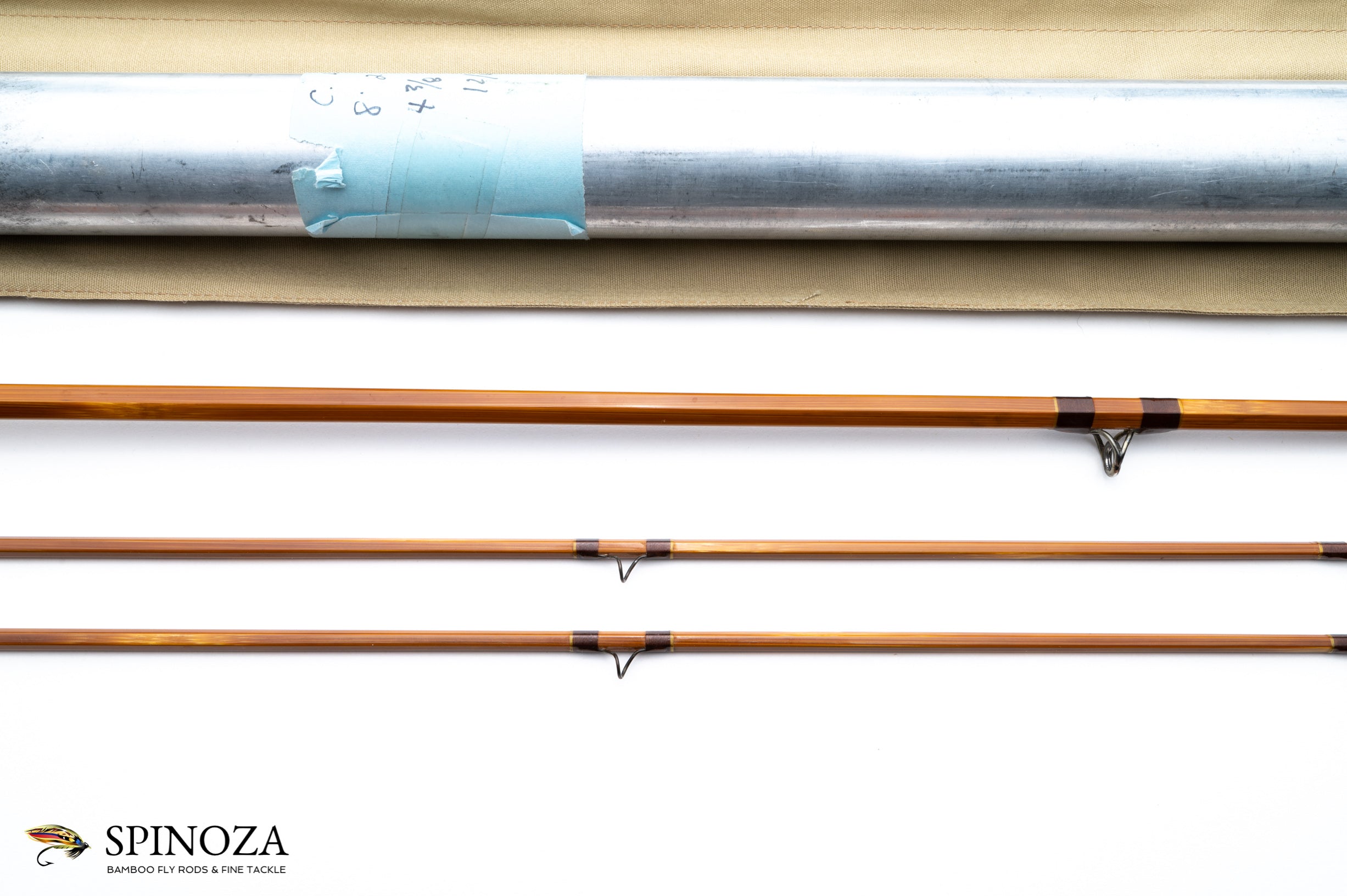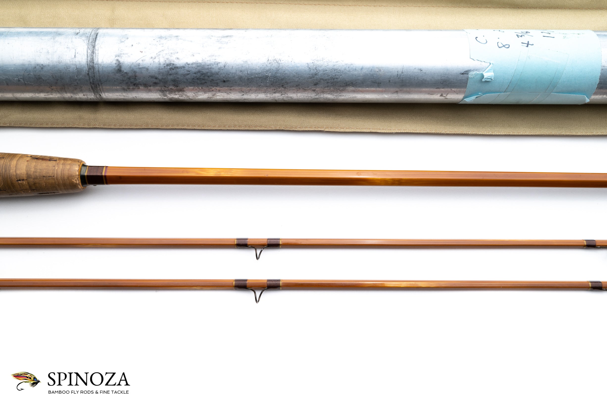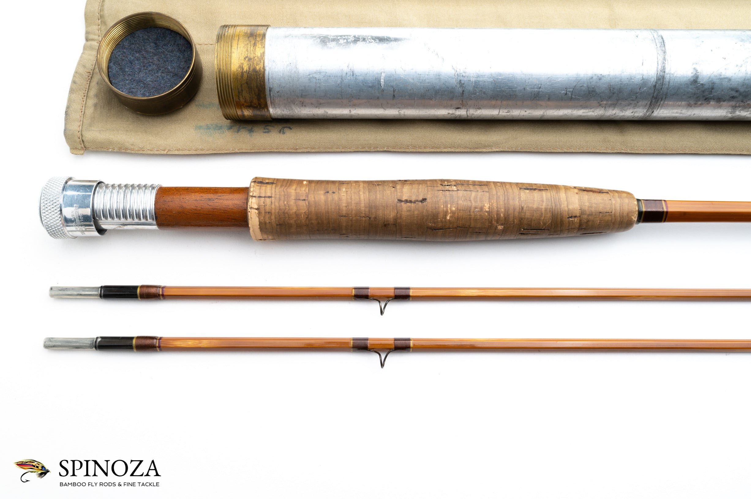 A nice EF Payne fly rod, 8', 2-piece, 2 tips, built for what feels like a #5 line. 4.4 ounces. Nice medium-fast DF action. Likely a 103 model. Used but excellent original condition, circa 1950's with the "sold by Abercrombie and Fitch, New York" roller stamp. The varnish is in very good original condition with a few very minor scratches from hooks. Faint beginnings of casting cracks at the ferrule wraps. The oxidation on the ferrules is 98% original. The ferrule fits are excellent. Wrapped brown with yellow edges and a band of yellow and purple at the keeper and male ferrules. Perfection stripper with high-arch perfection snake guides. 6" western style grip in all original uncleaned condition. The reel seat is an uplocking aluminum screwlock with the stamp "Payne" in cartouche and "Reg US Pat Off" as well as the A&F stamp on the reverse. Spanish cedar spacer. All original Paynes have become so hard to find these days. All original bag and tube but no hang tag. Includes the original ferrule plug.