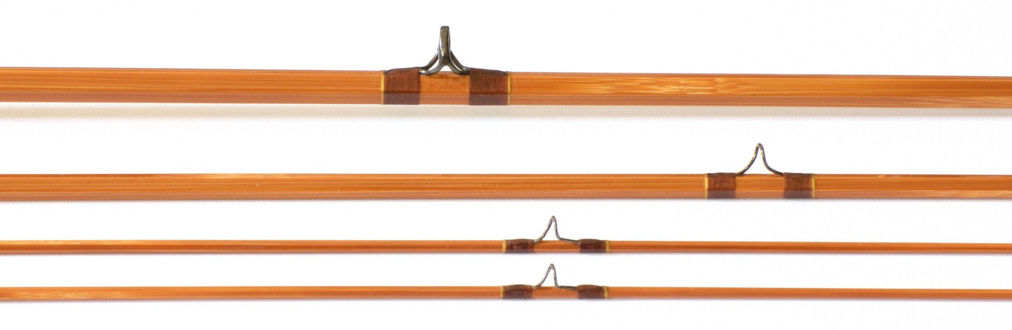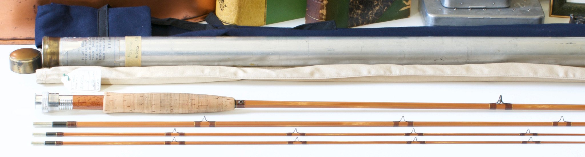 For sale here is a Payne Model 200 bamboo rod in excellent plus and original condition. 8 feet, 3/2 for a DT4 line. Made for Abercrombie & Fitch. Medium fast dry fly action. This is one of the best casting bamboo rods I've ever experienced. Ferrules are size 8/64 and 14/64. Uplocking reel seat over spanish cedar insert. No issues with the exquisite cane/node work, varnish, or the wraps. Original bag, labeled tube, hang tag, and ferrule plugs. Weighs 4.15 oz.
