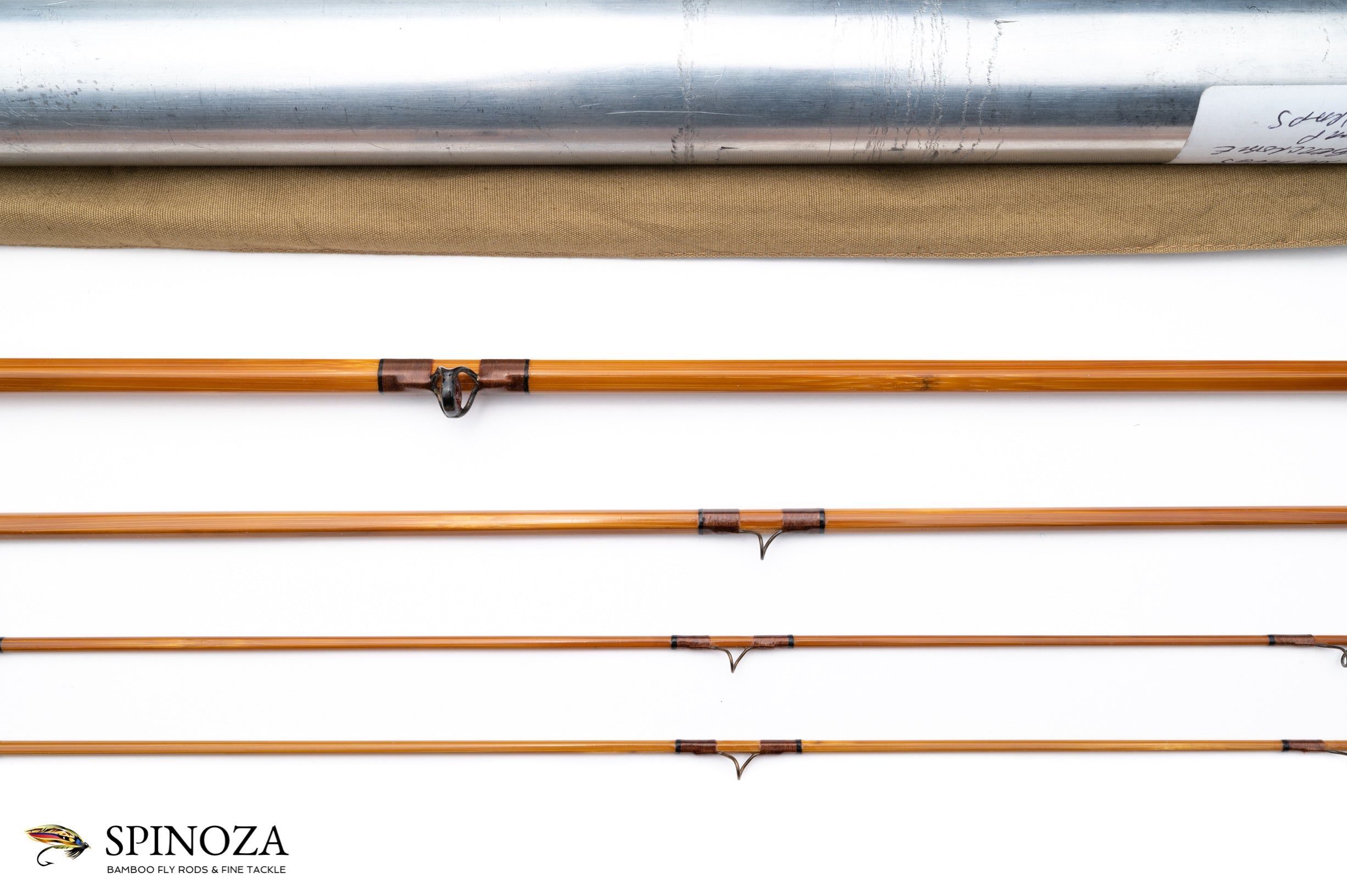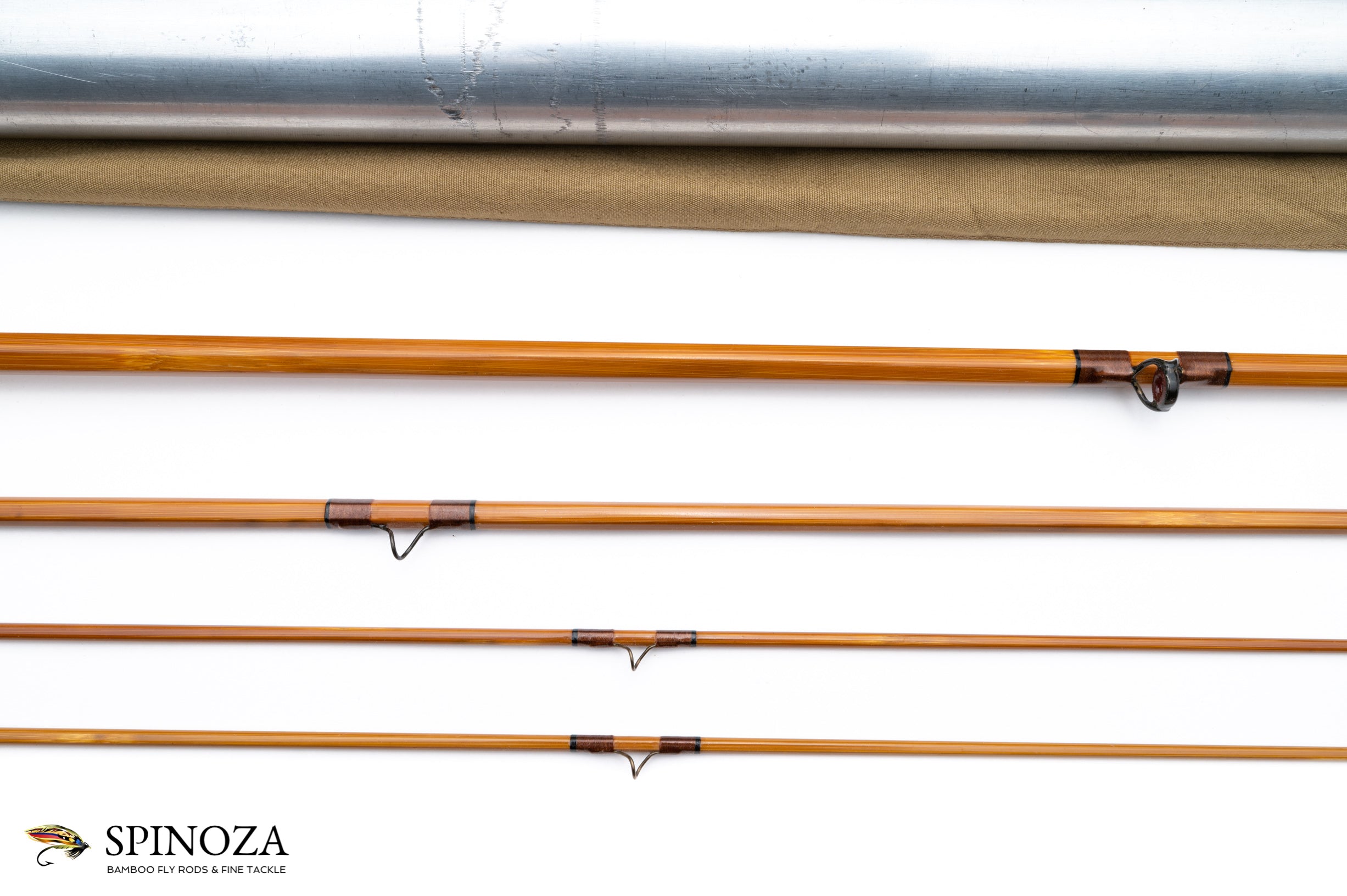An excellent Payne model 204 fly rod, 8'6", 3-piece, 2-tips, built for a #5 (I think it would also carry a #6). The hang tag states 5 1/8 ounces but my scale has it at 5 ounces. Moderate, full flexing action. The screwlock nut bears the "Made for, Abercrombie and Fitch Co", indicating that the rod could have been made as late as the 1960's. The rod has been expertly refinished to the original condition. The wraps are brown with black edges and a band of yellow and purple at the keeper and male ferrules. The red agate stripping guide has several small cracks. The grip is a 6" western style that has some signs of cleaning and it has a hidden pocket cap in the heel of the grip. The wood spacer is spanish cedar and the reel seat hardware is an uplocking screwlock. The nut is stamped "Payne" in a cartouche and "Reg US Pat Off". As noted it is an Abercrombie and Fitch model from the 1960's. The snake guides have modest wear, indicating some signs of light use. The rod is nice and straight and full length. The aluminum tube has a replaced pad in the brass top. About 85% of the original Payne data sticker is intact. The bag is original with the hangtag in place.