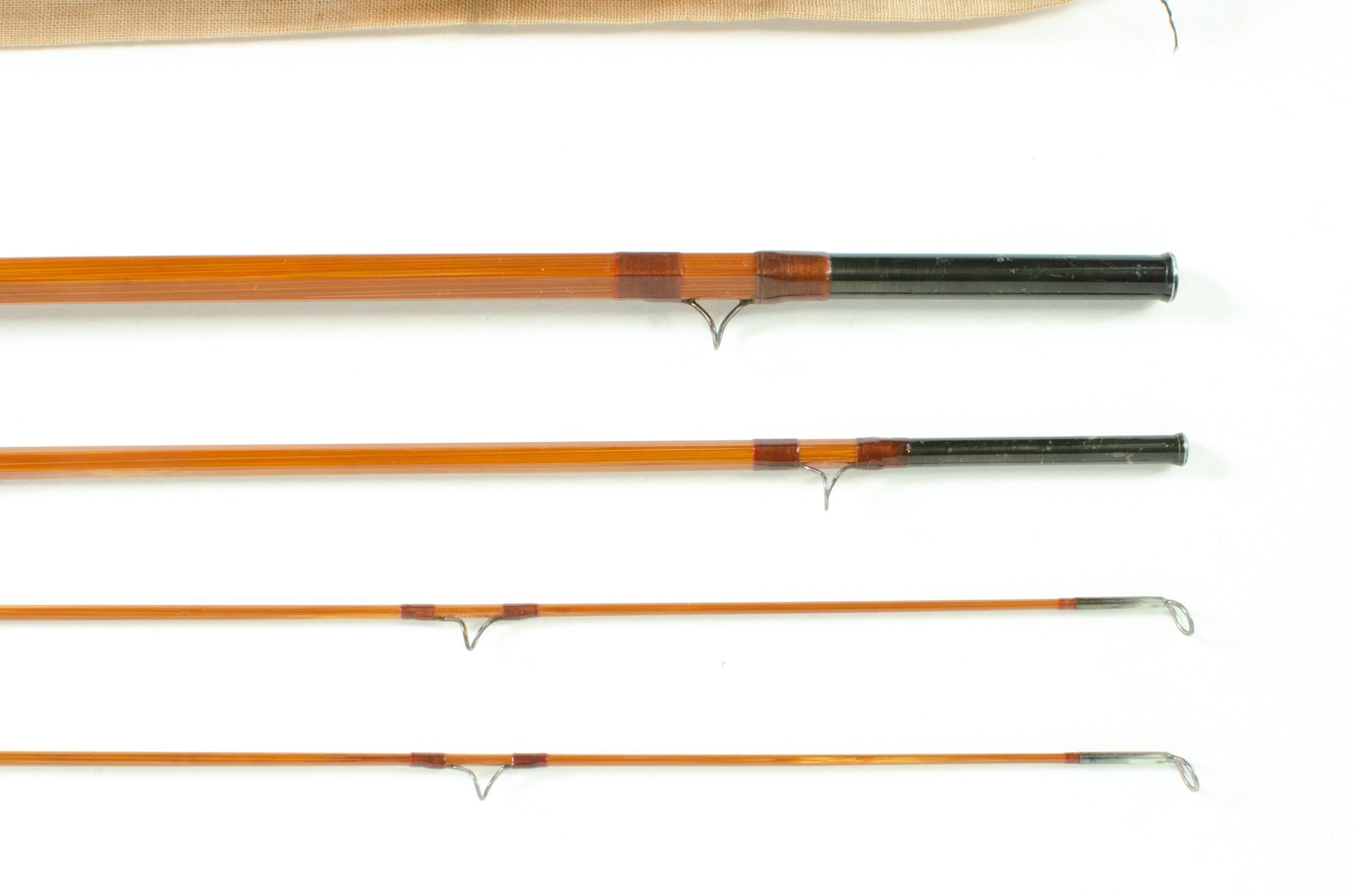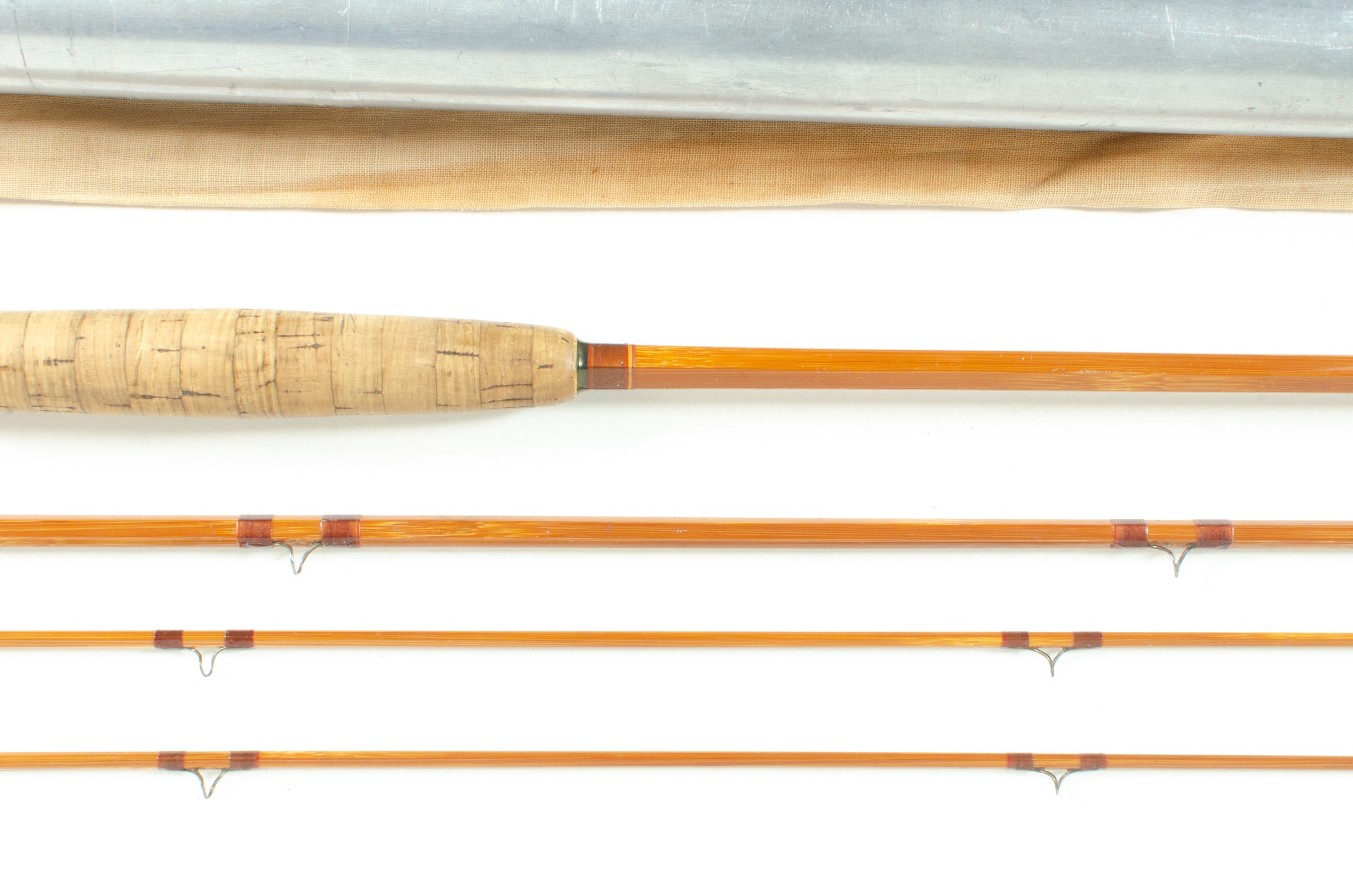 A Payne model 208 fly rod, 9', 3-piece, 2-tip, built for a #6 or #7 line. Medium fast action. Full length and with excellent ferrule fits. However, this rod has had some careful doctoring along the way. One tip has two areas of splinter damage and they have been glued down and varnished over. The entire tip had an excellent and very thin coat of varnish. Both tips and the upper mid have a downstream set. Overall, the varnish is very good with a small scrape on the mid the only problem. The wraps are brown with red edges and an extra band of yellow and red at the keeper and male ferrules. The tip tops are wrapped red-brown-red. The keeper is one flat right. The grip is a medium cigar 6" long and has been chemically cleaned at least once, witnessed by the thin dark lines between corks. Thankfully no scrubbing or sandpaper was used. The reel seat is a flatted Spanish cedar cap and ring. The butt cap has 75% of its original oxidation but the ring retains only about 5%. The cap is stamped "Payne" in the cartouche and "Reg U.S. Pat Off". On the reverse "Sold by, Abercrombie & Fitch Co., New York". The tube looks original and the cap has white felts, but no ferrule plugs. The bag is a cheap replacement.