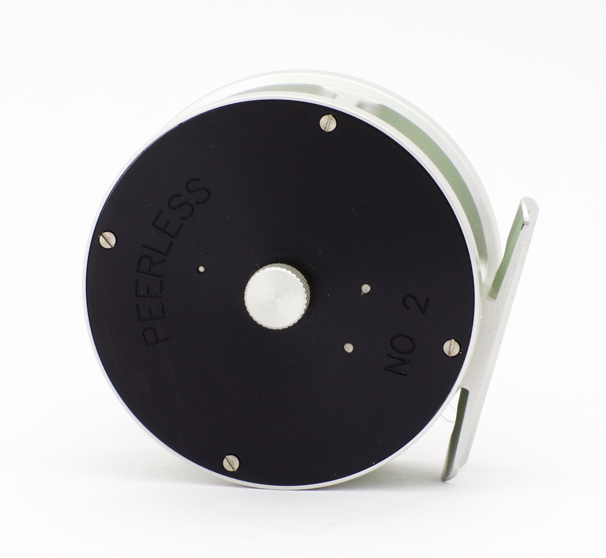 For sale here is a Peerless 2 fly reel in near mint condition with only the slightest of marks on the reel foot from being mounted on a rod. No marks exist on the frame or sideplates. Designed for a 5 or 6 weight line. 3 1/4" diameter. Fixed proprietary click check drag. The reel weighs 5.4 oz. The reel's line capacity is a DT5 plus 60 yards of backing. The reel comes with a like-new line....not sure of maker or line weight. Also comes with its original reel pouch.