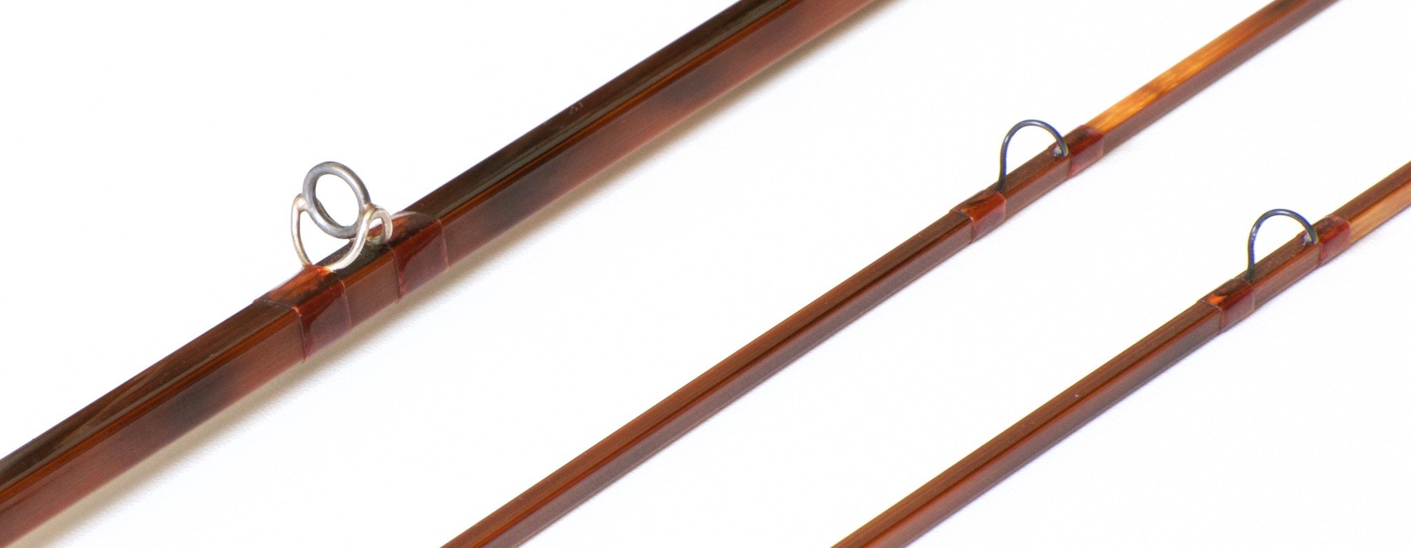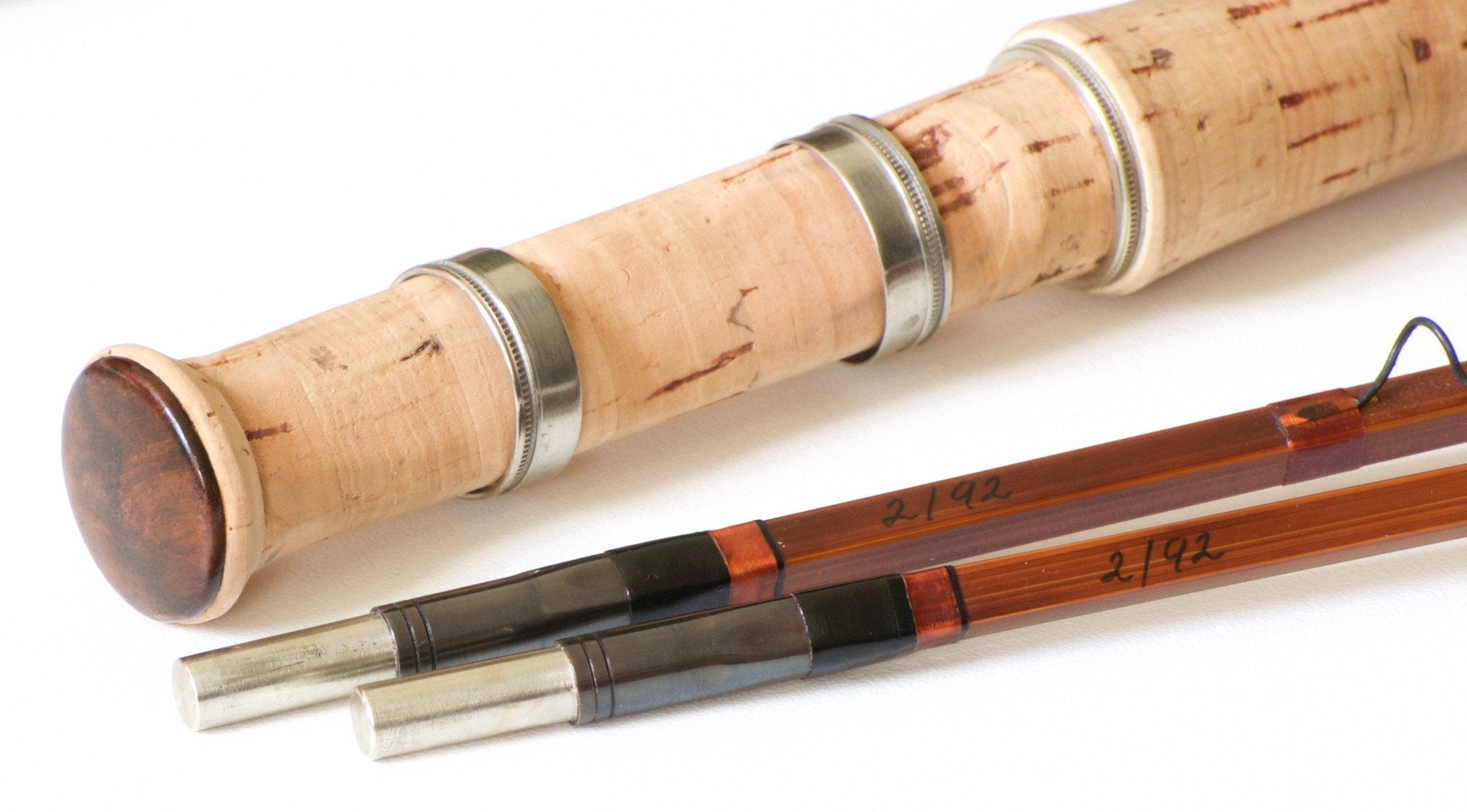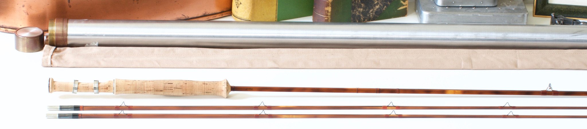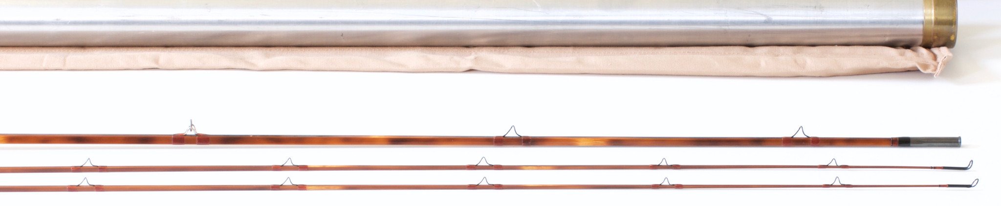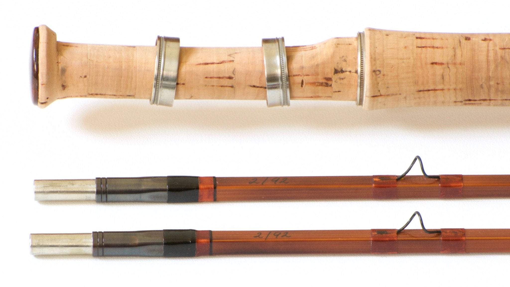 For sale here is a Per Brandin quadrate rod made in 1992. Model 764-2 P, which is based on the Paul Young Perfectionist taper. Although the model number designates a four weight line, Per actually prefers it with a five weight line. The rod weighs 3 oz. Beautifully flamed medium dark cane. Perfect varnish job as always. Modified wells grip with dual nickel silver slide bands and a walnut button at the end of the all cork reel seat. All original rod, bag and tube (made by Per) with red cloth rod tube protector. The condition of the rod is excellent plus, having seen very little use.