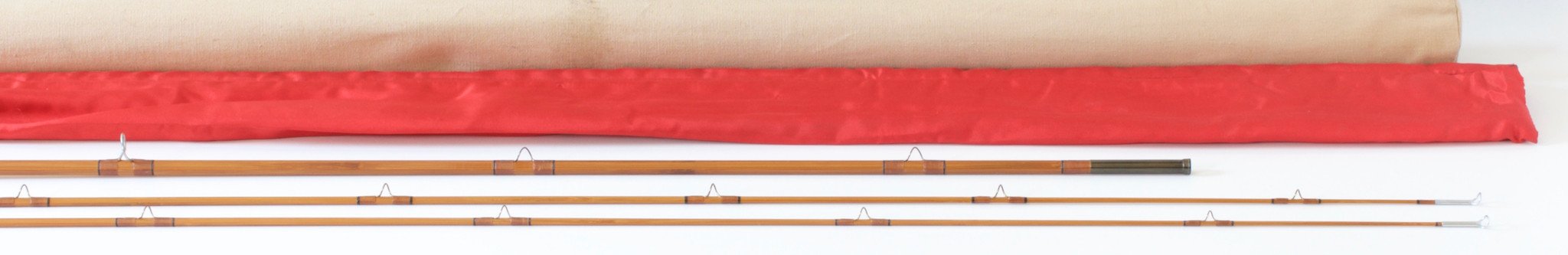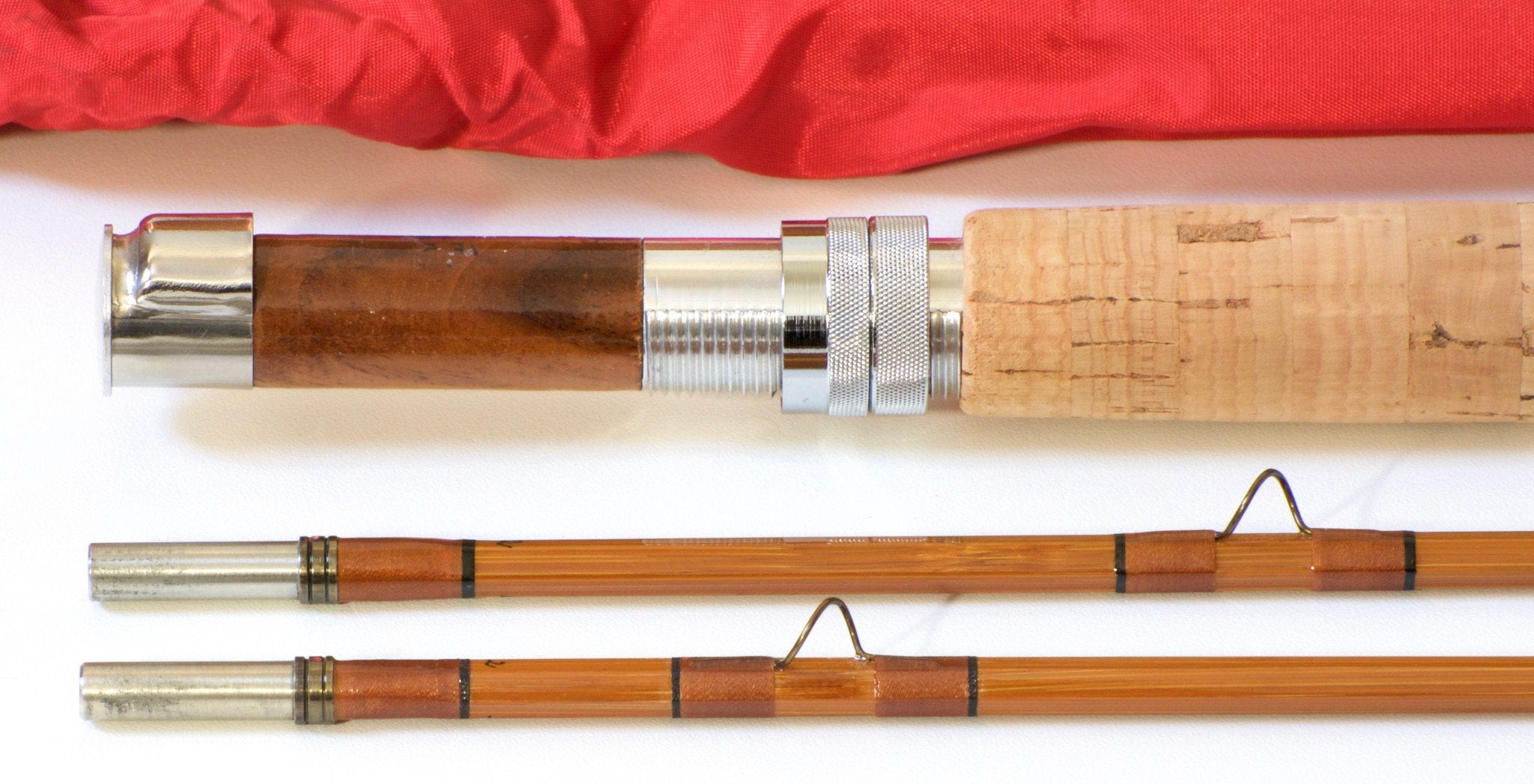 The rod features copper-colored wraps with black tipping. Red, white, and blue at the winding check; a nod to the French flag. Bronzed guides. The script remains clean and bold. Hansome burl walnut winding check. Cigar grip measuring 6 3/4" with little to no soiling. Bright aluminum down-locking reel seat over a burl walnut spacer. Blued ferrules with red witness marks. The male ferrules are tapered to account for wear over time. The fit is perfect. The rod has a staggered ferrule design which helps with the rods parabolic action. The butt is 6" shorter than the tips. Unfortunately, the ferrule plug is missing. The tips have differing guide placements and one is heavier than the other. The rod weighs 4.85 oz. with the light tip and 4.95 oz. with the heavy tip. The heavier tip has a longer wrap at the tip-top. The action is on the faster side of medium-fast, parabolic, and authoritative yet smooth. A terrific rod for big flies or if the wind picks up.