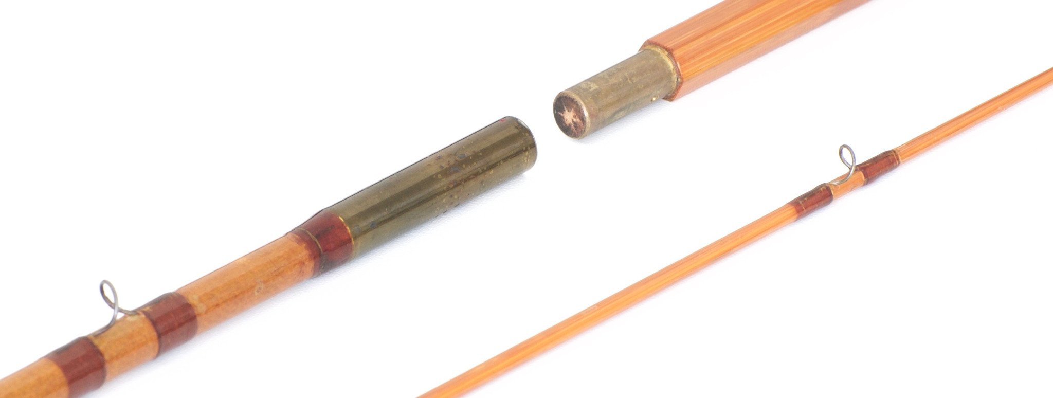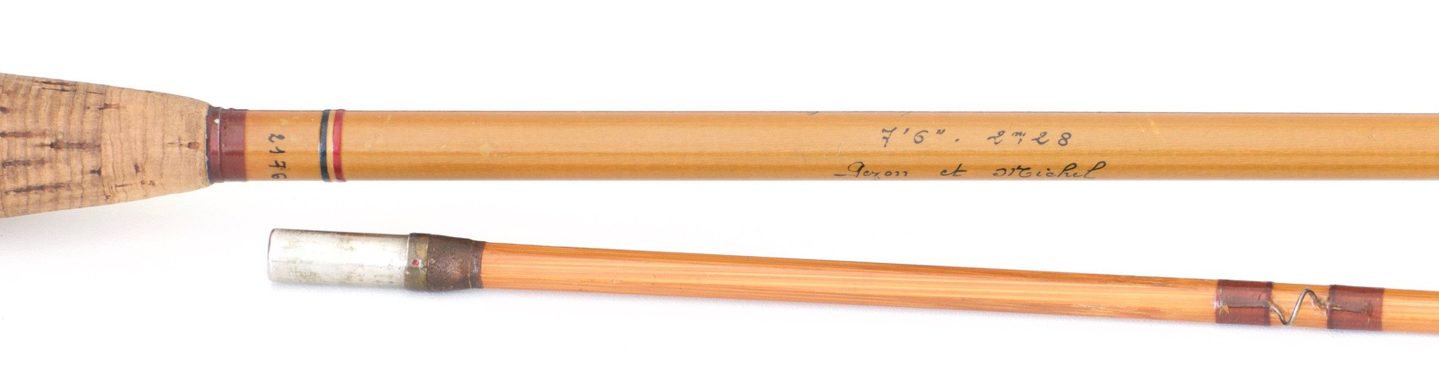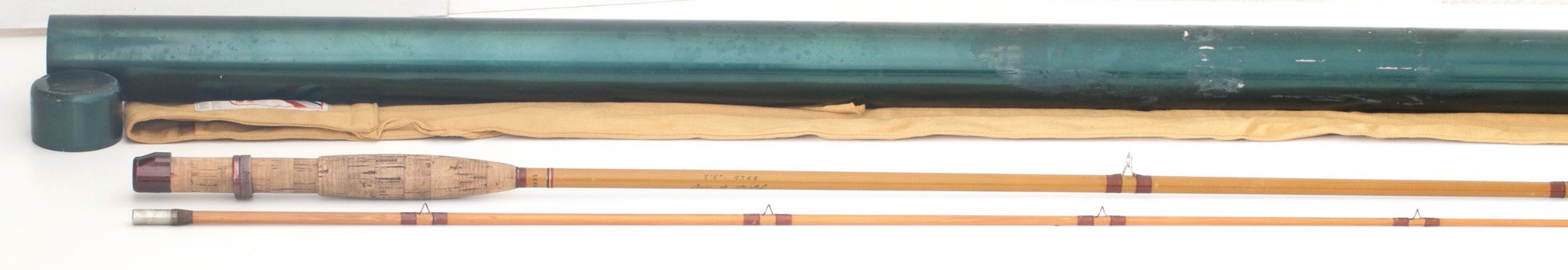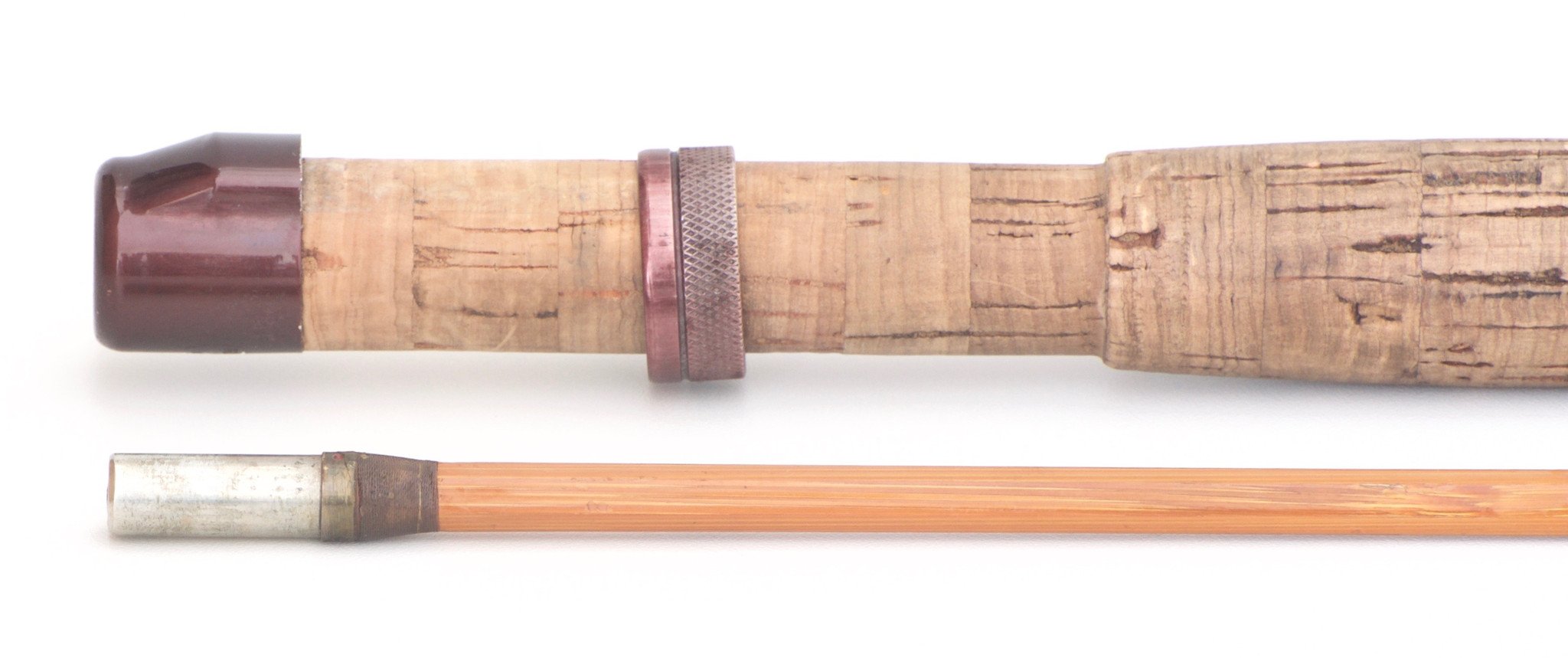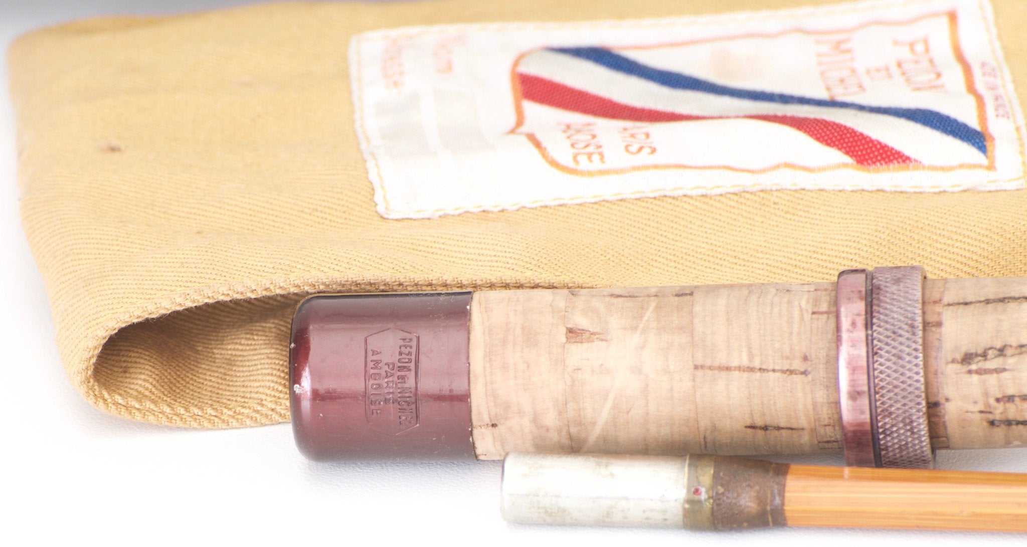 The Variopower was designed by Charles Ritz and intended to be cast using his high speed/high line, "HS/HL" technique. The butt section of the rod is made of fiberglass in a light brown color while the tips are bamboo. Constructed with staggered ferrules, includes the 6 1/2" hexagonal 6-strip bamboo ferrule plug. The tips are numbered 1 and 2 at the ferrule. The wraps are chestnut brown. Red, white, and blue signature wrap, a tribute to France. Bronzed guides. Magenta colored aluminum winding check. Classic cigar style grip 4" in length. Though soiled the grip is free of ridging or hook gouges. Magenta colored aluminum cap and ring reel seat with a cork spacer. Nickel silver ferrules with typical P&M red witness marks. The sections fit together nice and tight as they should. The rod weighs 3.60 oz. The action is swift, on the faster side of medium-fast. The rod feels very light in the hand, thanks to the fiberglass butt section. Despite this, it also balances quite well. The rod is versatile, it has a good deal of backbone but is also capable of more delicate casts. Includes original bag and replacement tube. Truly a unique part of fly fishing history and another notable contribution from Charles Ritz.