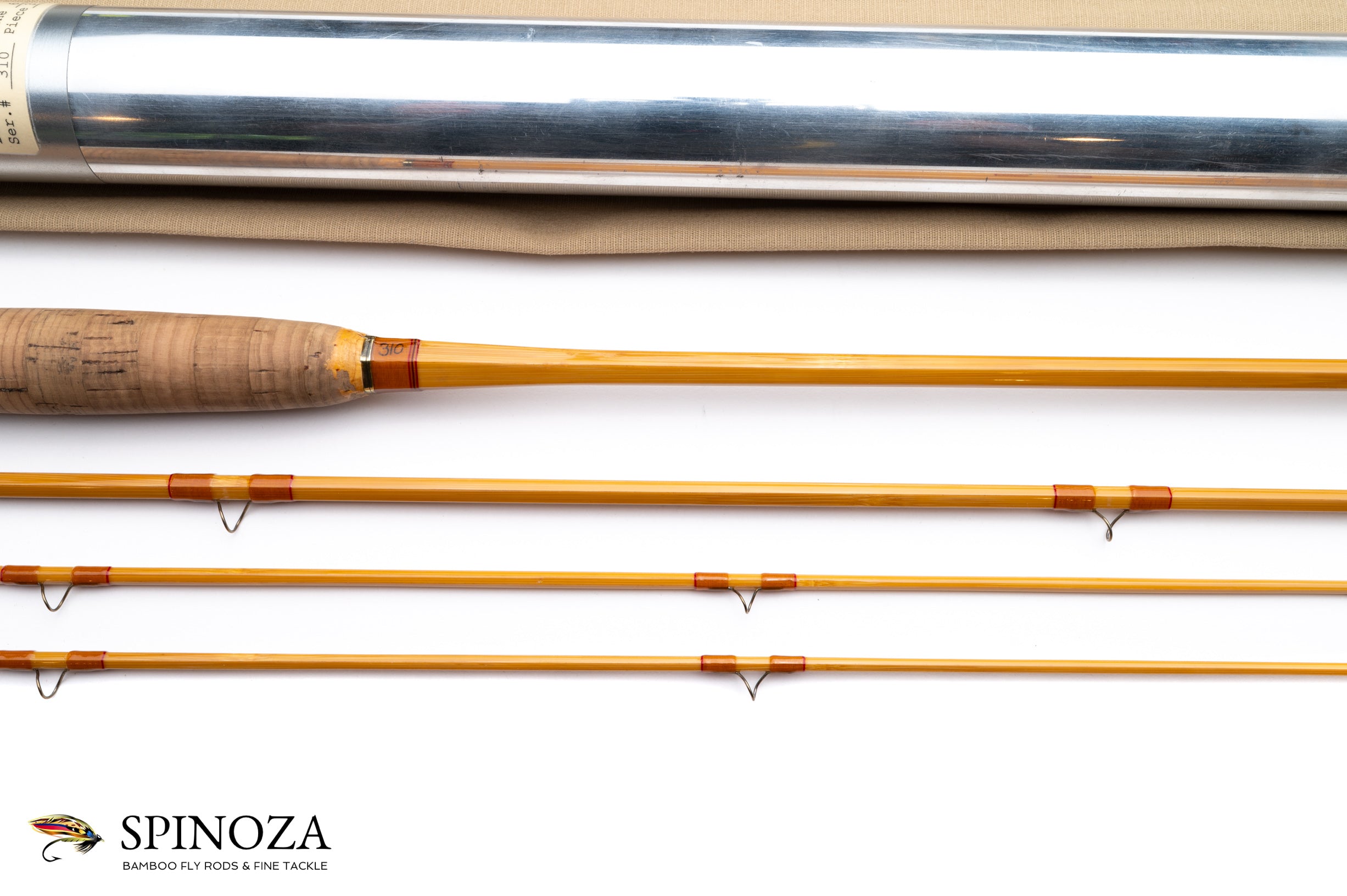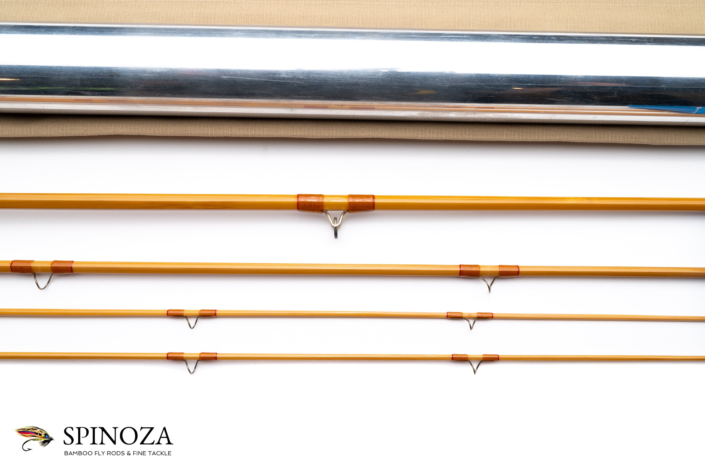 A nice Rick Robbins "Selb's 7'9" model fly rod, 7'9", 3-piece, 2-tip, and built for a #6 line. Serial #310. The rod weighs 4.6 ounces. Medium fast action. Modestly used with some grip soiling and some brassing to the inner part of the snake guides. Blonde cane done with a three up node pattern and a large swell. The rod has an excellent coat of varnish. The main wraps are light brown with red edges. Carbide stripper and snake brand guides and tip tops. The ferrules are polished and in the Maxwell-Marinaro style. The grip is 5" long and shaped to a western profile. The slide band seat is a mortised and varnished quilted maple with a nickel silver rail embedded on the back. The cap and ring are nickel silver and fit a Hardy reel foot to perfection. "Rick Robbins, Maker" is engraved on the bottom of the cap. The rod comes with a brown cloth bag and a polished aluminum tube with brass hardware with Rick's data sticker affixed to it.