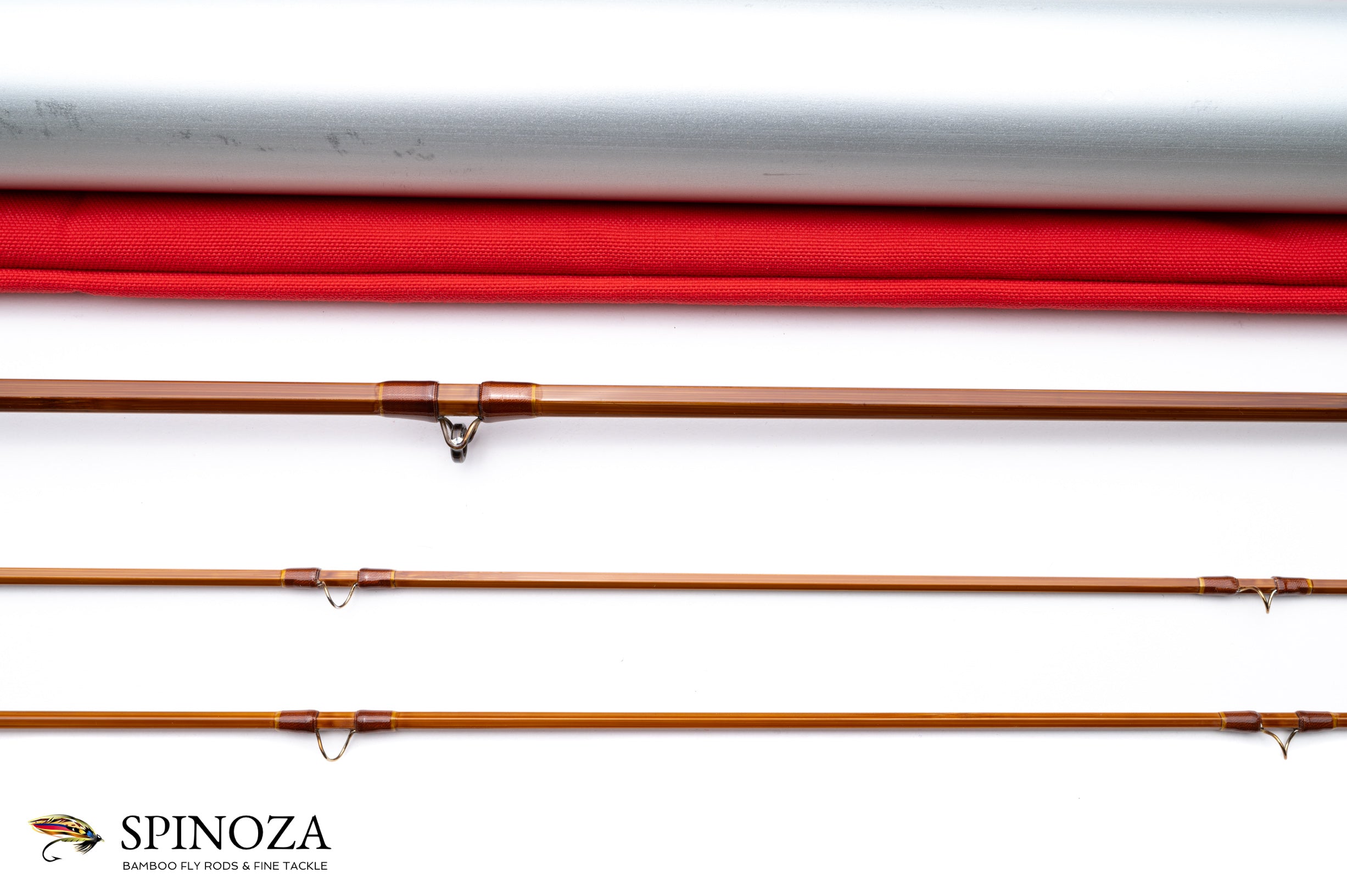 An RK Bolt bamboo fly rod, 8'6", 2-piece, 2-tip and built for a #5 line. Serial #8601. The rod weighs 4 ounces. Mint, unfished condition with the plastic still on the grip. This rod was made from Howells blanks, which Robert offers from a very limited supply. Medium fast action. The rod sections are stained a chestnut color and done in a two-opposed node pattern. Brown main wraps with yellow edges and a band of red at the keeper. Carbide stripper and chrome snake guides. The ferrules are fully overwrapped and the female welt has a tiny “R.K. Bolt” stamp. The female sports a knurled brass and cork ferrule plug. Excellent varnish. The cork grip is 6" long and turned to a western profile with a hidden pocket cap for the uplock screwlock seat. The screwlock is made by Robert and is stamped “R.K. Bolt, Maker” with a nicely radiused end cap. The rod shaft is semi-hollow built and the screwlock barrel has a roller die stamp depicting a hollow-built rod section. The rod packs into a red cloth bag and an aluminum tube with the Robert's data sticker affixed to it.